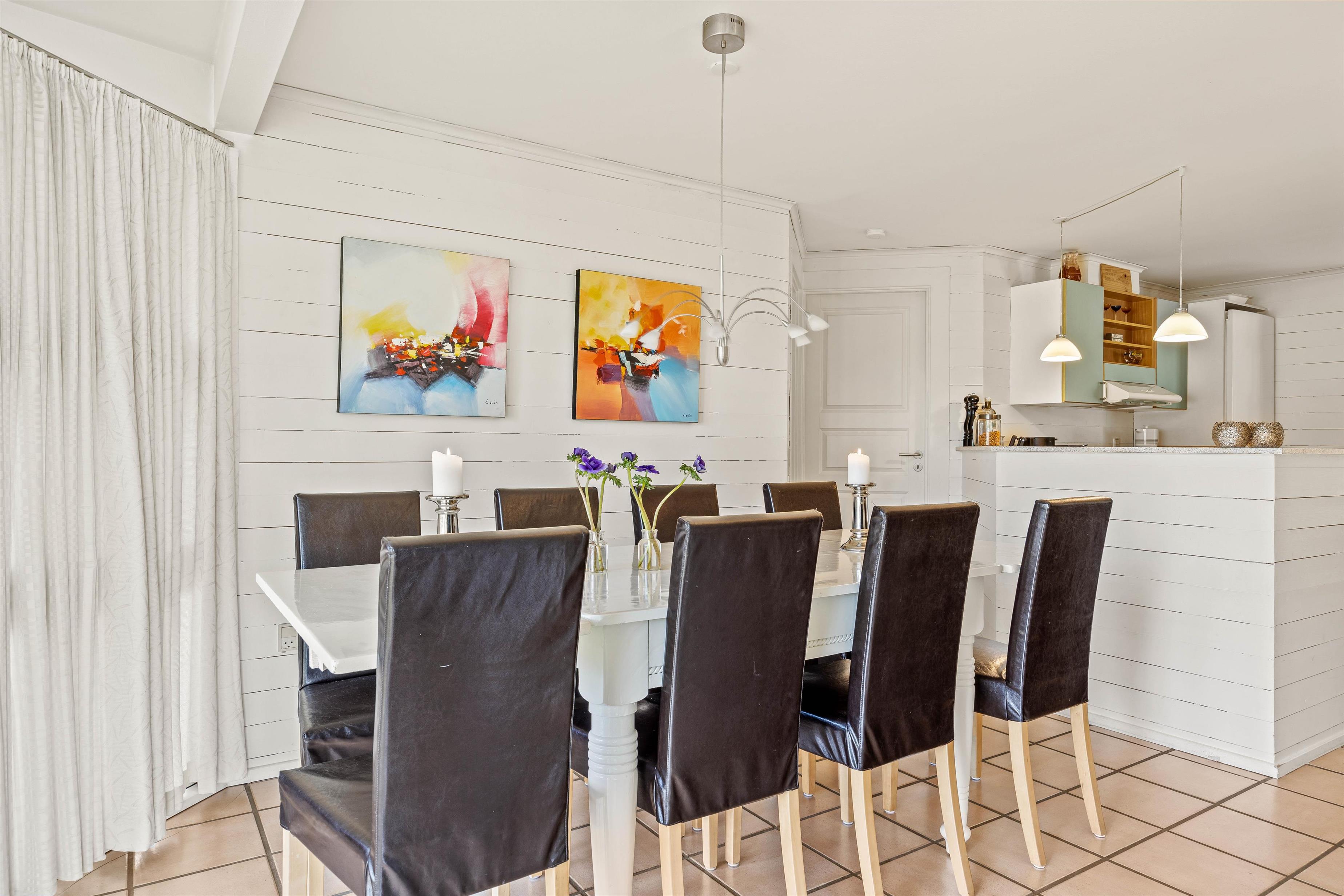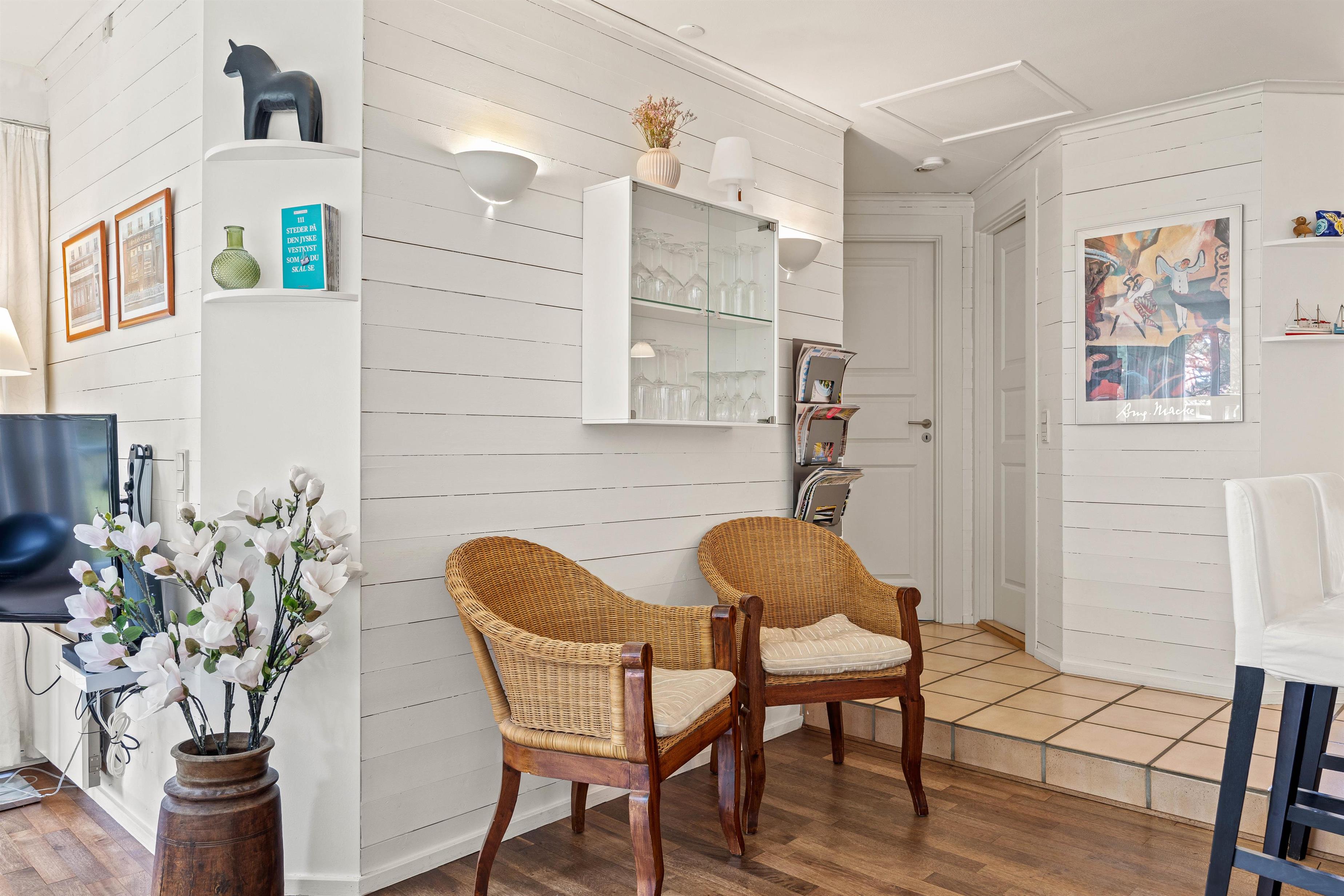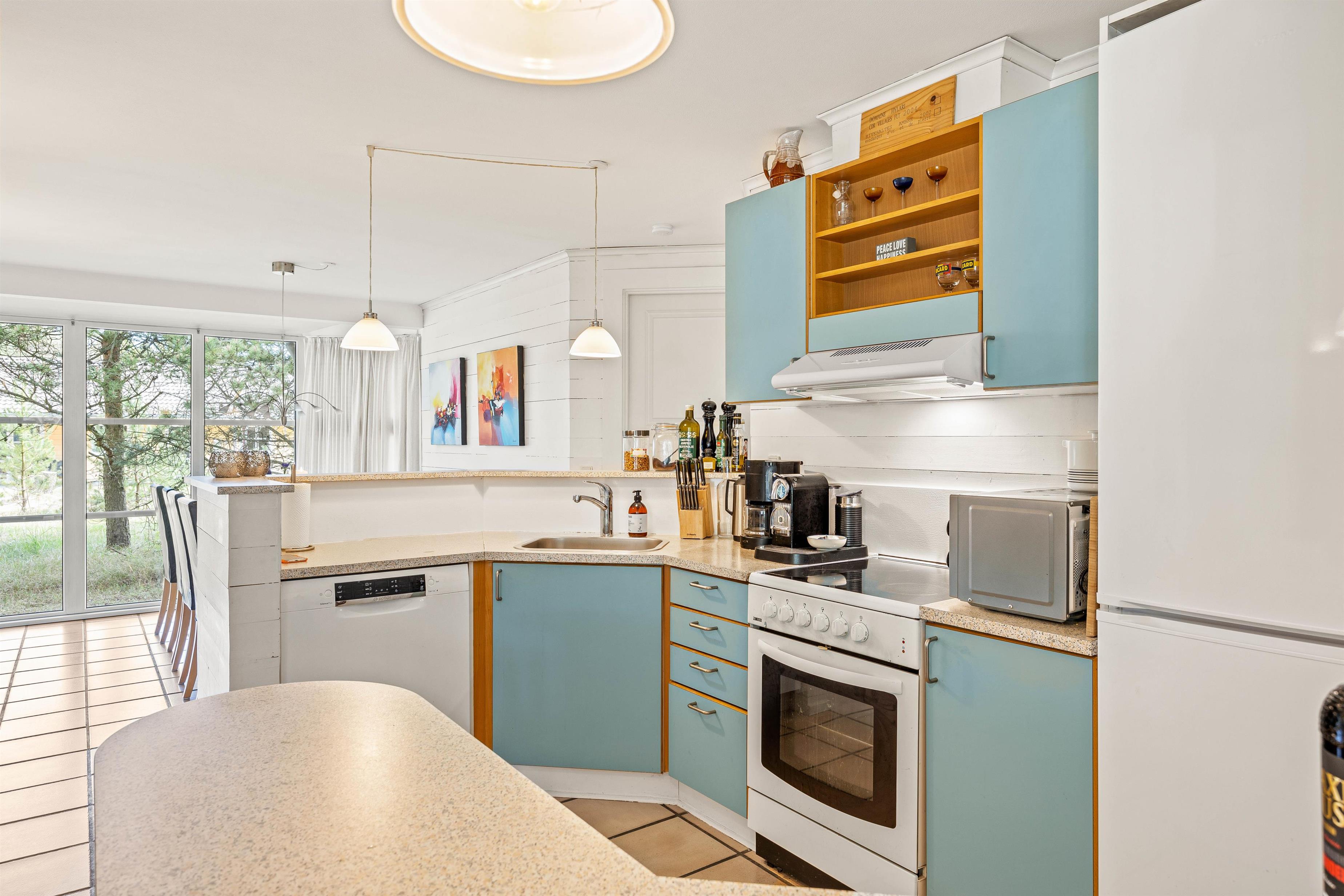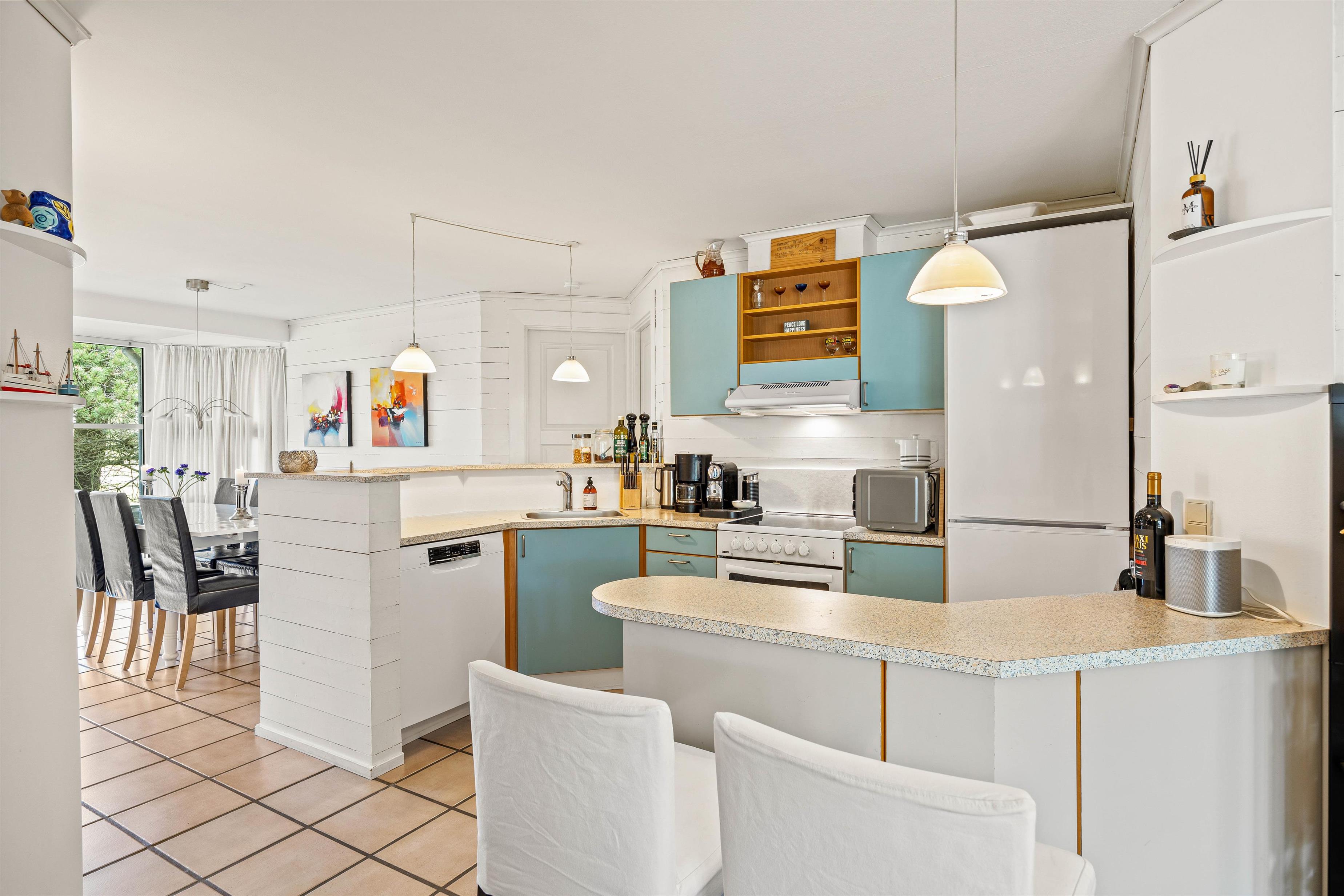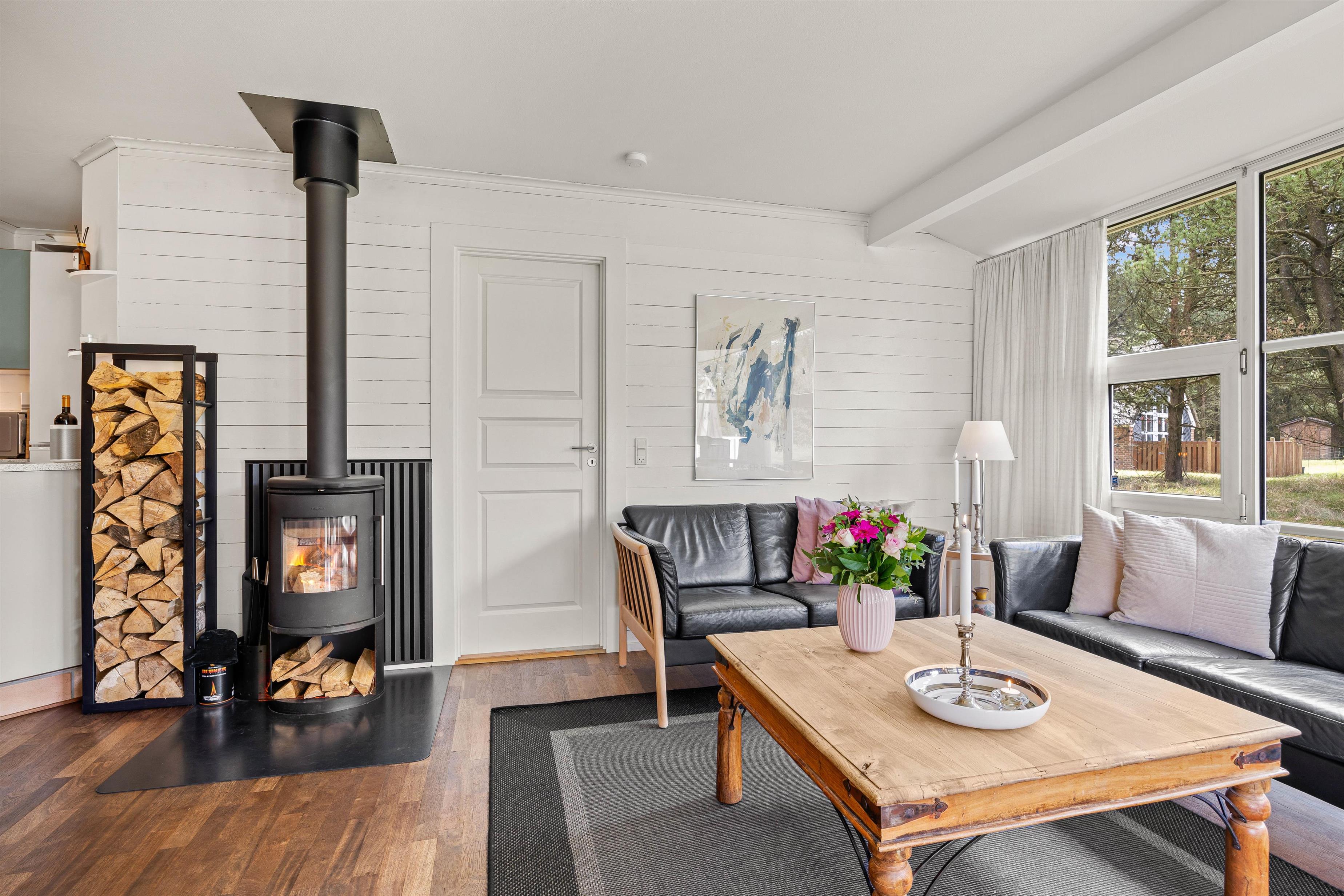 Feriehuset er indrettet med charme – bemærk, at der ingen spildplads er på de 111 m2, og alligevel er her alt, hvad man behøver på en dejlig ferie. Det åbne køkken ligger midt i sommerhuset med spisepladser på den ene side og opholdsstuen på den anden. I køkkenet er alt, hvad I behøver for at tilberede lækre måltider, især lystfiskere vil blive glade for den separate fryser på 80 l. Arranger for eksempel en fiskeaften med et køligt glas hvidvin til. Det er altid hyggeligt at samles omkring et bord – og ved spisebordet sidder man komfortabelt til måltiderne eller til et brætspil. I opholdsstuen med gulvvarme kan I slappe af foran den knitrende ild i brændeovnen, se TV sammen eller læse en god bog og nyde feriestemningen.