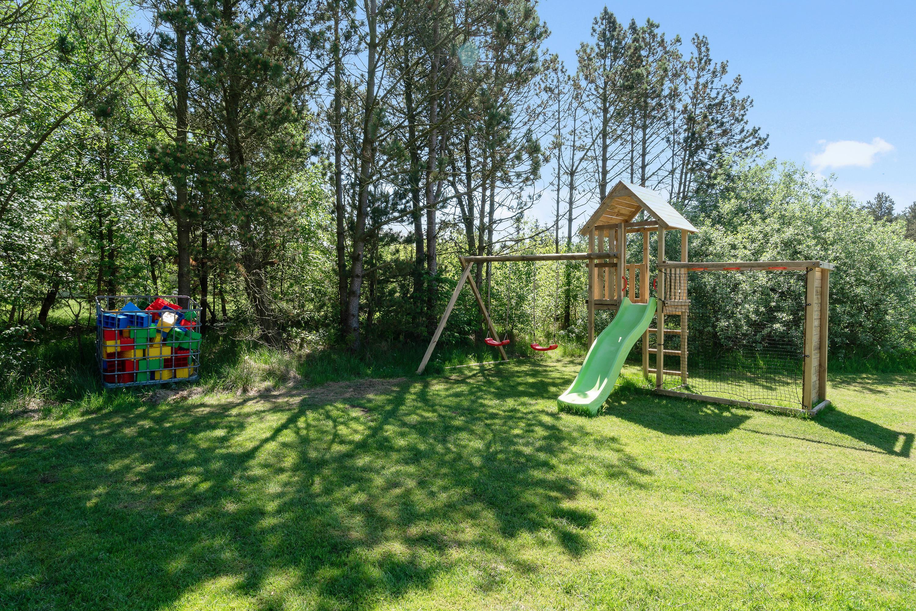 Familievenligt udendørs område med legeplads - trampolin, gynger, beachvolleybane
