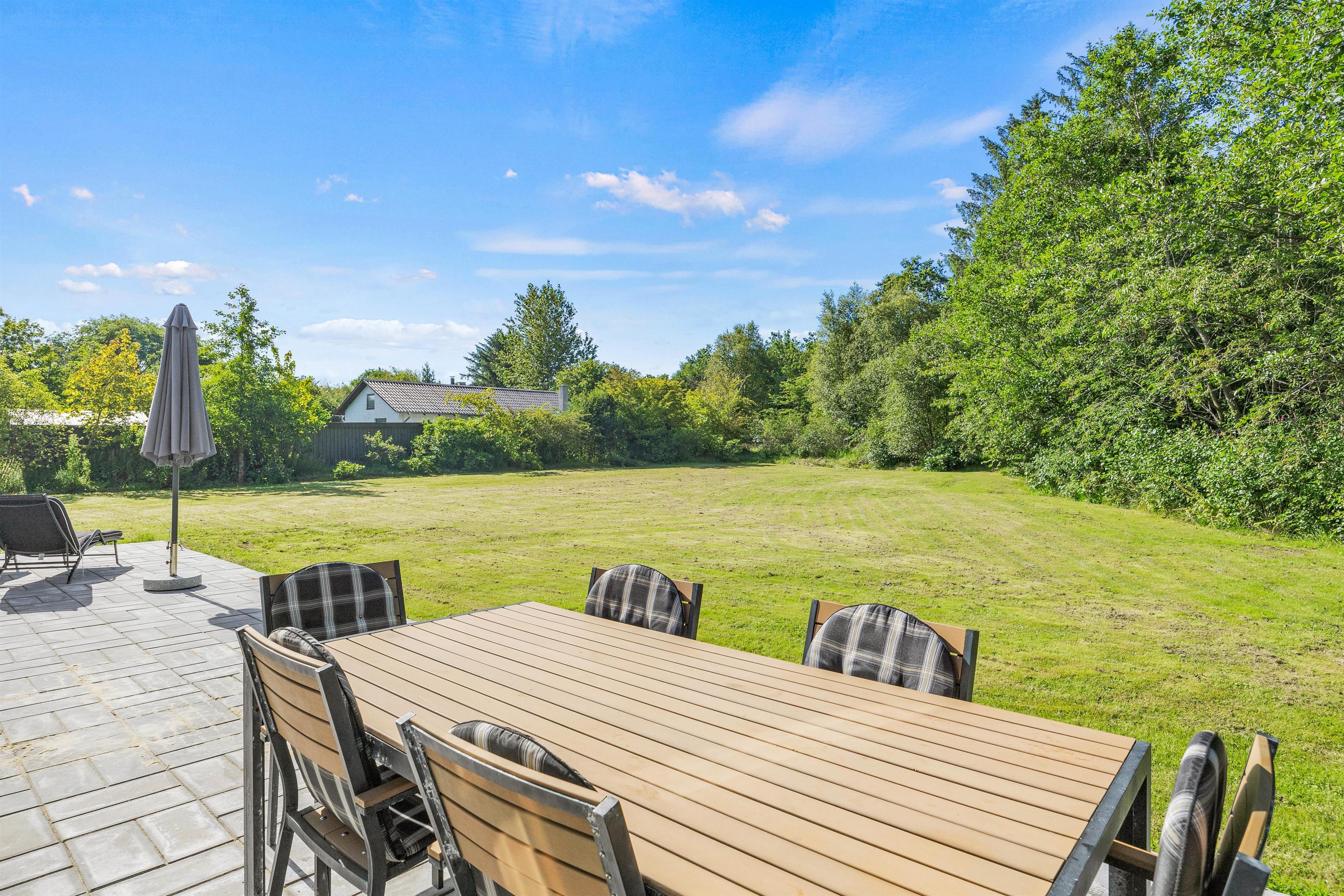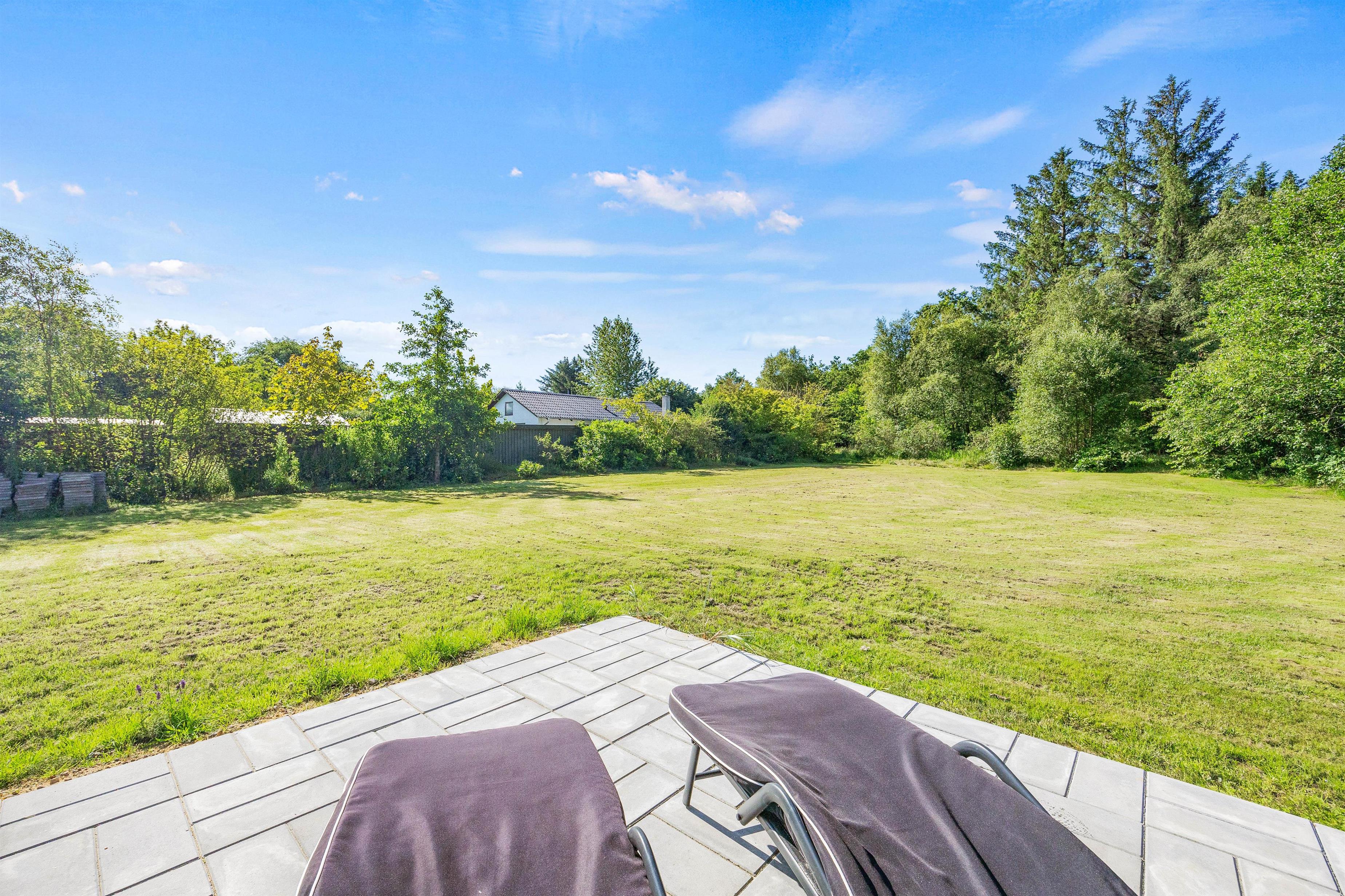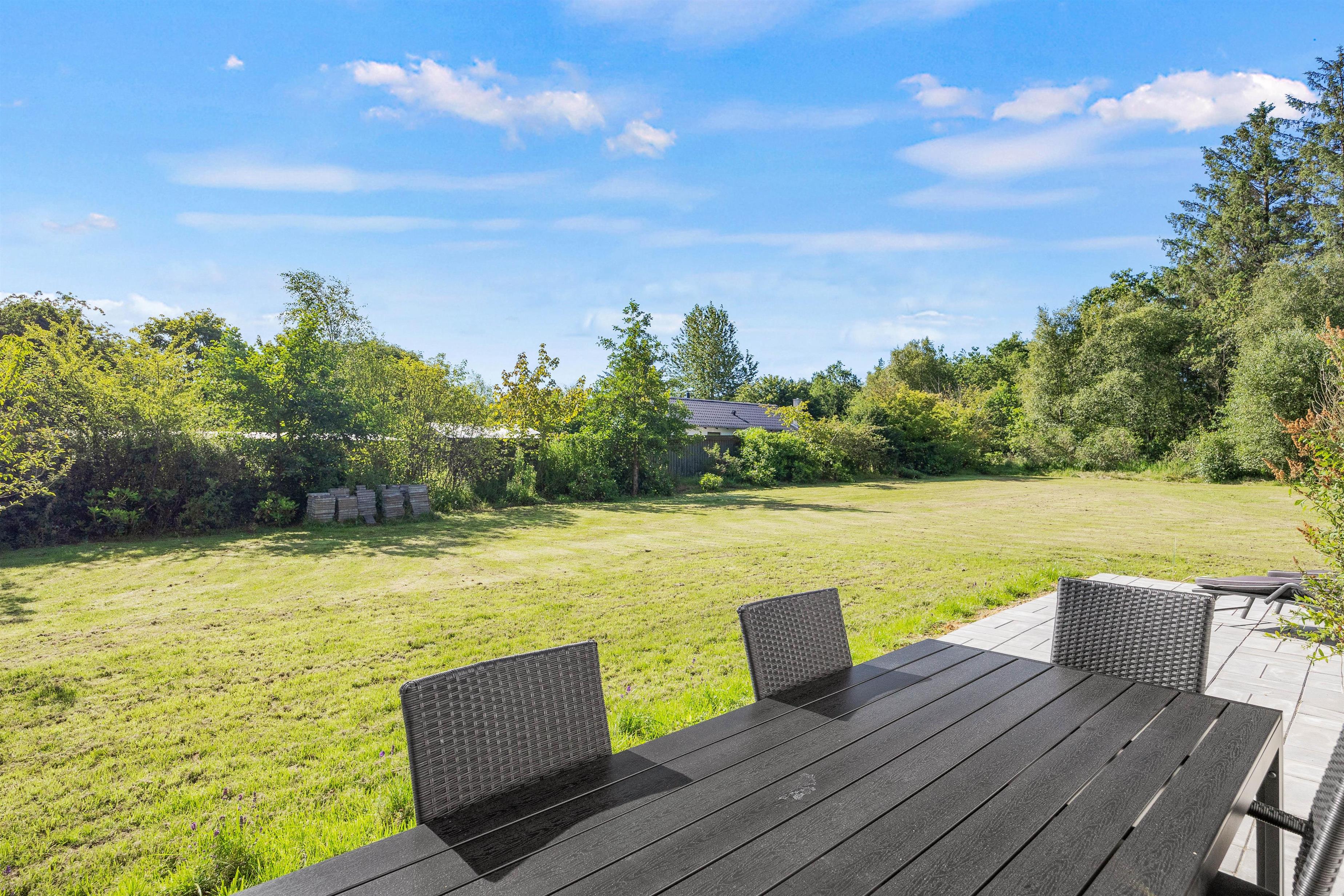 Fra køkkenet kan I træde direkte ud på den åbne terrasse, hvor både havemøbler og grill venter. Her kan I nyde en dejlig aften med mad under åben himmel, mens I tager den storslåede natur ind. Sommerhuset ligger på en stor, dejlig grund på 1.200 kvadratmeter, hvilket giver rigeligt med plads til udendørs aktiviteter og afslapning. Grunden er hovedsageligt græsplæne, hvilket gør den ideel til leg og spil for både børn og voksne.