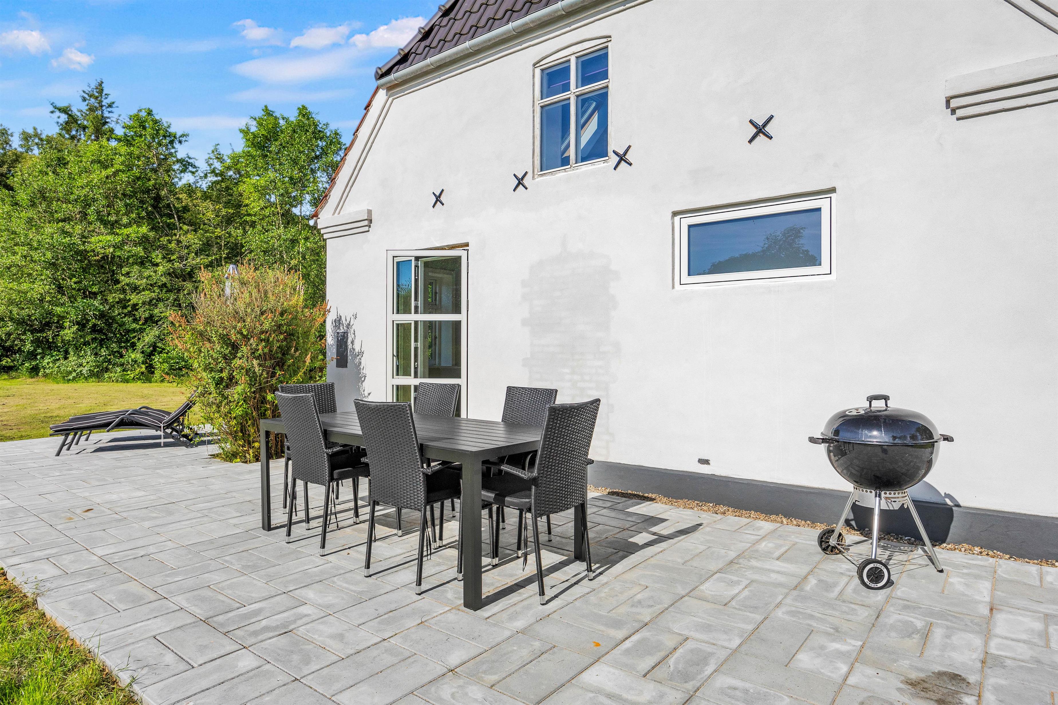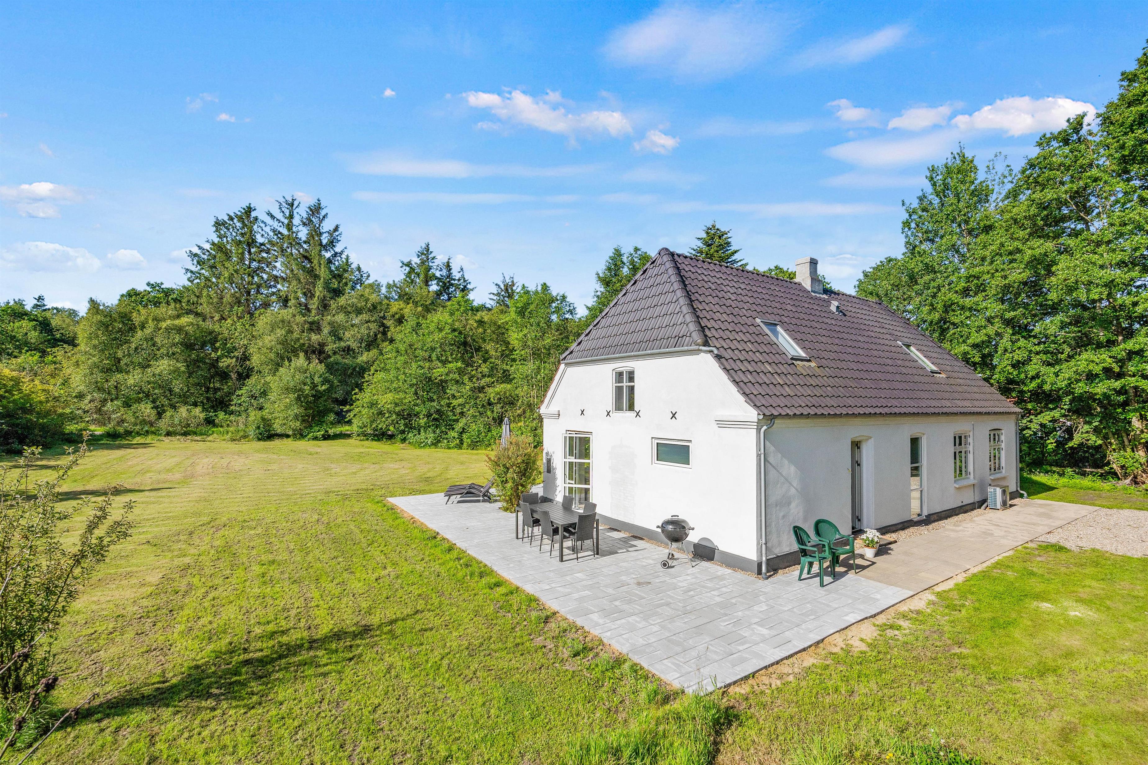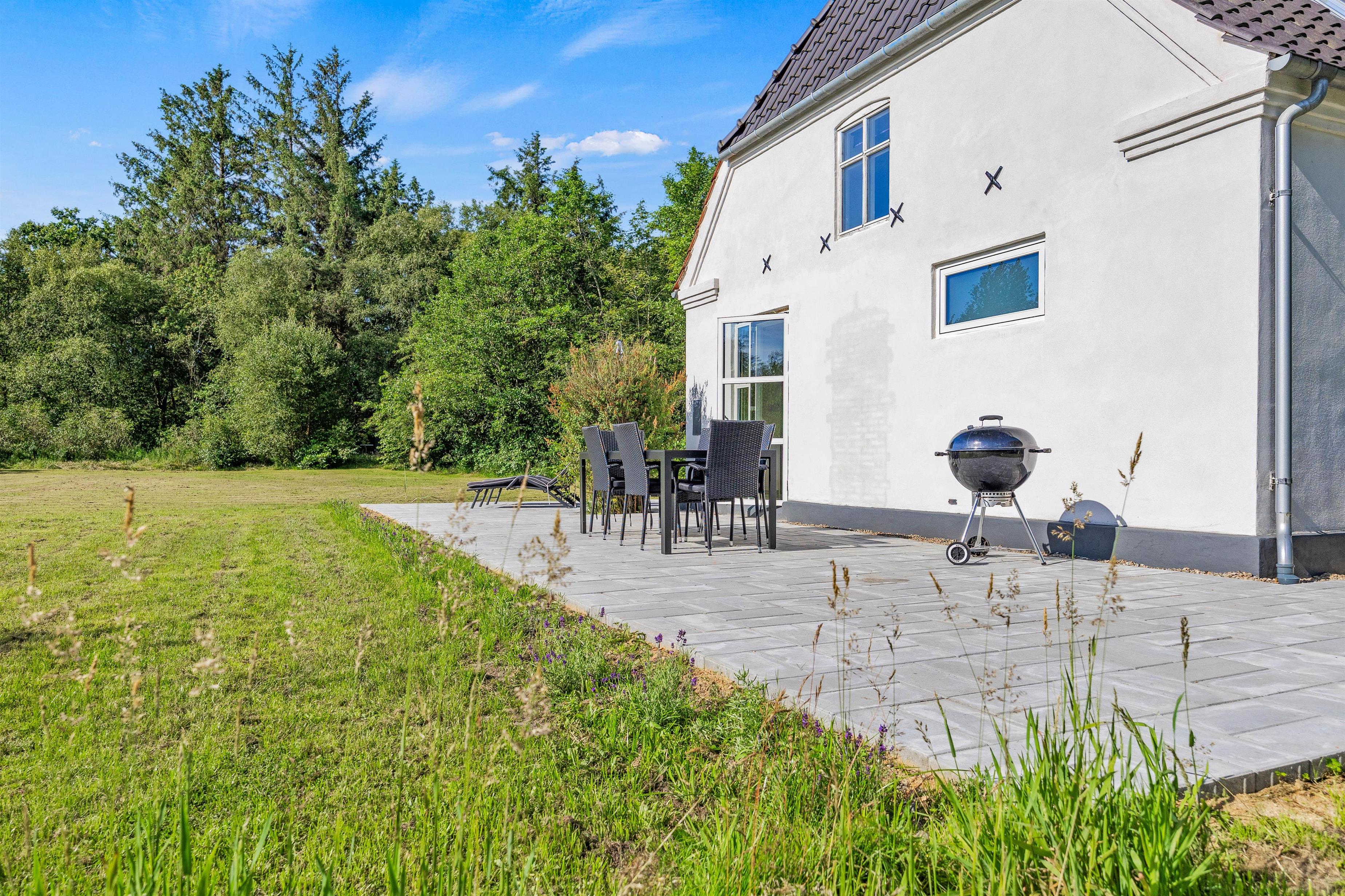 Fra køkkenet kan I træde direkte ud på den åbne terrasse, hvor både havemøbler og grill venter. Her kan I nyde en dejlig aften med mad under åben himmel, mens I tager den storslåede natur ind. Sommerhuset ligger på en stor, dejlig grund på 1.200 kvadratmeter, hvilket giver rigeligt med plads til udendørs aktiviteter og afslapning. Grunden er hovedsageligt græsplæne, hvilket gør den ideel til leg og spil for både børn og voksne.