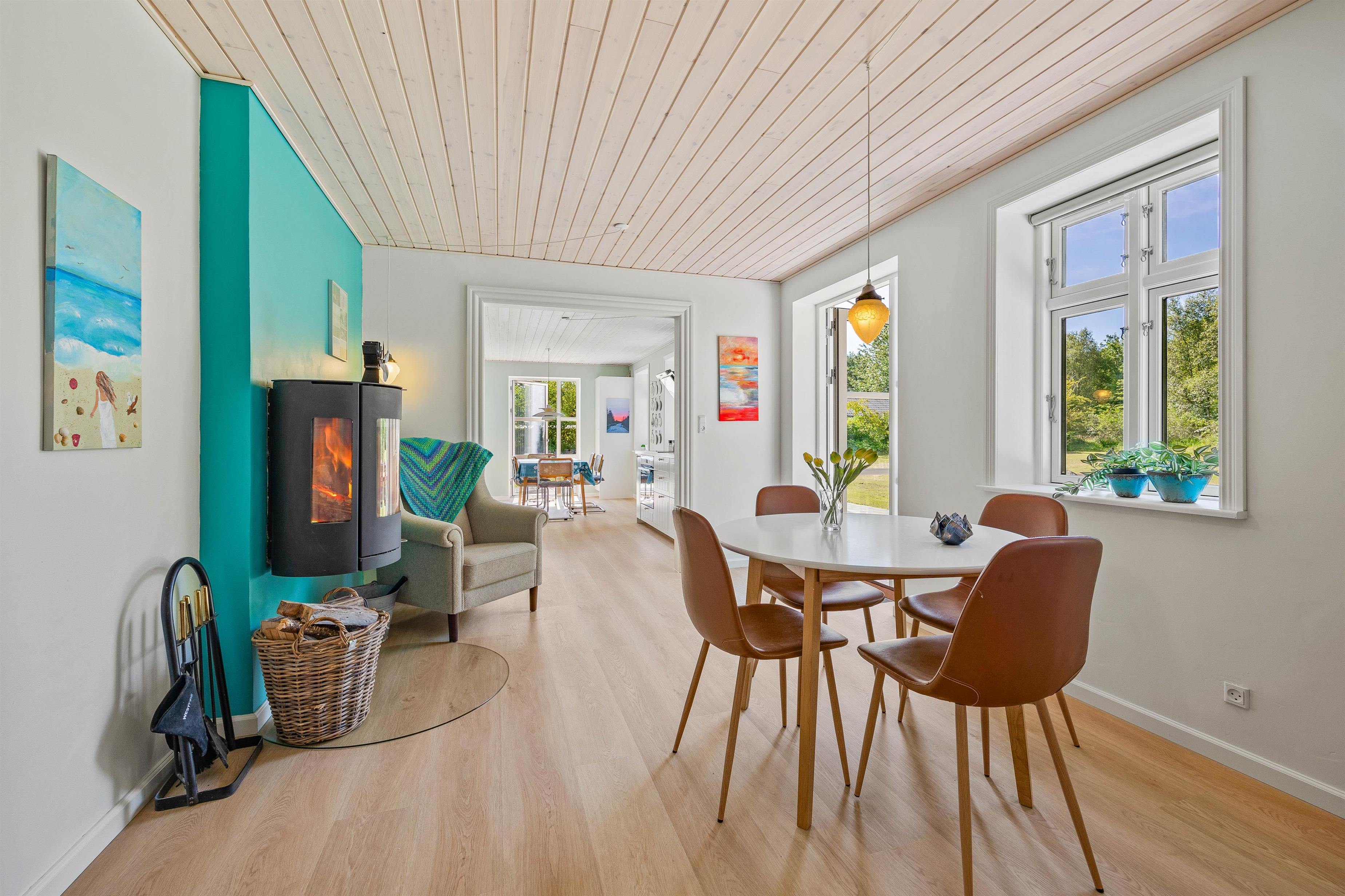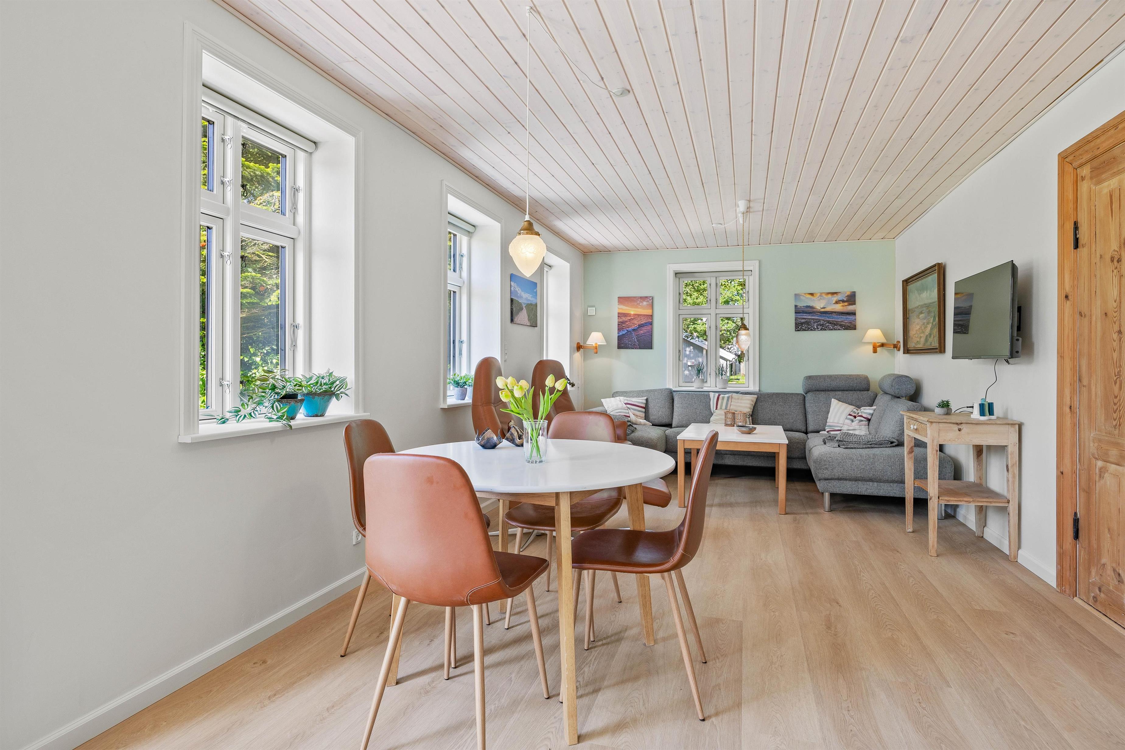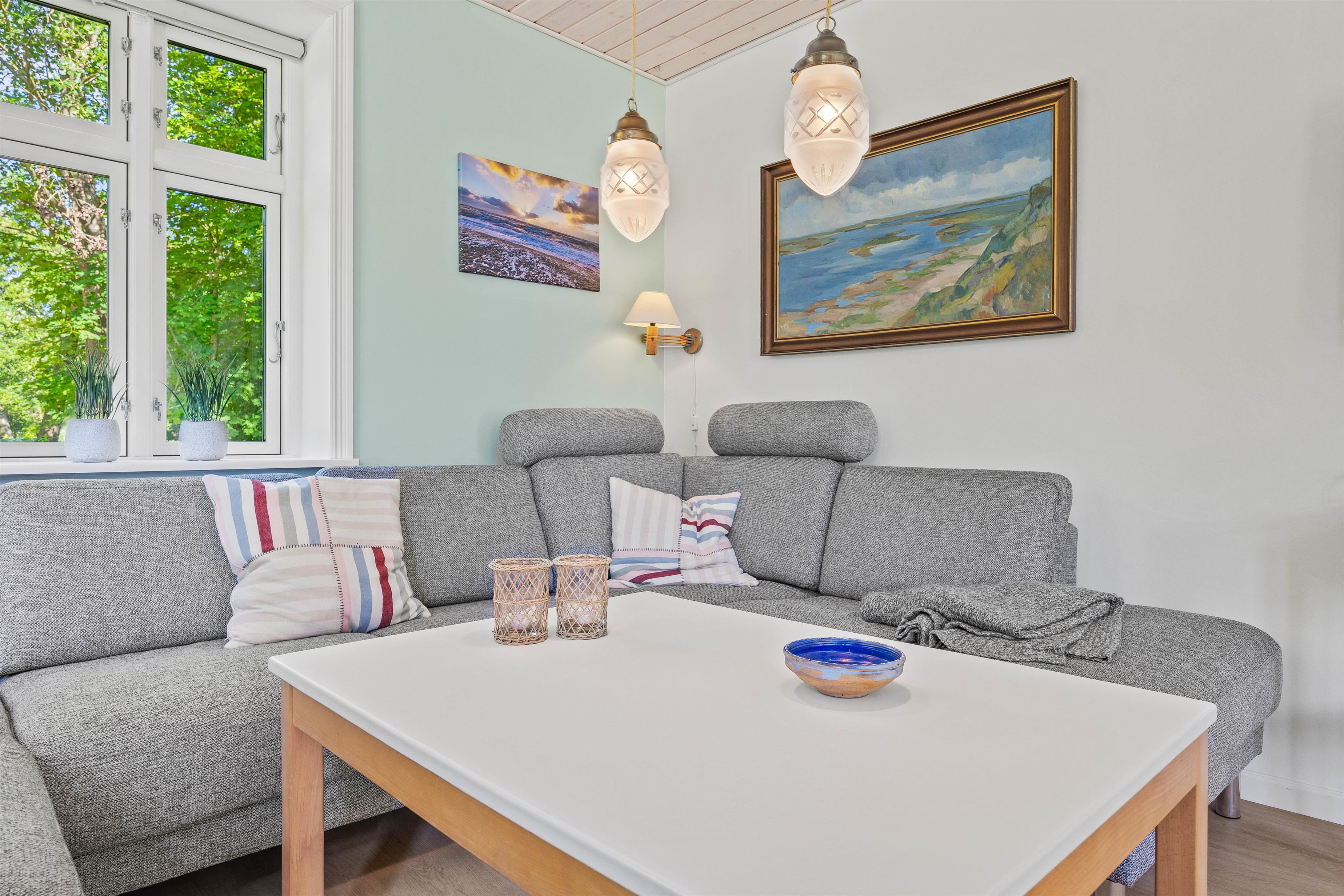Stuen er udstyret med en komfortabel sofagruppe, hvor I kan slappe af efter en oplevelsesrig dag. Her kan hele familien samles omkring aftenens kortspil eller se en god film sammen på sommerhusets Chromecast. Brændeovnen danner et naturligt samlingspunkt, hvor I kan nyde hyggelige aftener med varme fra flammerne.
