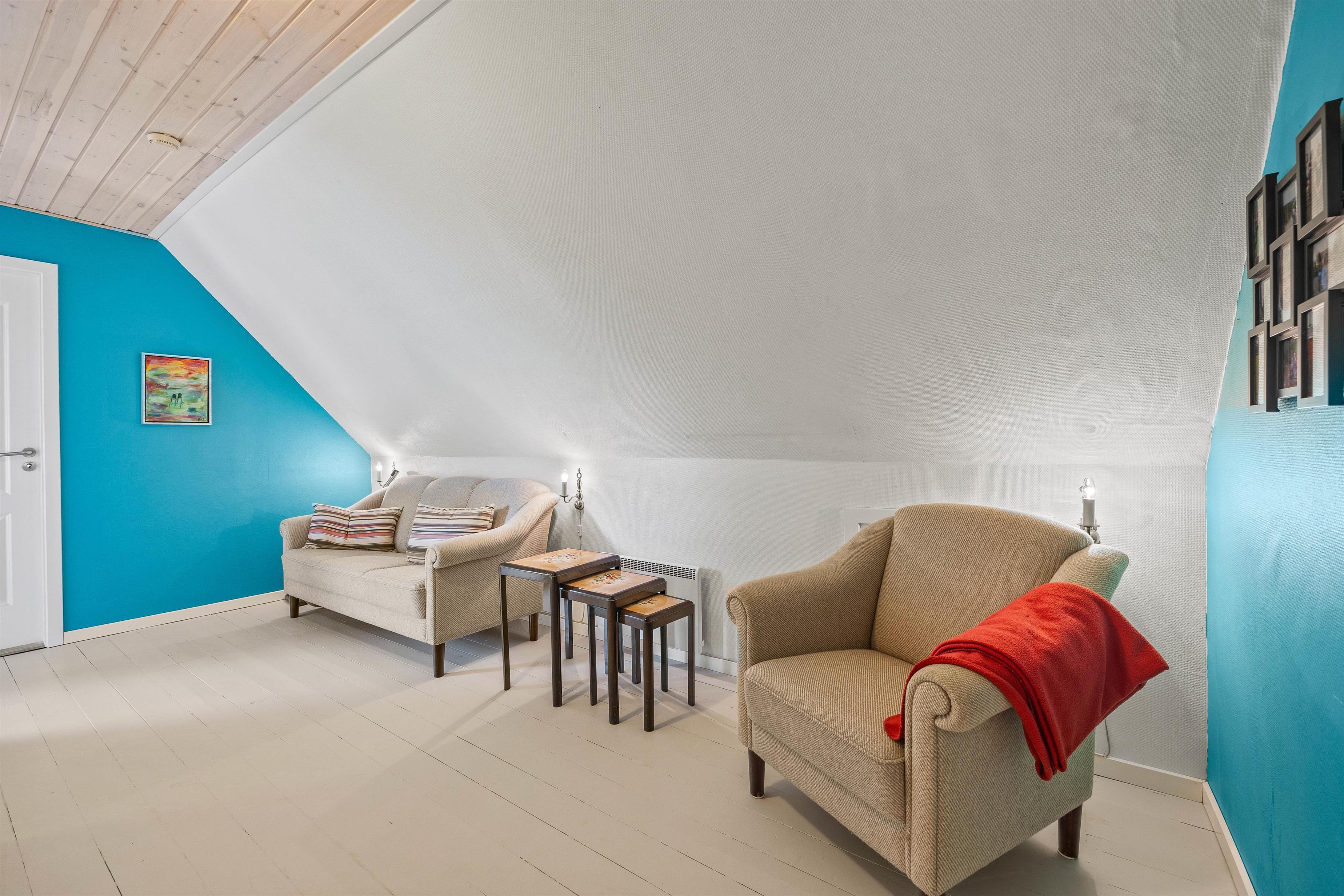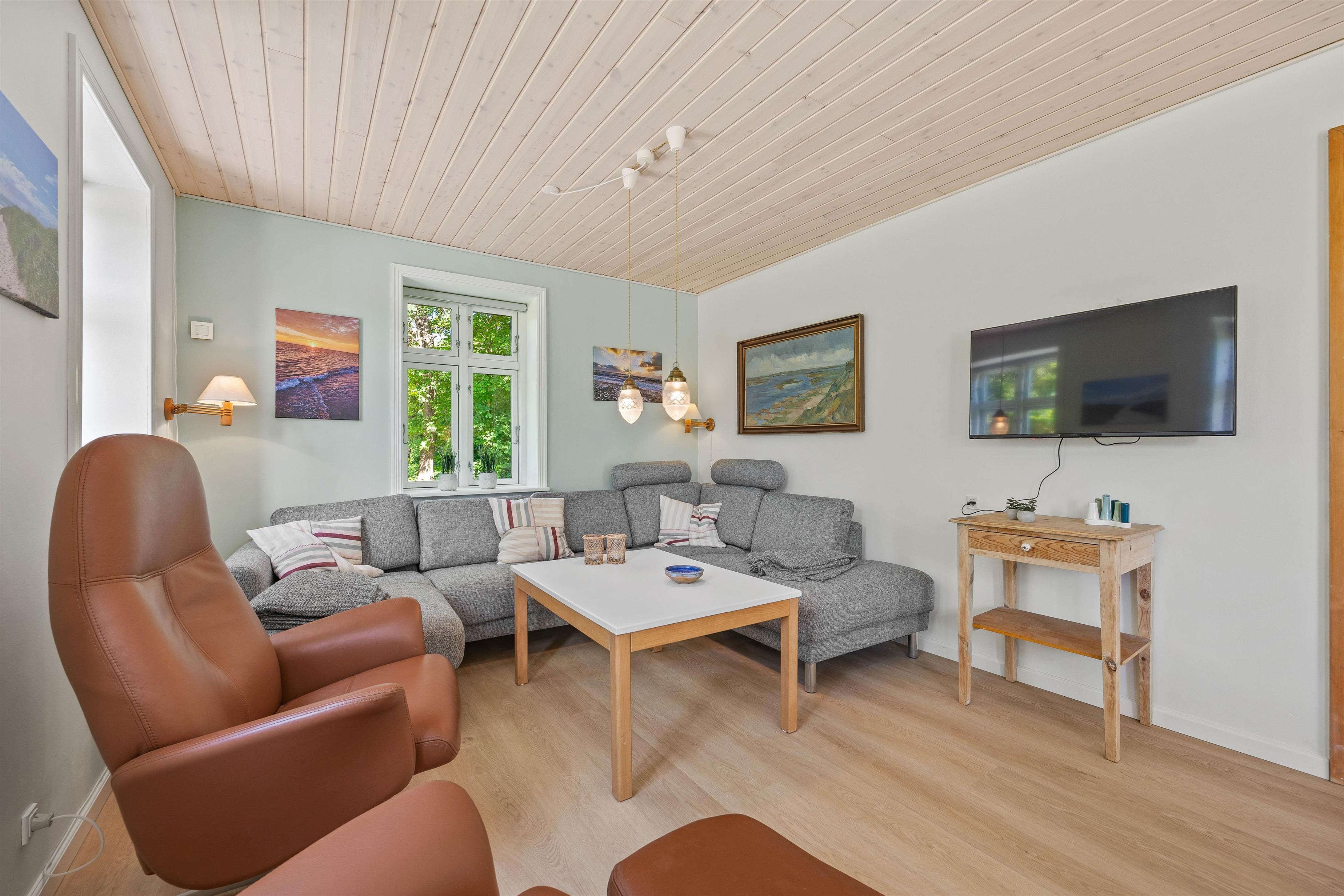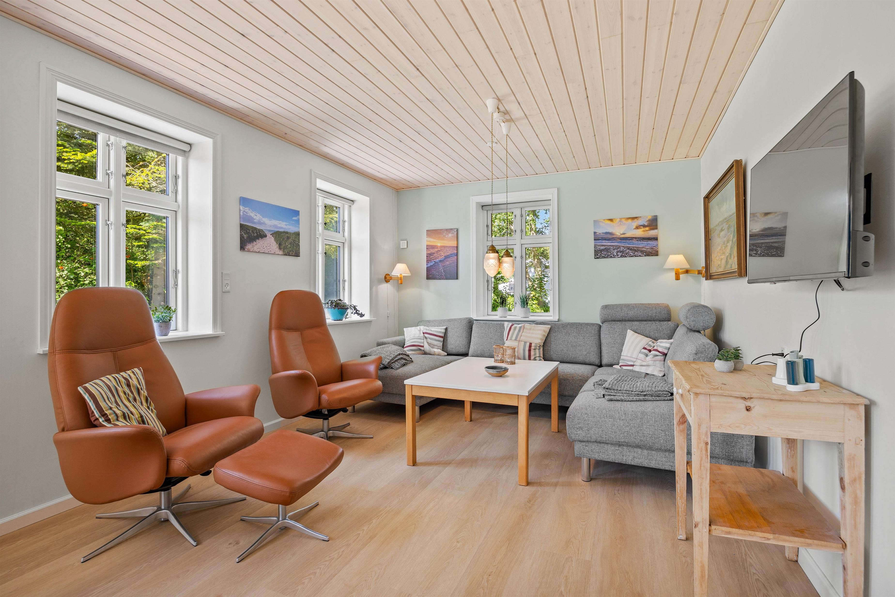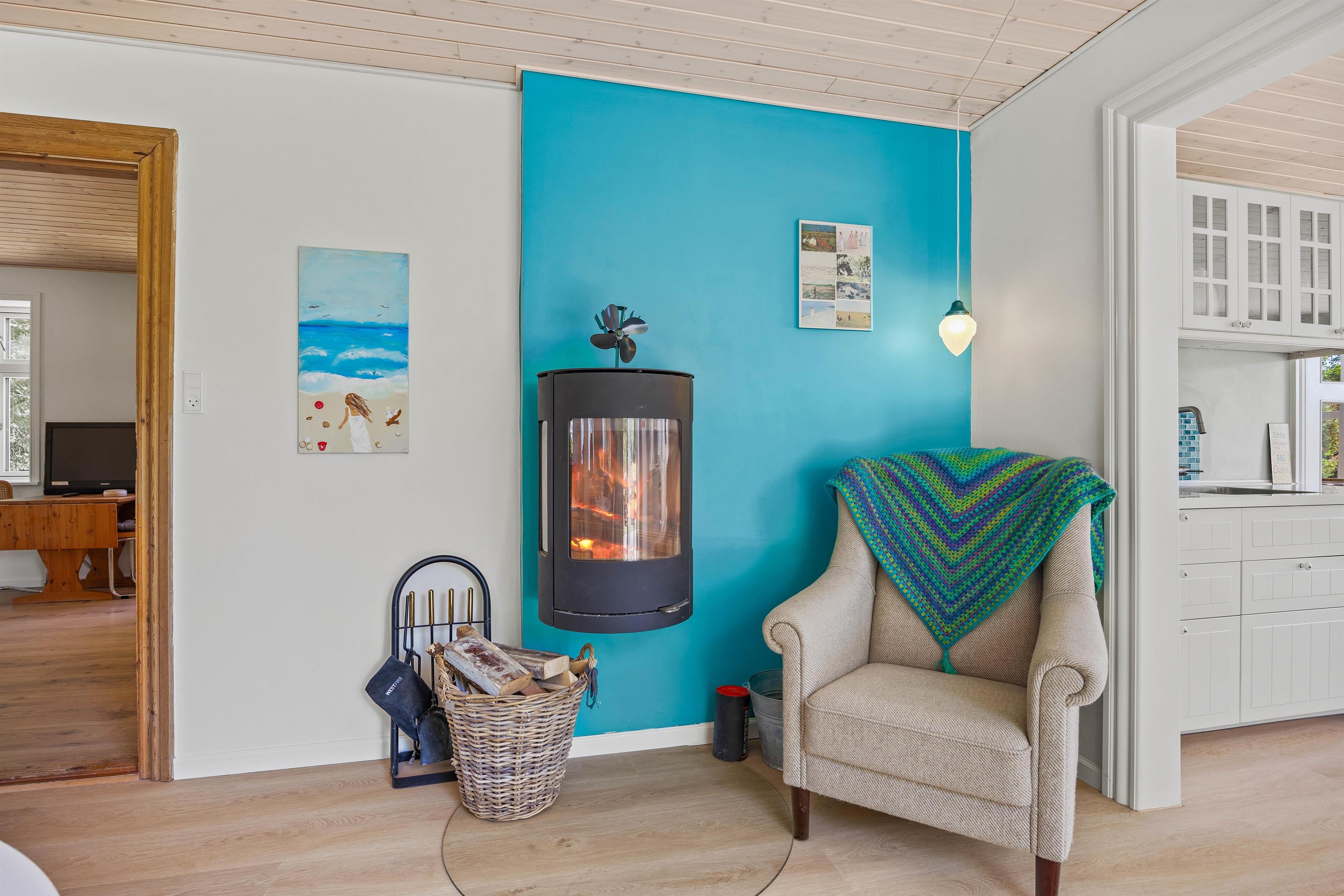 Stuen er udstyret med en komfortabel sofagruppe, hvor I kan slappe af efter en oplevelsesrig dag. Her kan hele familien samles omkring aftenens kortspil eller se en god film sammen på sommerhusets Chromecast. Brændeovnen danner et naturligt samlingspunkt, hvor I kan nyde hyggelige aftener med varme fra flammerne.