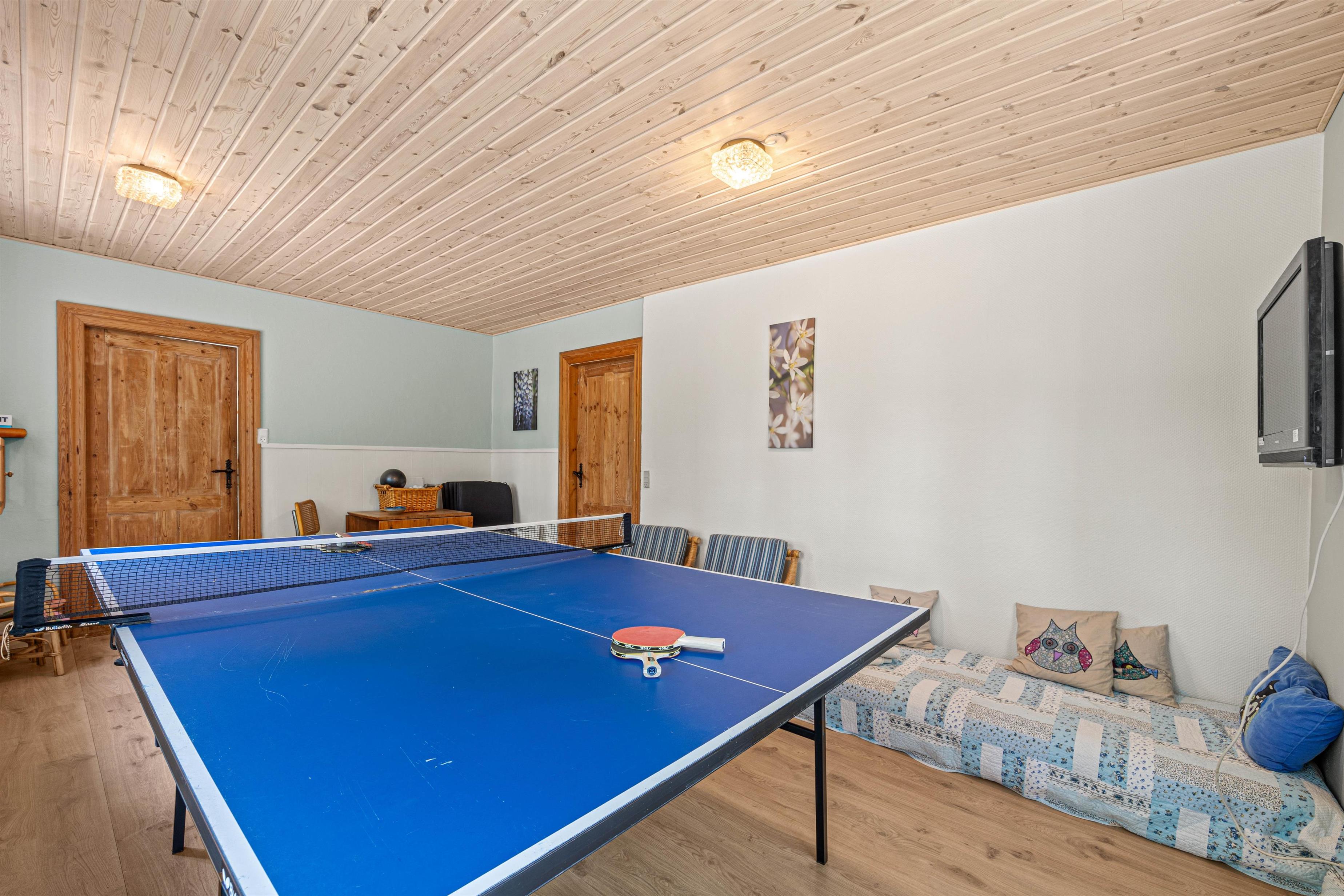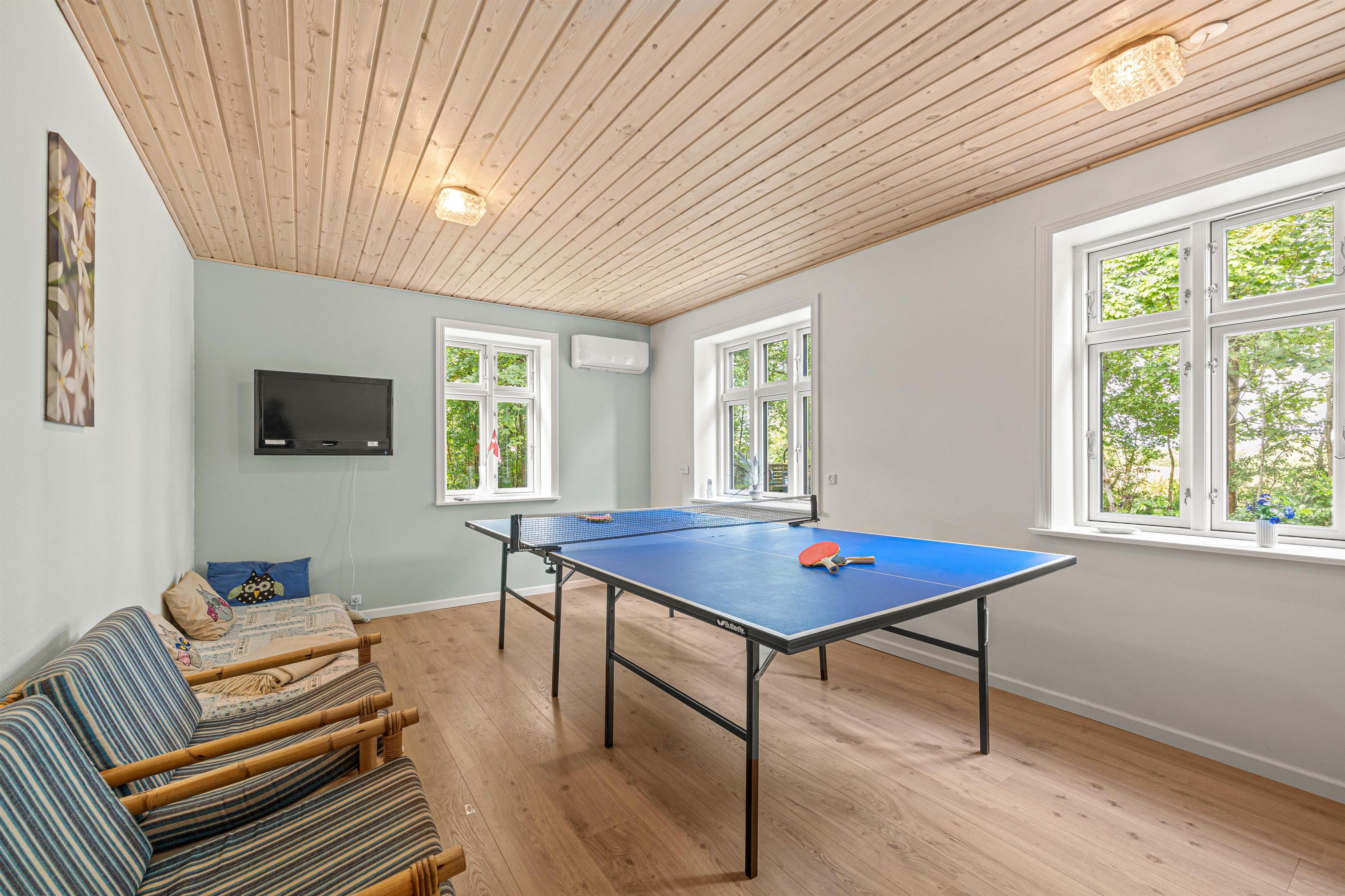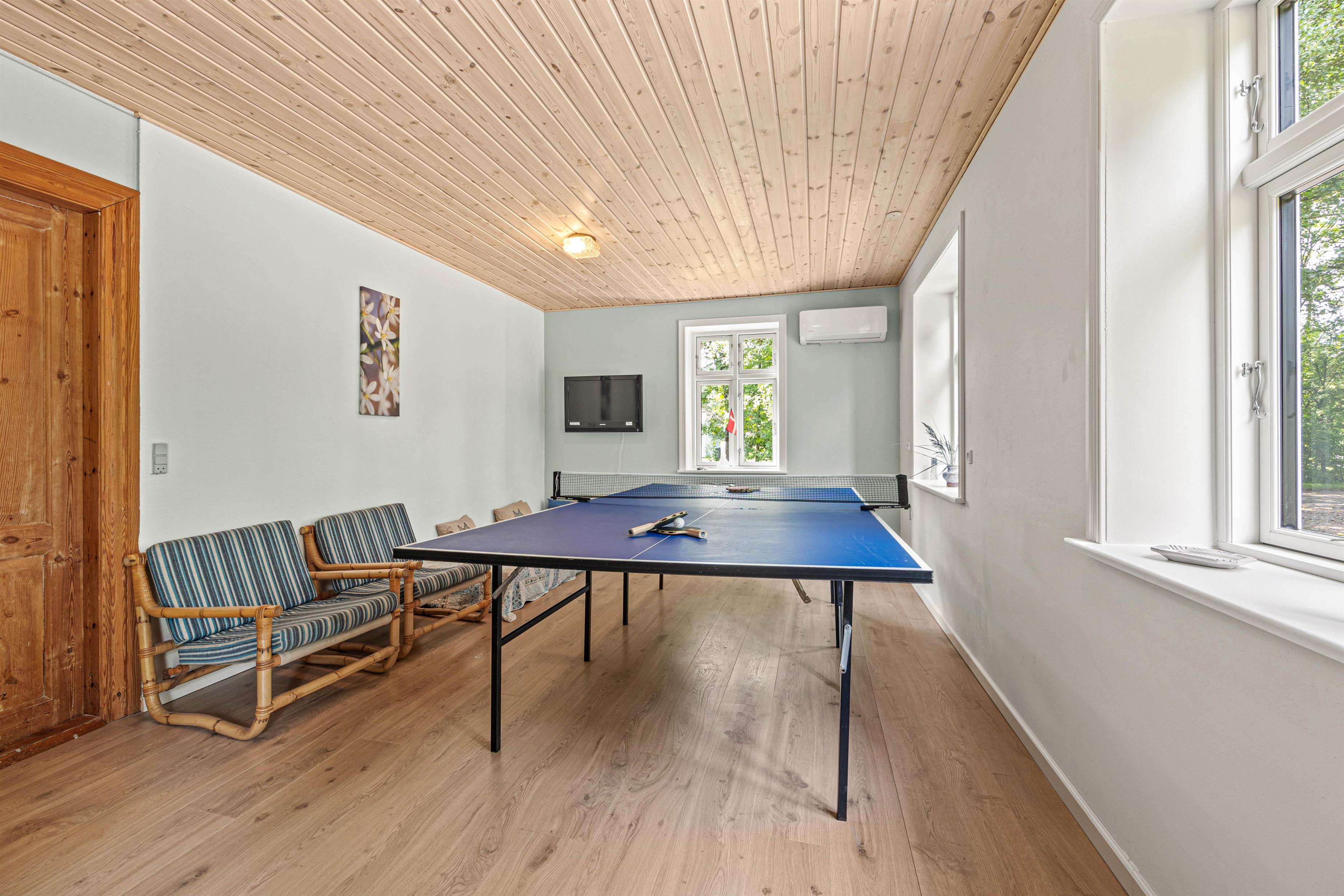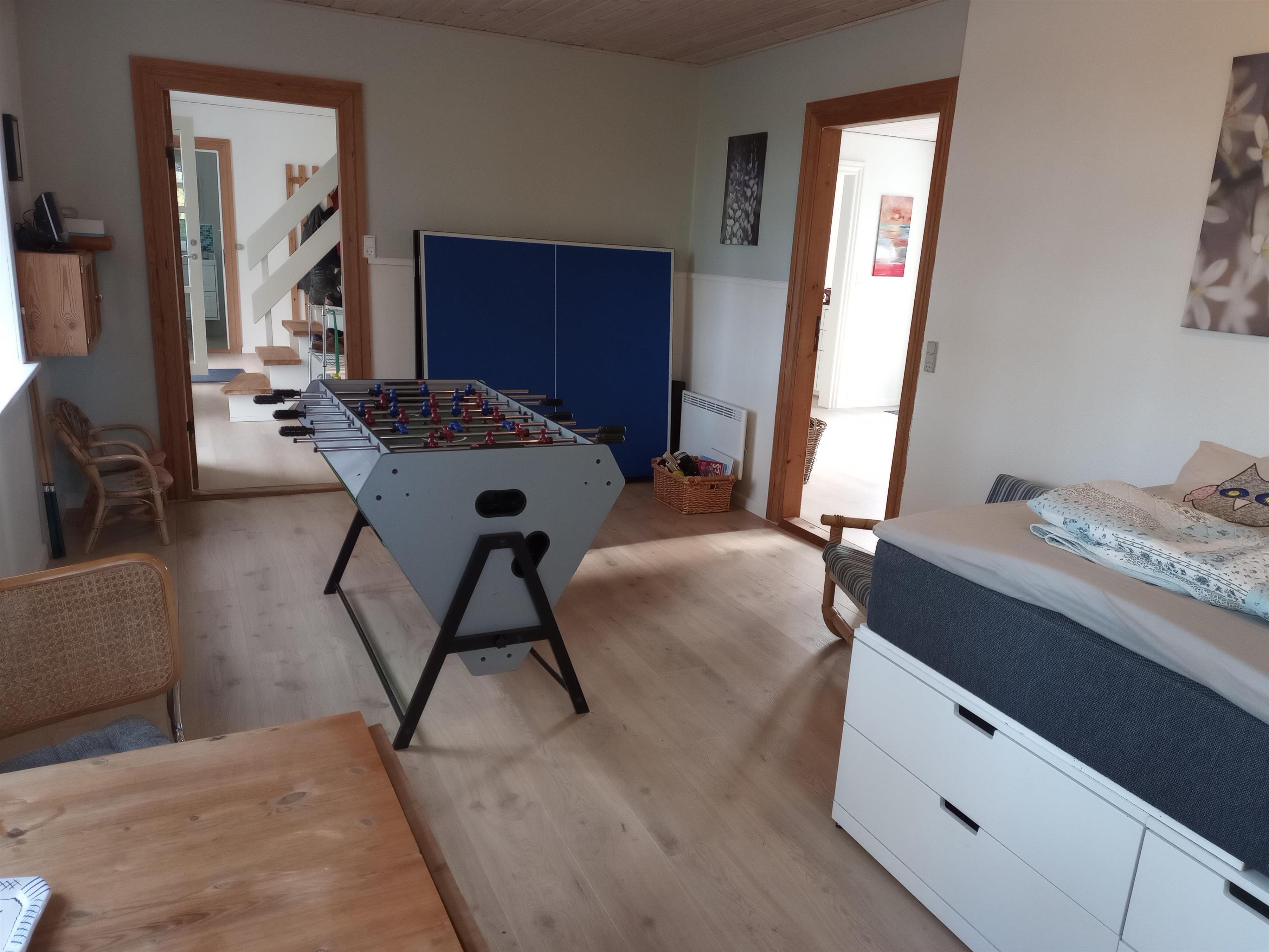 Sommerhuset har et aktivitetsrum, der er et hit blandt både børn og voksne. Her kan I nyde et multi-spilbord med muligheder for bordfodbold, airhockey, mini billard og mini bordtennis. Et separat bordtennisbord er også tilgængeligt for dem, der elsker en god kamp. Derudover findes der et tegnebord, som inviterer alle til kreative udfoldelser. Dette rum sikrer hyggelige stunder og sjov for hele familien.