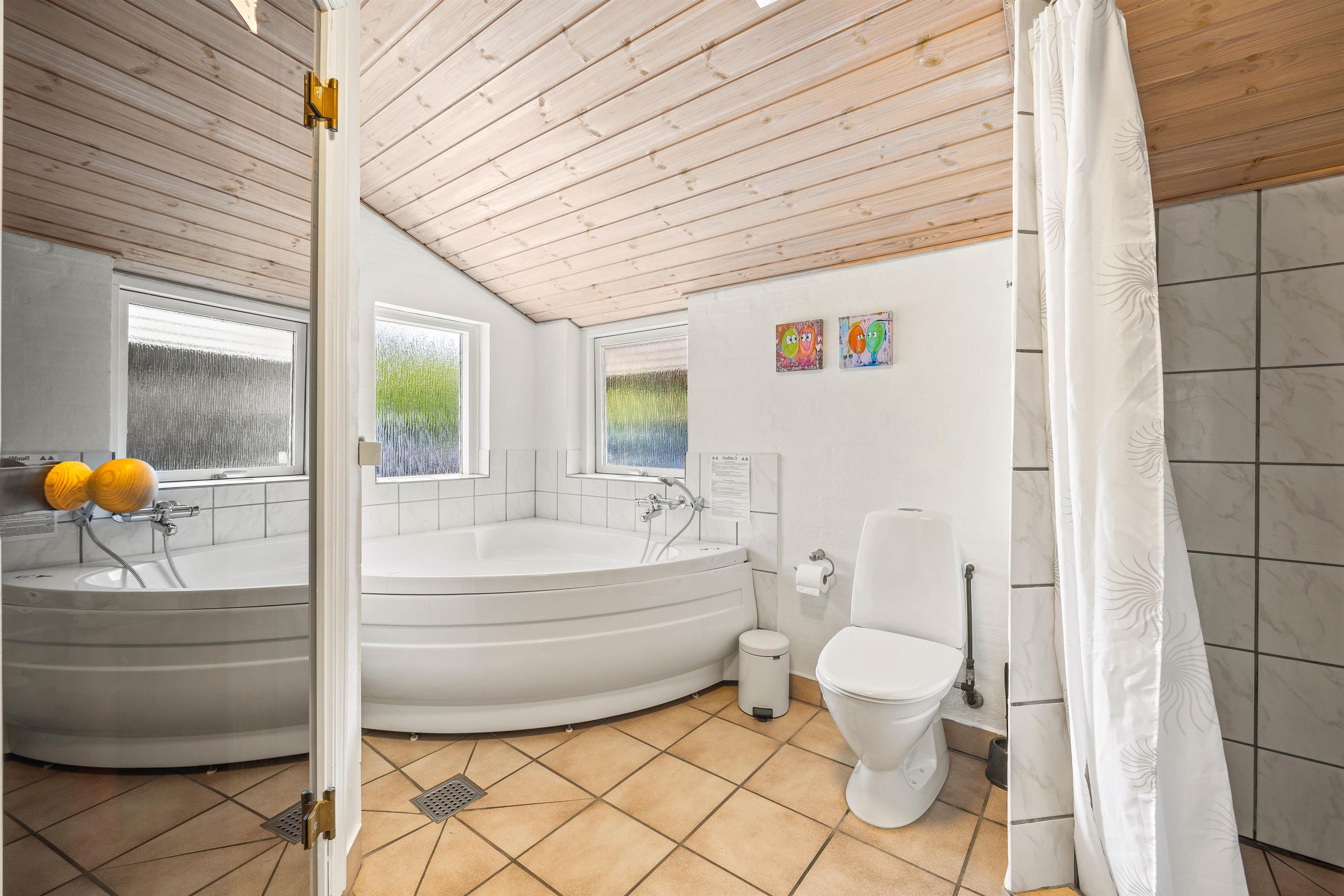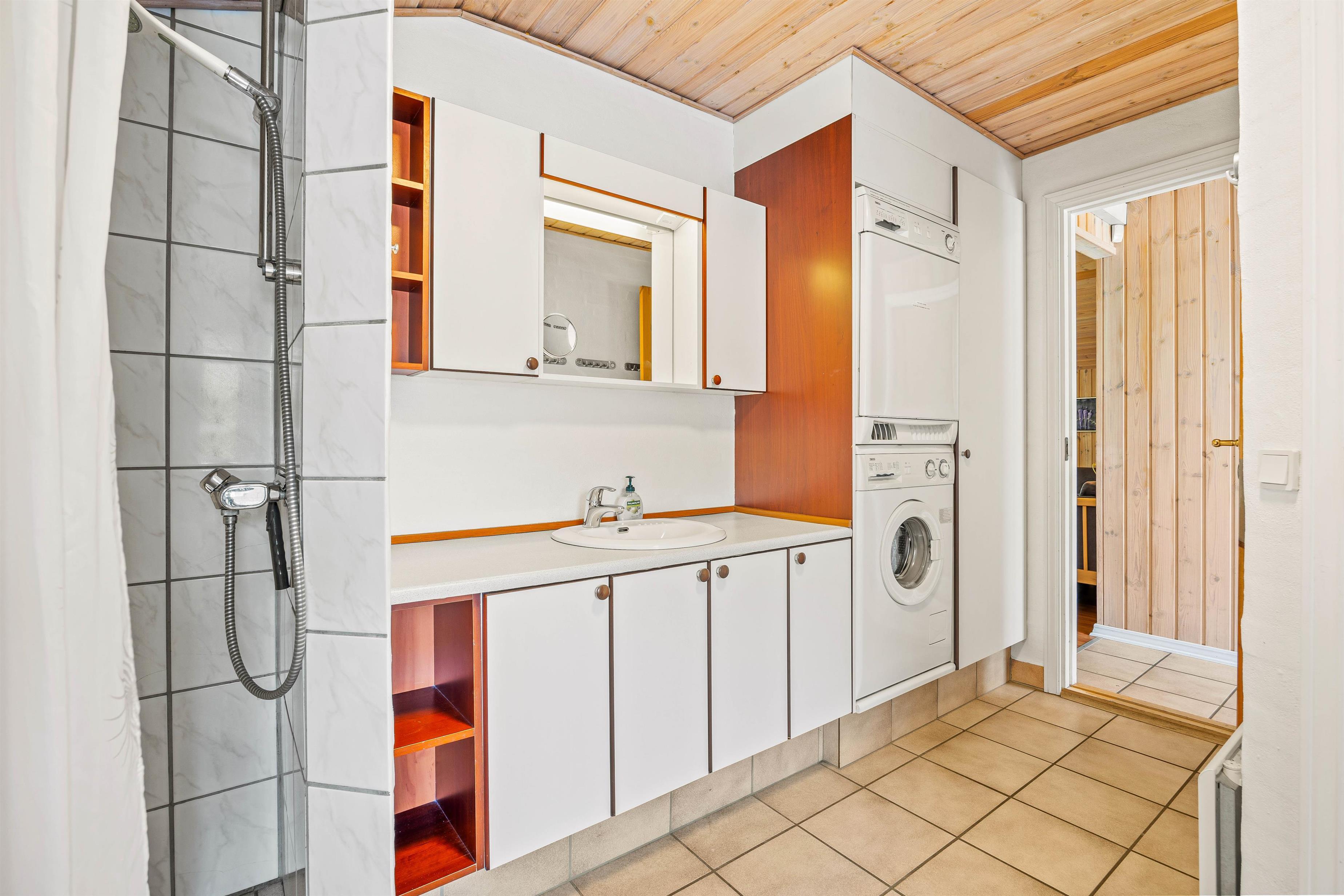 Badeværelset byder på gulvvarme, og her kan I forkæle jer selv med både spa og sauna efter en aktiv dag i naturen. Med både vaskemaskine og tørretumbler til rådighed behøver I ikke bekymre jer om praktiske detaljer under jeres ophold.