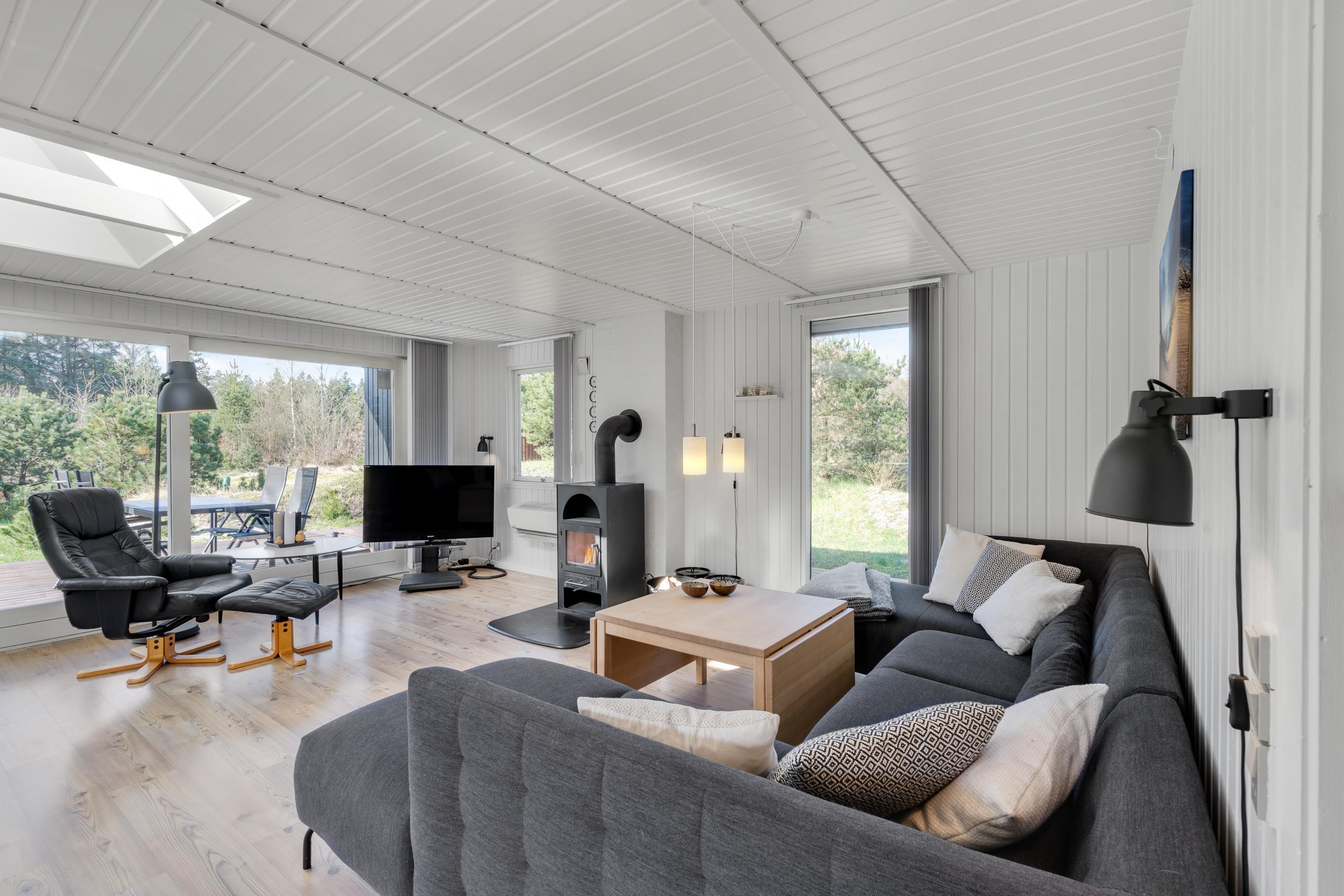 Også brændeovnen vil sørge for masser af varme og god feriestemning, når vejret er køligt, og mens vinden suser uden for døren, kan I nyde en varm kop kaffe rundt om sofabordet.