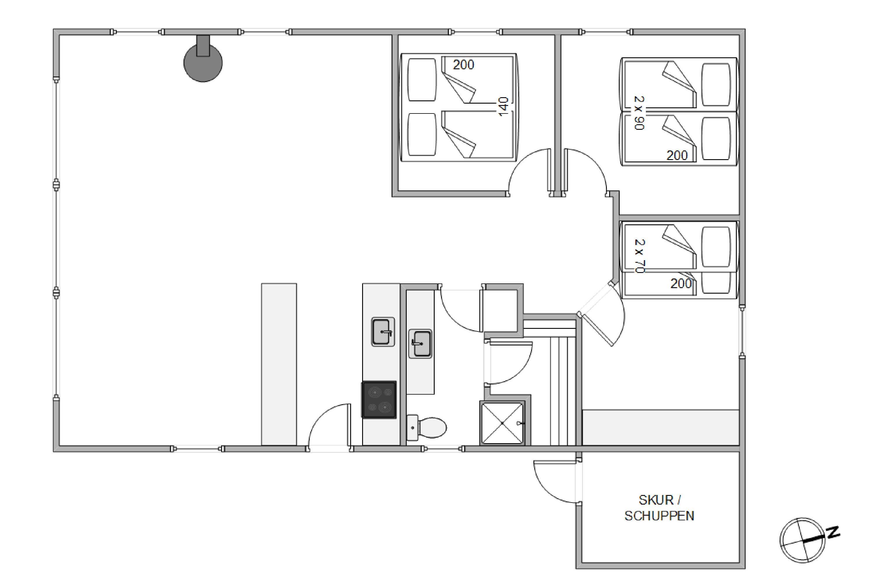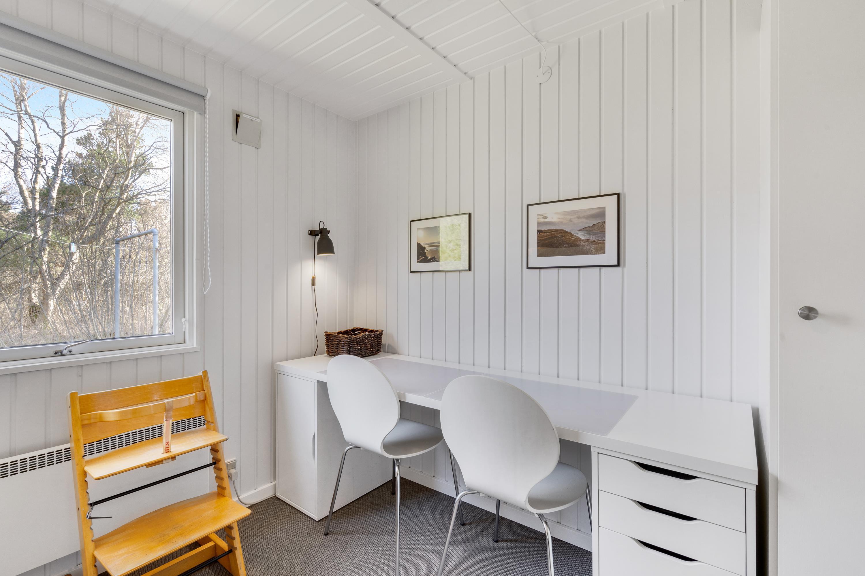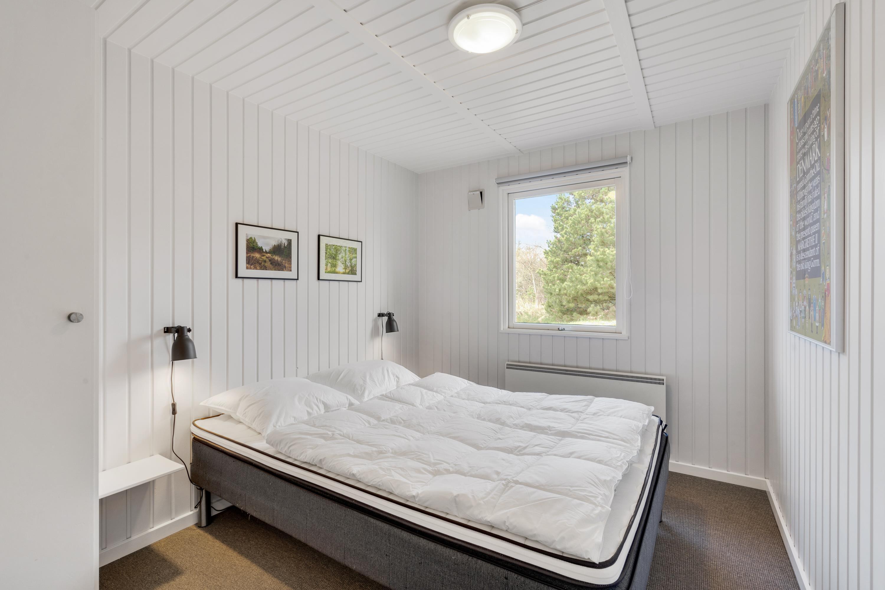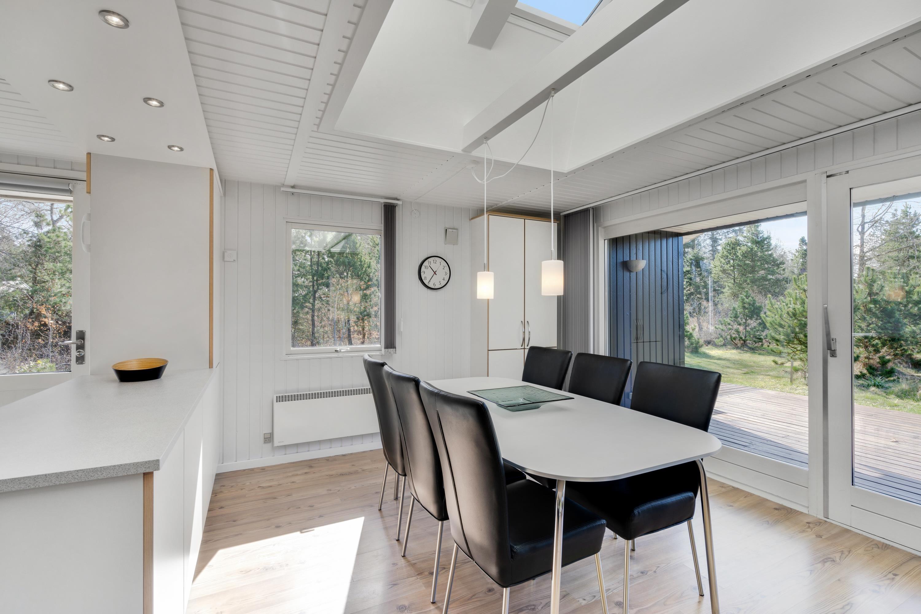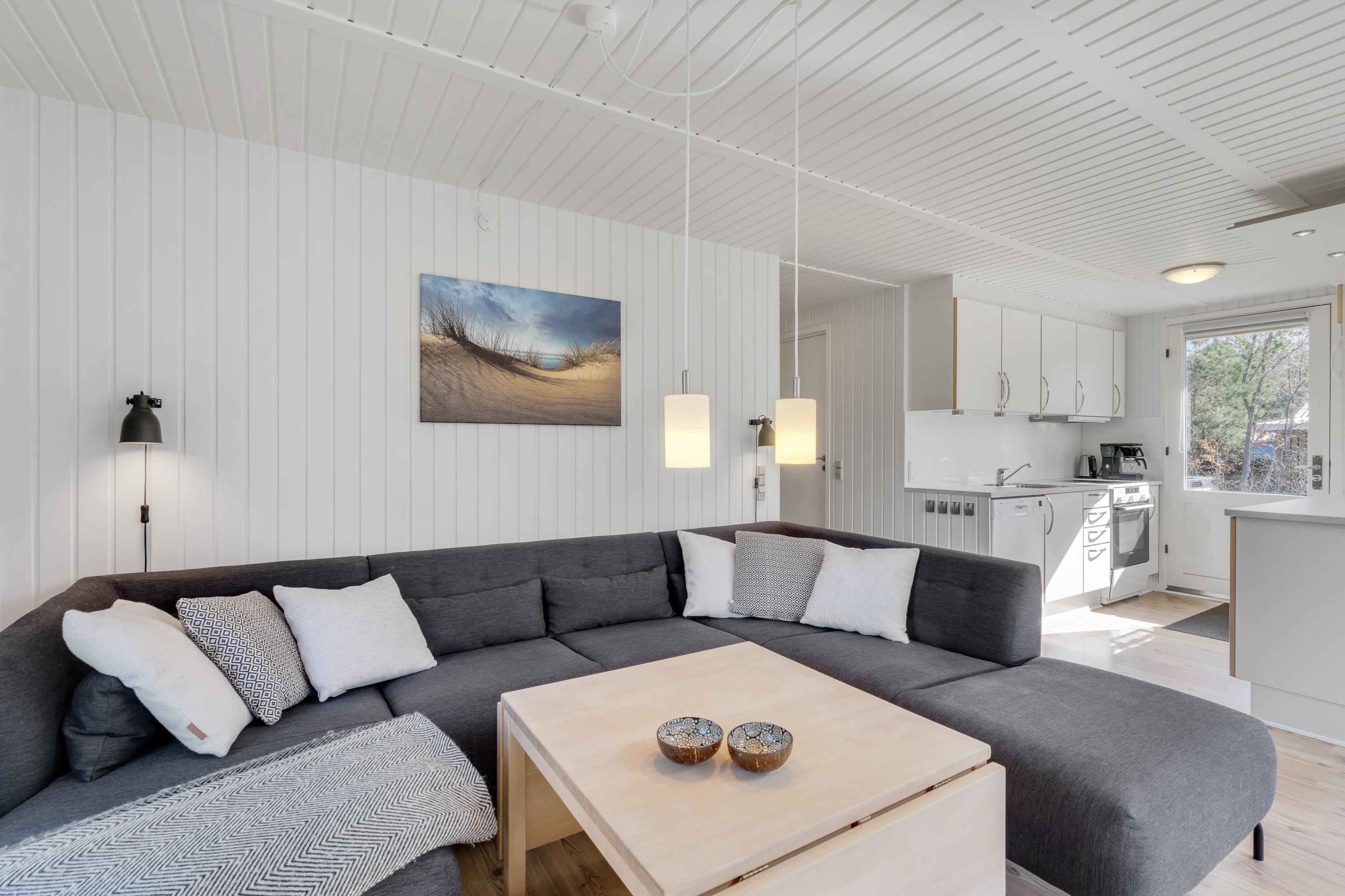 Indretningen er lys og moderne, og i det store opholdsrum er der god plads til, at hele familien kan være sammen. De store tagvinduer sørger for, at rummet virker endnu lysere og venligere, og her er der lagt op til masser af gode feriestunder med fælles madlavning, kortspil og filmaftener. Begge soveværelser er udstyret med insektnet.