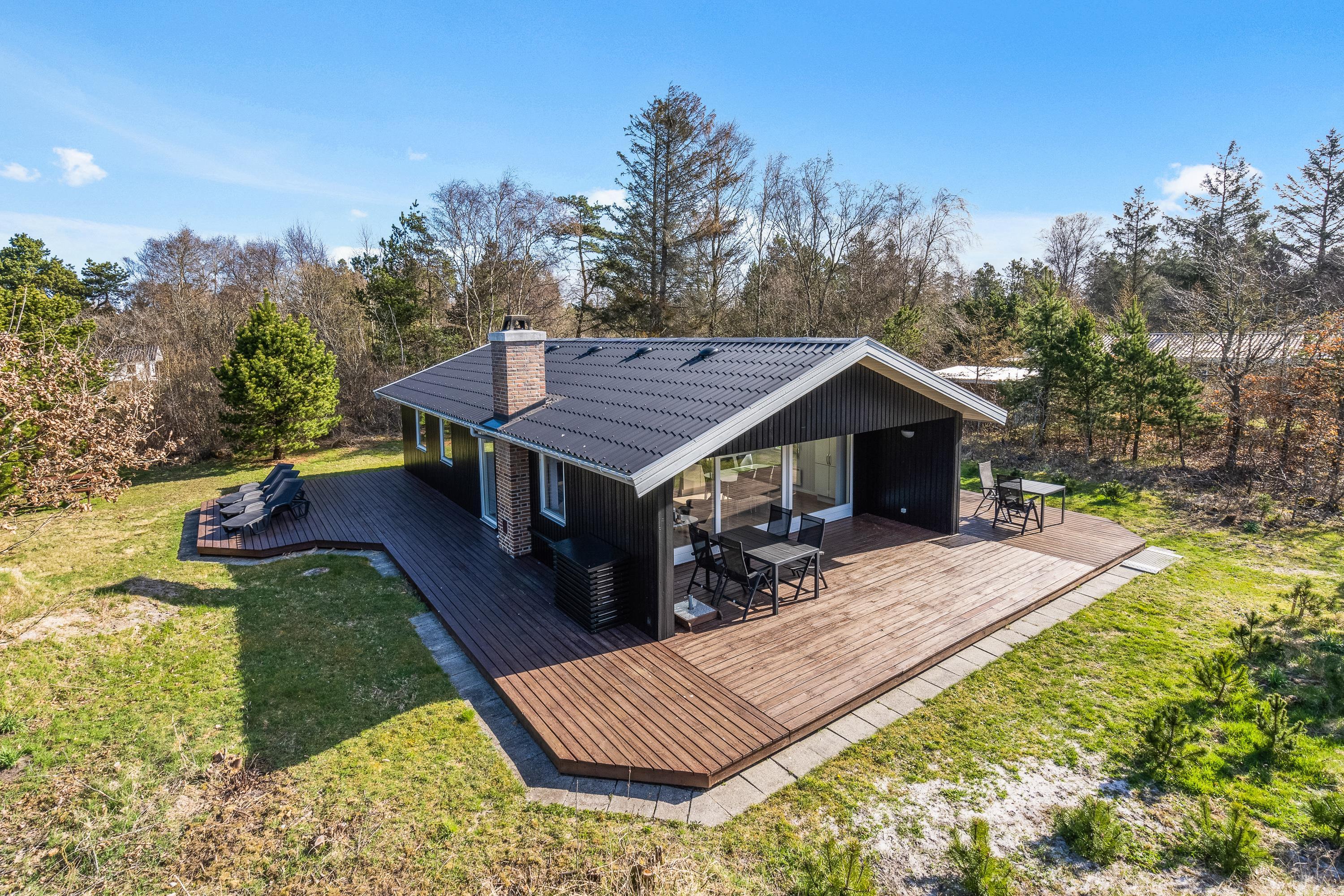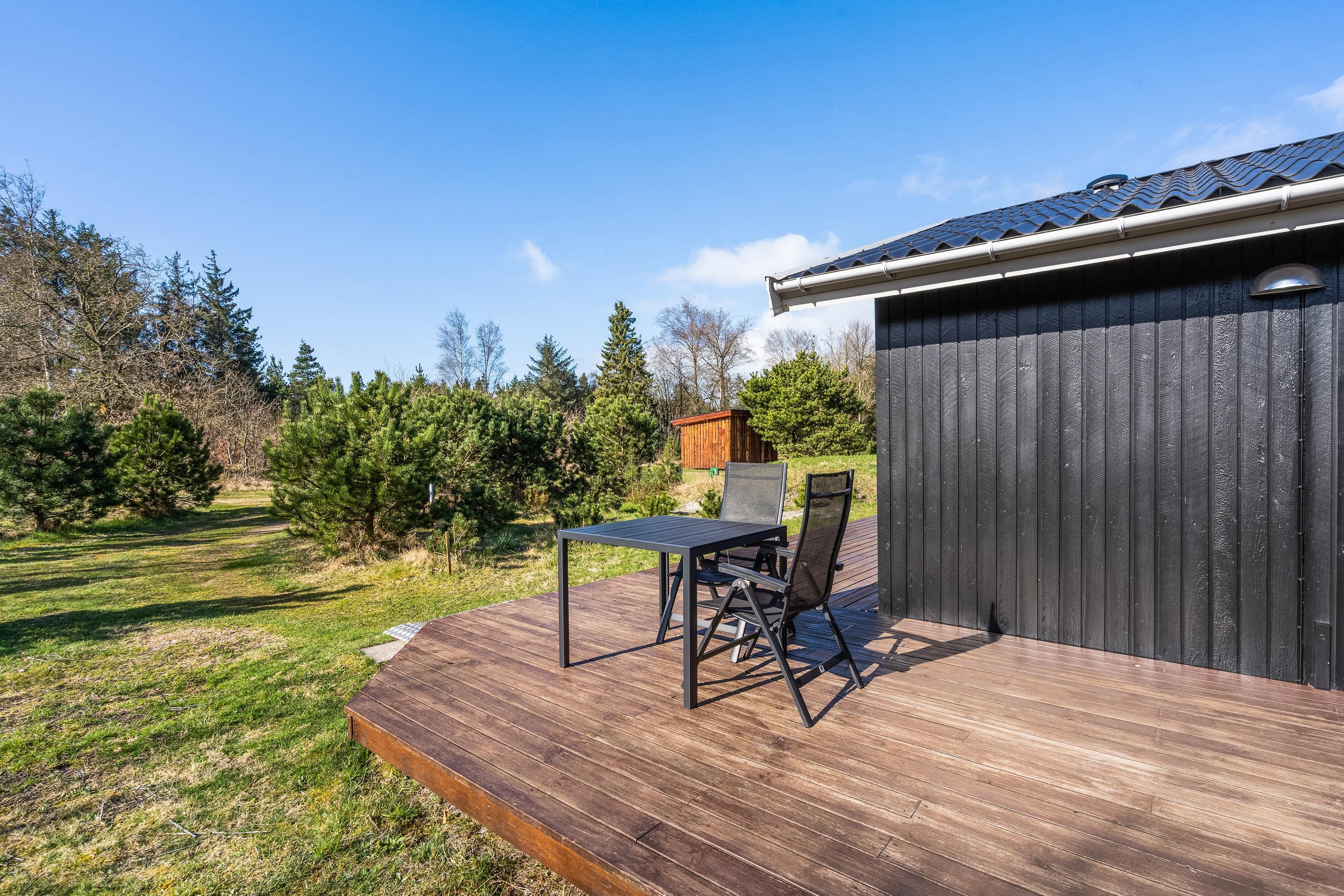 På den åbne terrasse kan I slappe af i liggestolene og lytte til fuglenes fløjten, mens solen varmer, og børnene og hunden leger og går på opdagelse mellem træerne. Den delvist overdækkede terrasse gør, at I kan tilberede lækre feriemåltider på grillen selv i dårligt vejr.