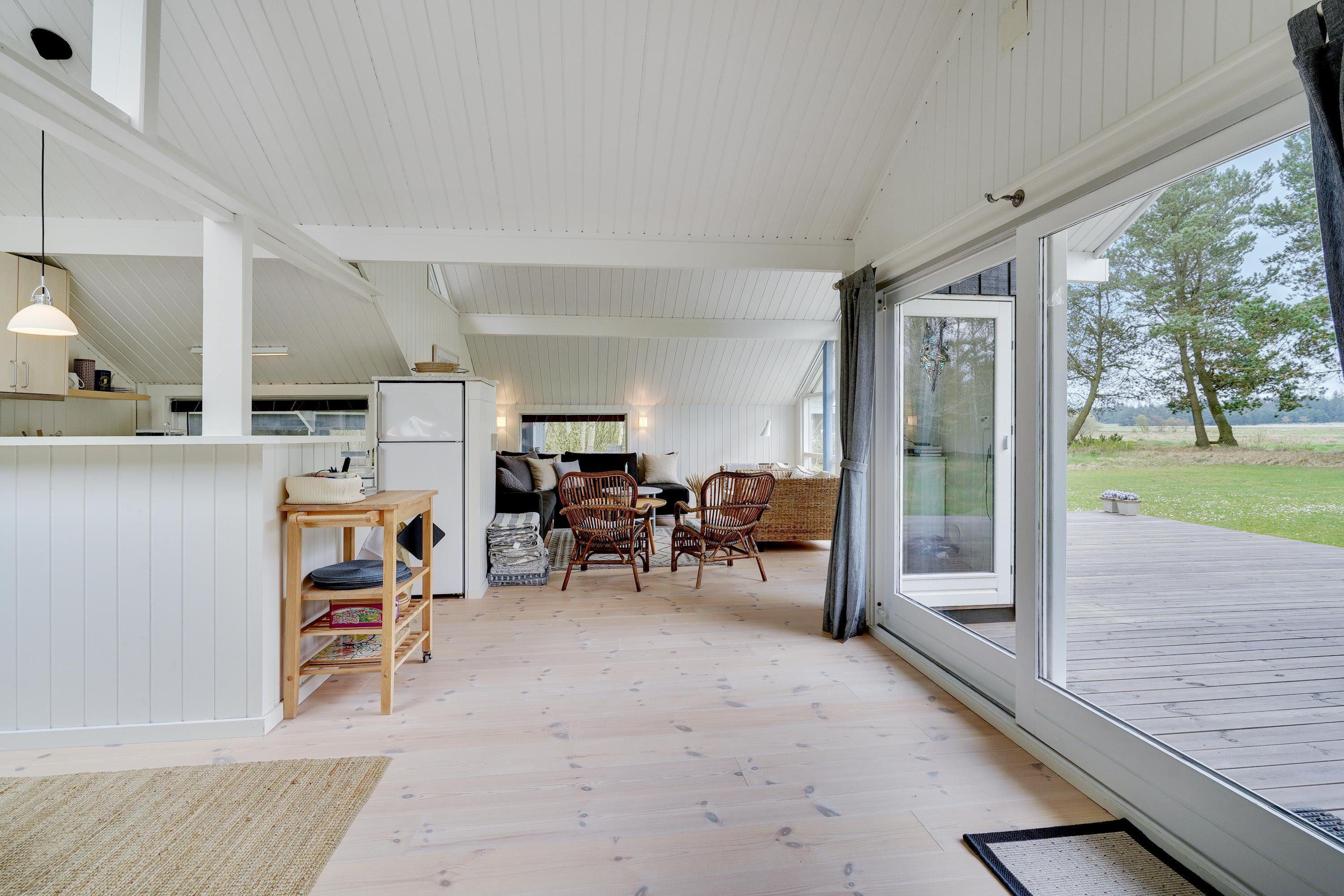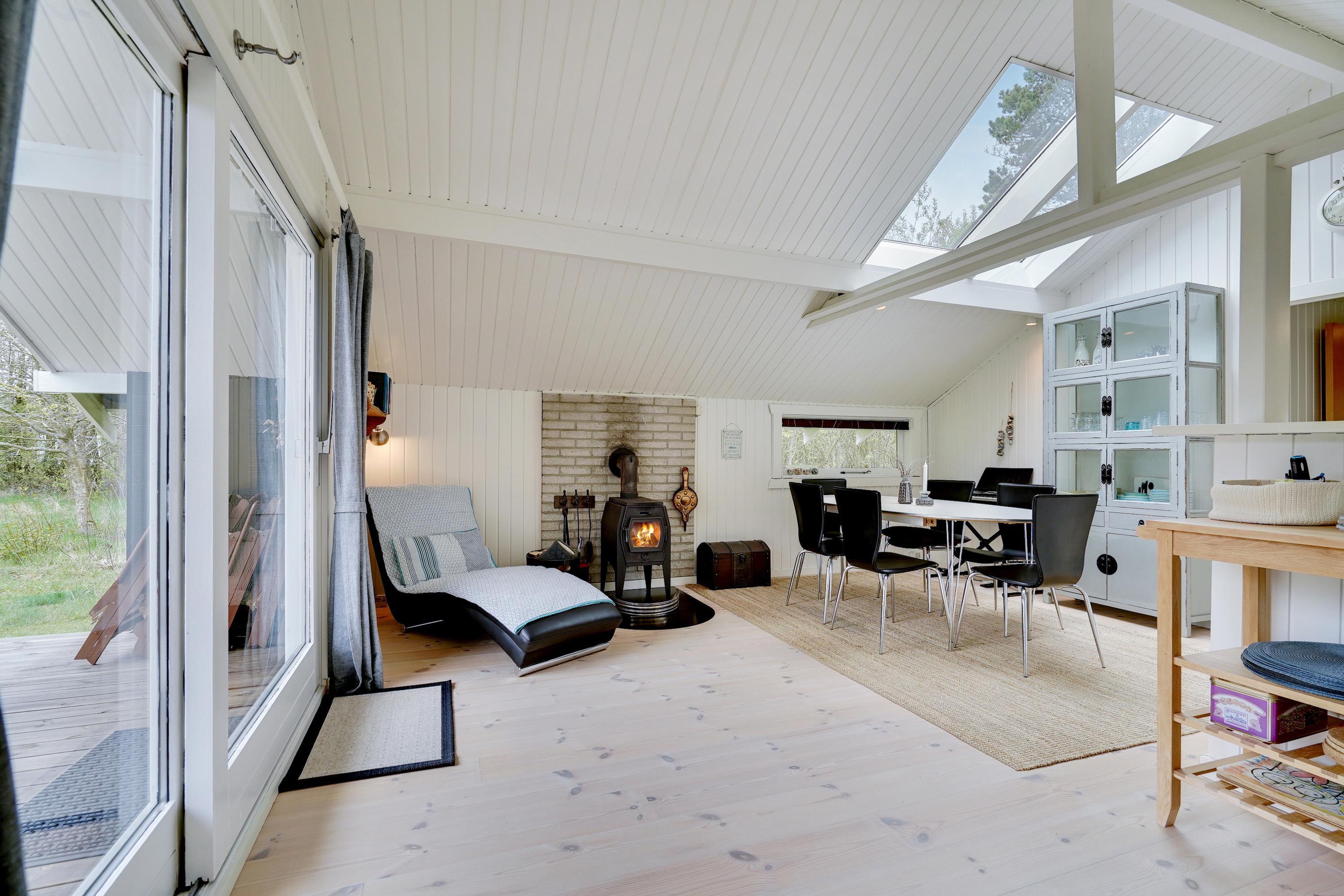 Stuen er kombineret med det åbne køkken og spiseplads. Det fungerer som et knudepunkt for hele familien. Med trægulve og brændeovn udstråler stuen ren hygge. Køkkenet er udstyret med opvaskemaskine, så I ikke behøver at spilde ferietid på at vaske op efter madlavningen. Derudover findes der en varmepumpe i huset.