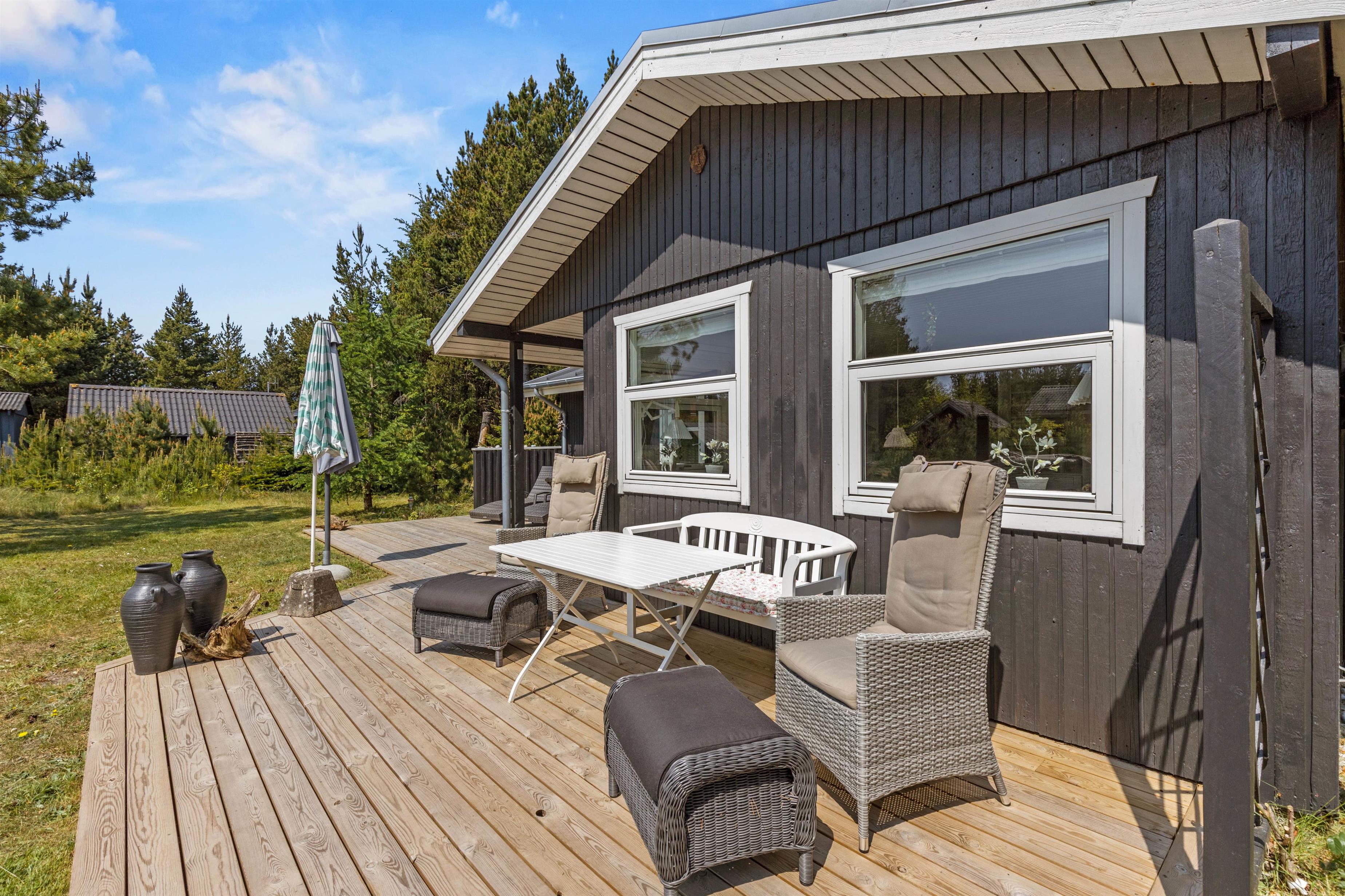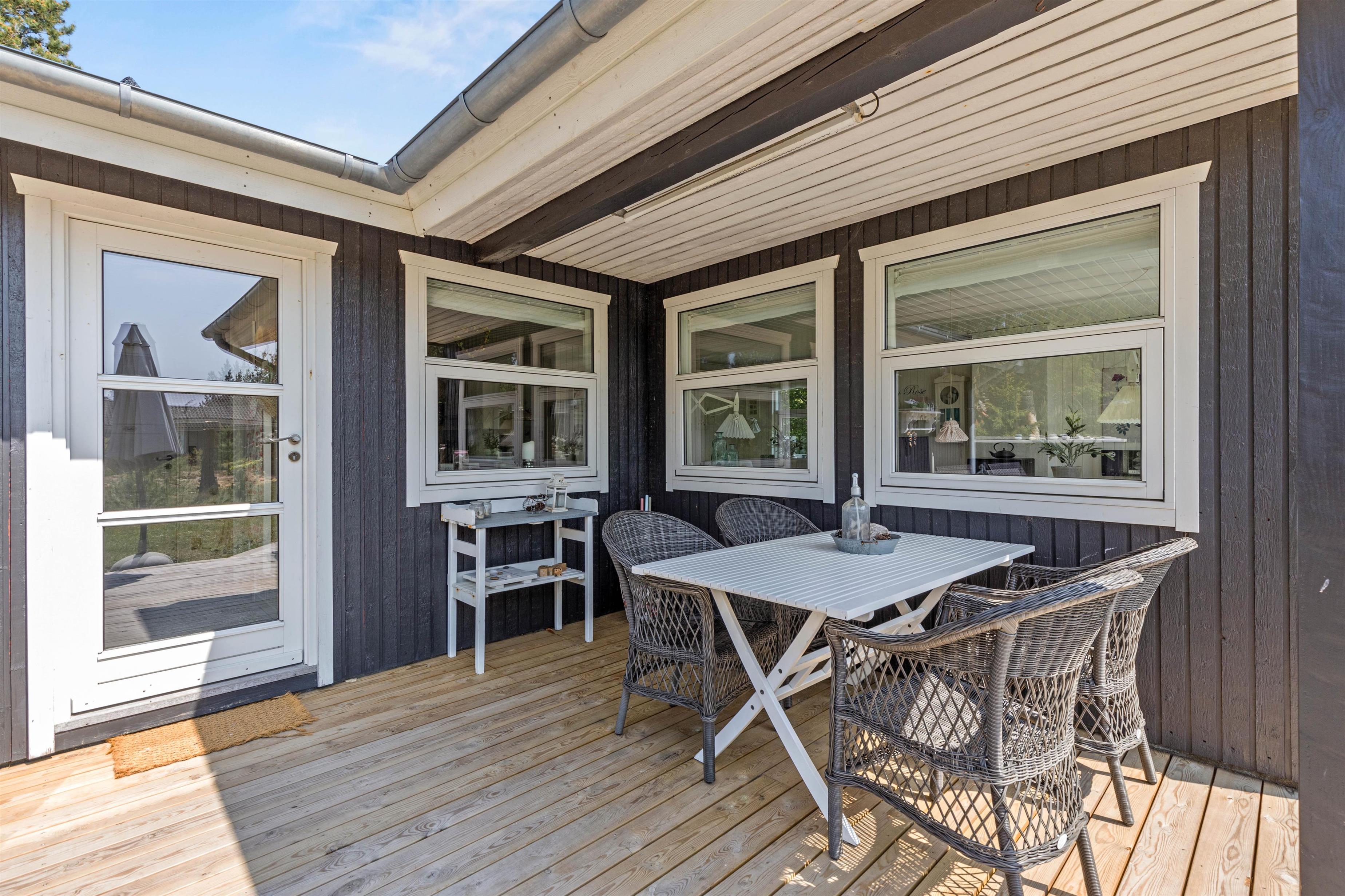 Lige så hyggeligt som det er indenfor, lige så hyggeligt er det også udenfor. Hele vejen rundt om huset finder I masser af små hyggekroge med bænke og havemøbler, og på den store terrasse er der gjort klar til, at I kan nyde de dejlige solskinsdage i havemøblerne.