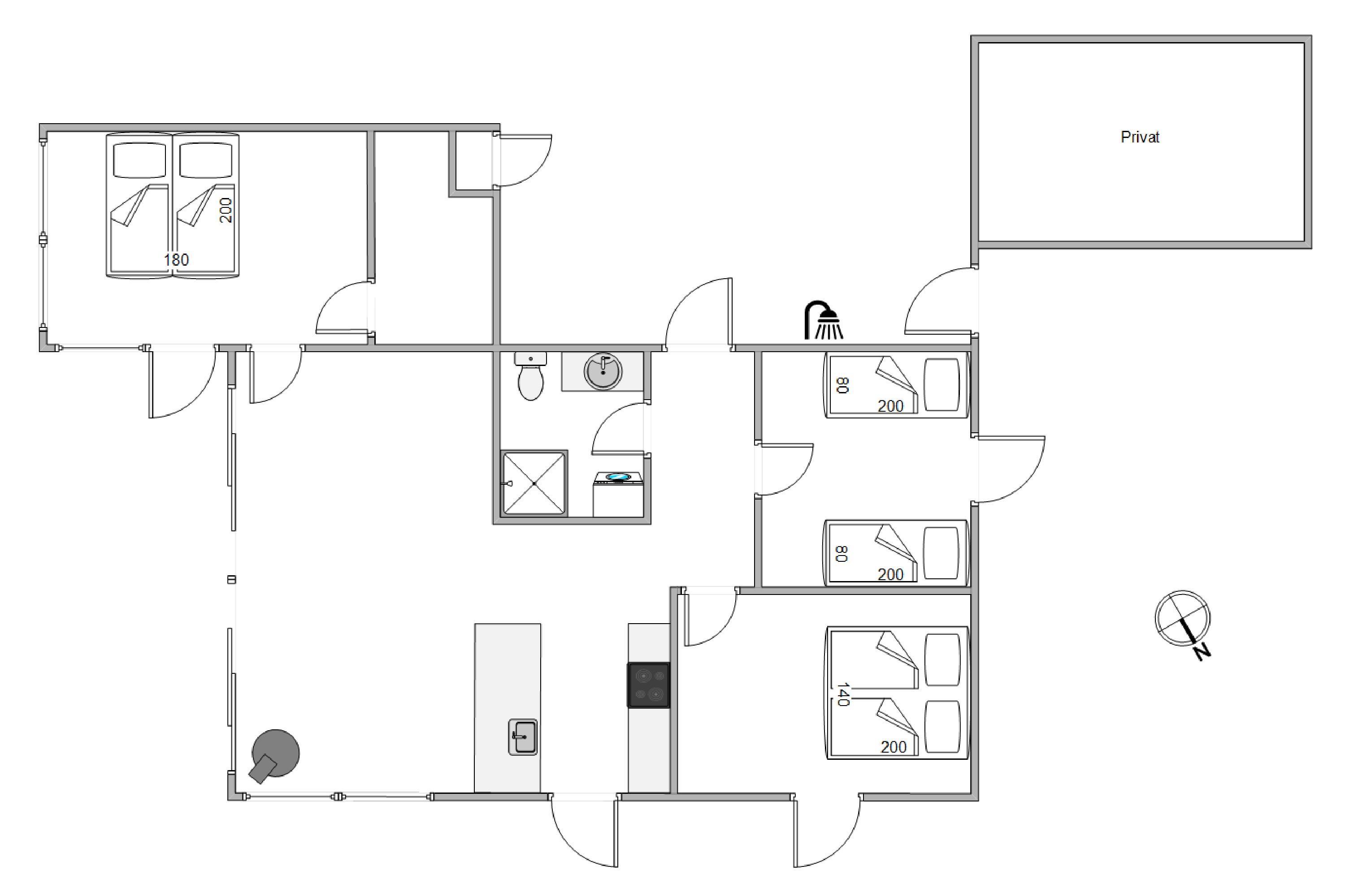 Sommerhuset rummer 3 gode soveværelser, hvoraf det ene har en stor dobbeltseng på 180x200 cm, et andet har en dobbeltseng på 140x200 cm, og det tredje soveværelse har 2 enkeltsenge.