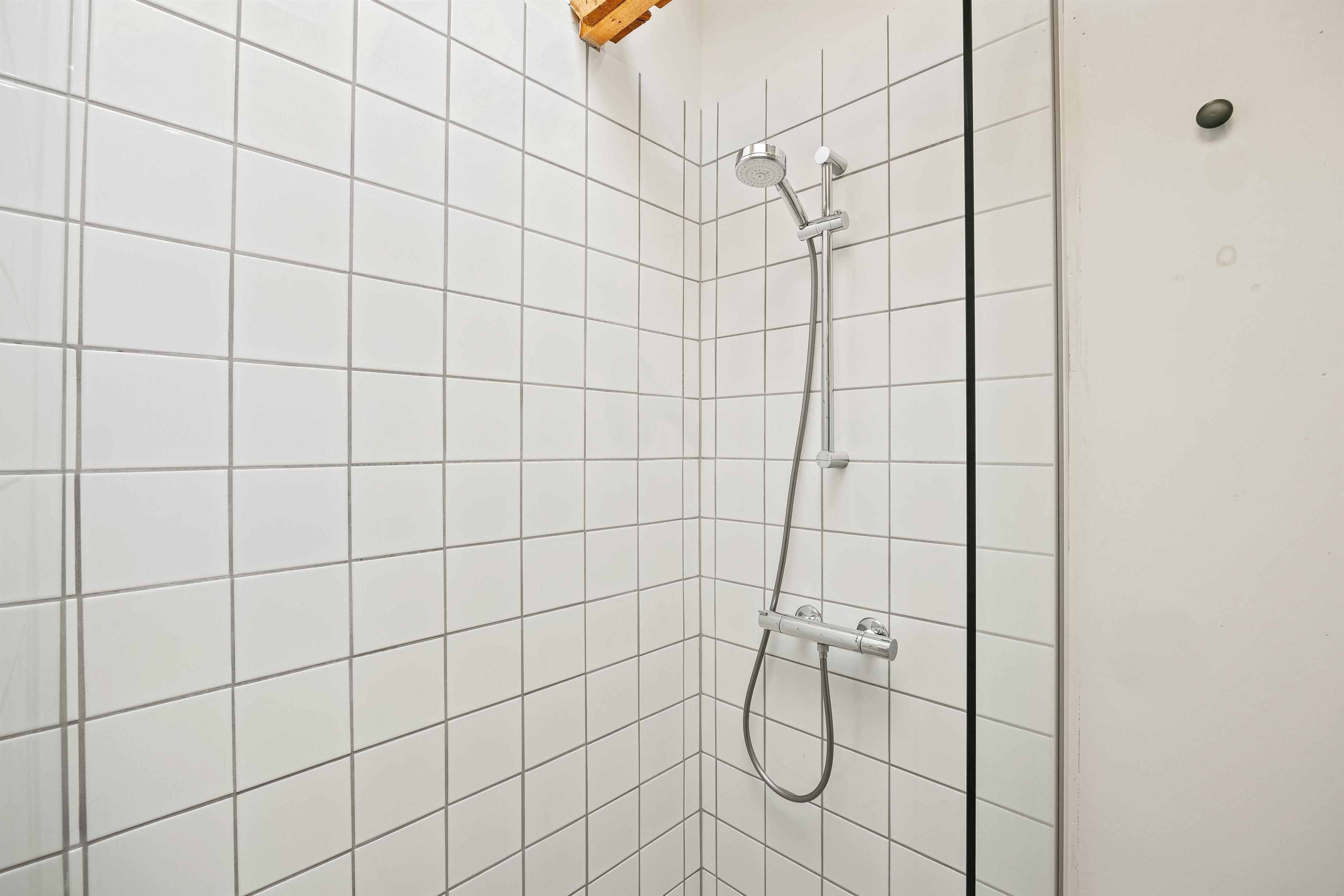 Badeværelset er lyst og har gulvvarme samt en vaskemaskine, så I kan holde styr på garderoben under hele jeres ophold.