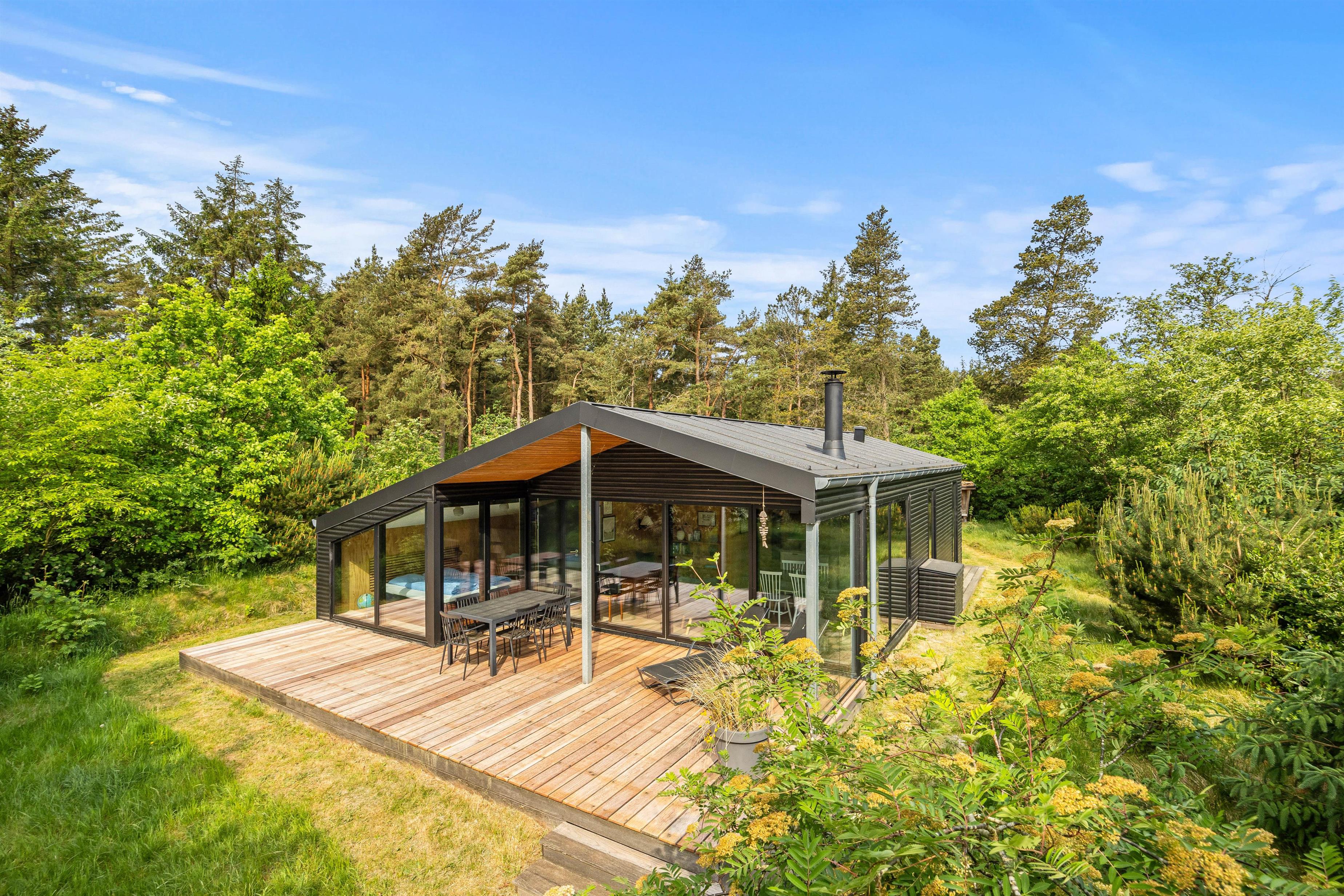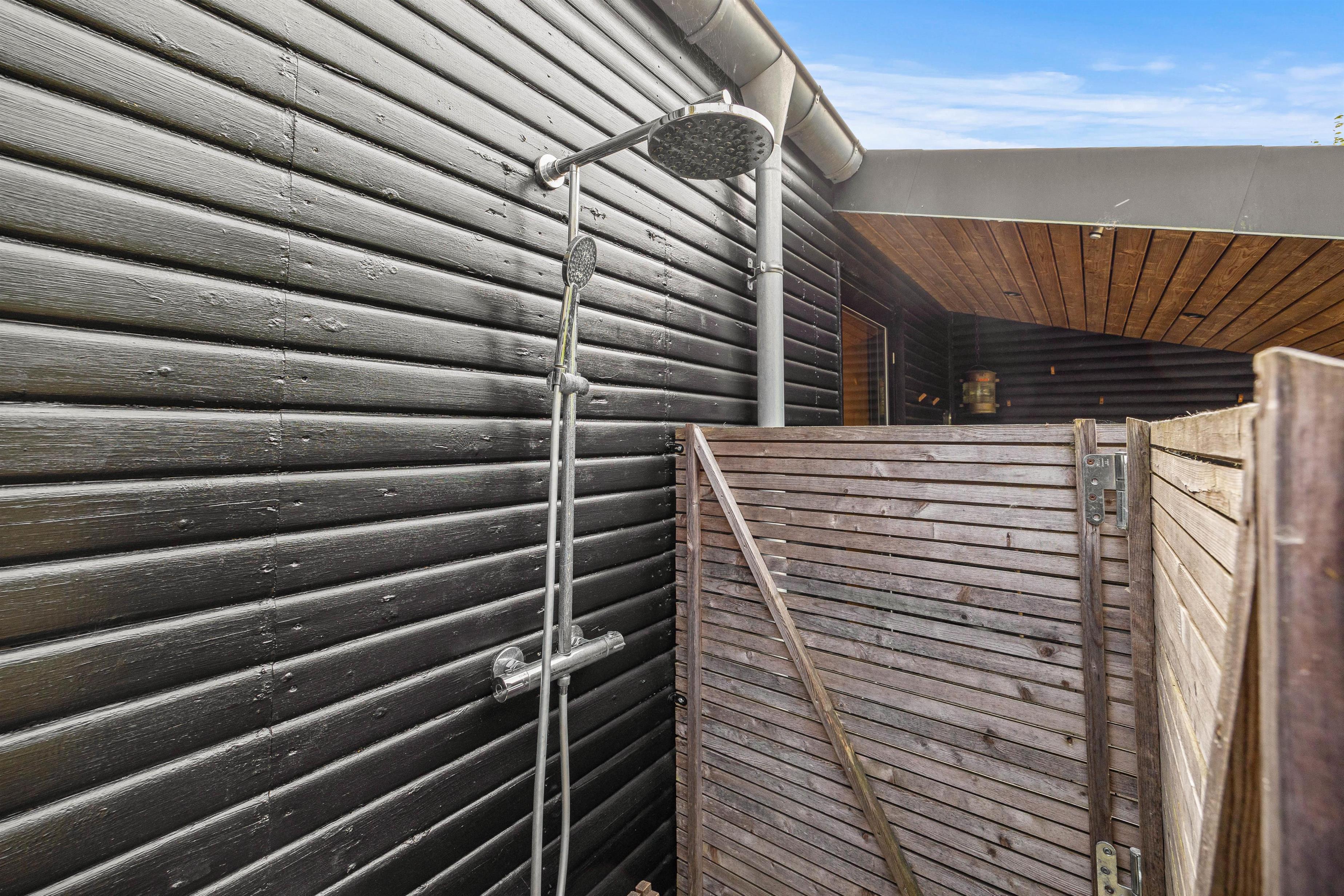 Fra terrassen kan I træde ud på en stor naturgrund, som giver en fornemmelse af at være midt i skoven. Her er der rig mulighed for at få besøg af skovens dyr, som tilfører opholdet en ekstra naturoplevelse. Efter en skøn dag ved stranden kan I benytte udebruseren til hurtigt at skylle sand og salt af, før I trækker jer tilbage til sommerhusets hyggelige indre.