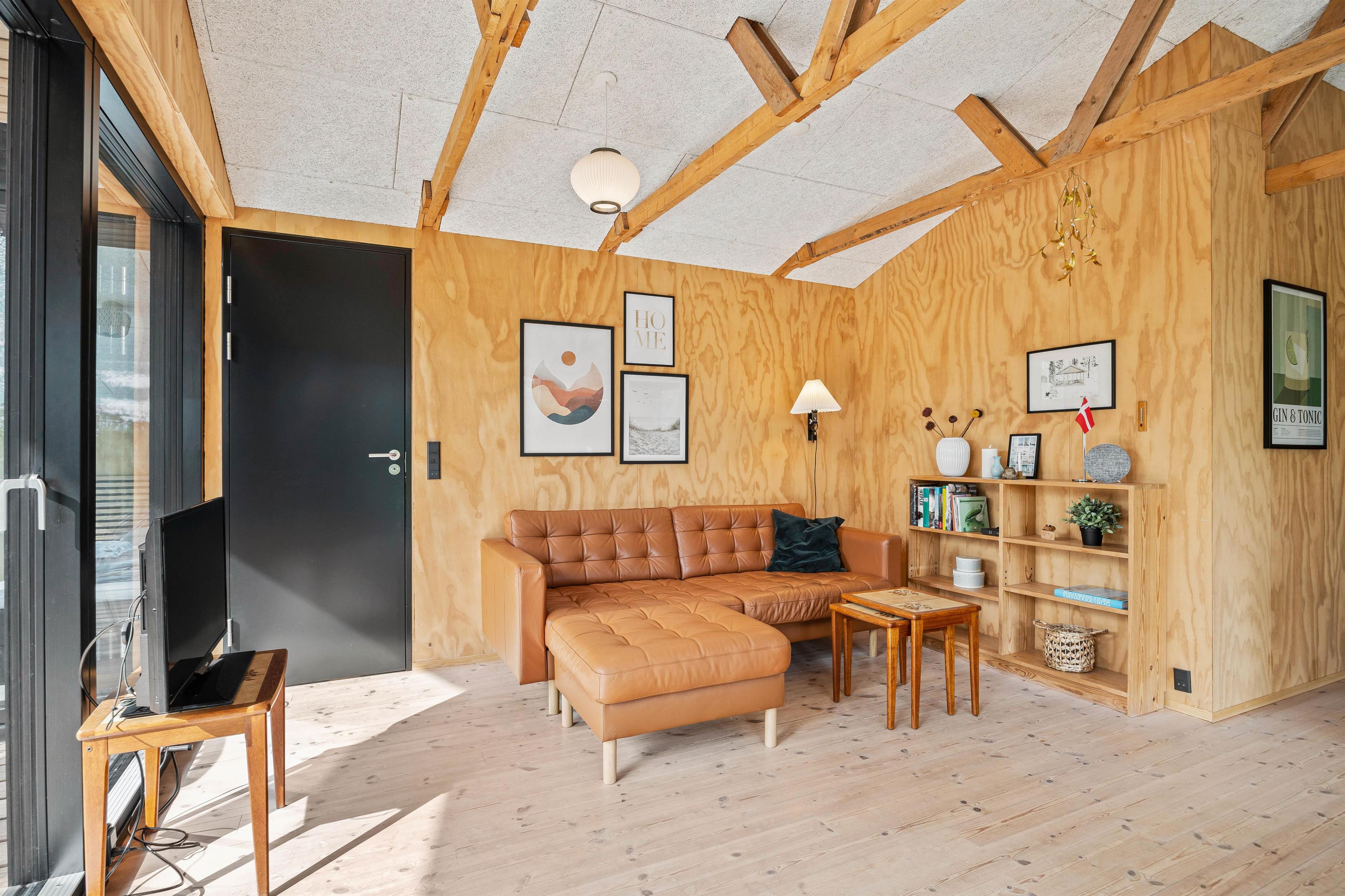 Sommerhuset fremstår lyst og rummeligt med højt til loftet og store vinduer, der inviterer masser af naturligt lys indenfor. Her får I muligheden for at nyde samværet og samtidig være tæt på naturen. Den åbne planløsning, som kombinerer stue, køkken og spisestue i ét, gør det muligt at fortsætte samtalen fra madlavningen til hyggelige stunder i sofaen.