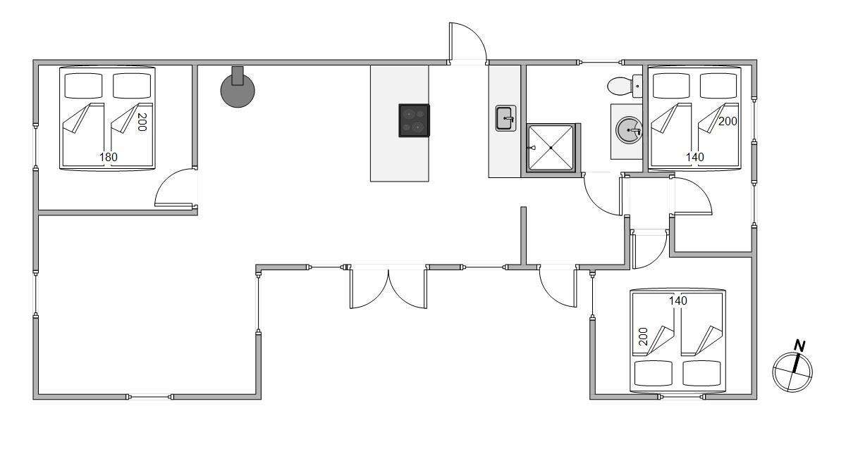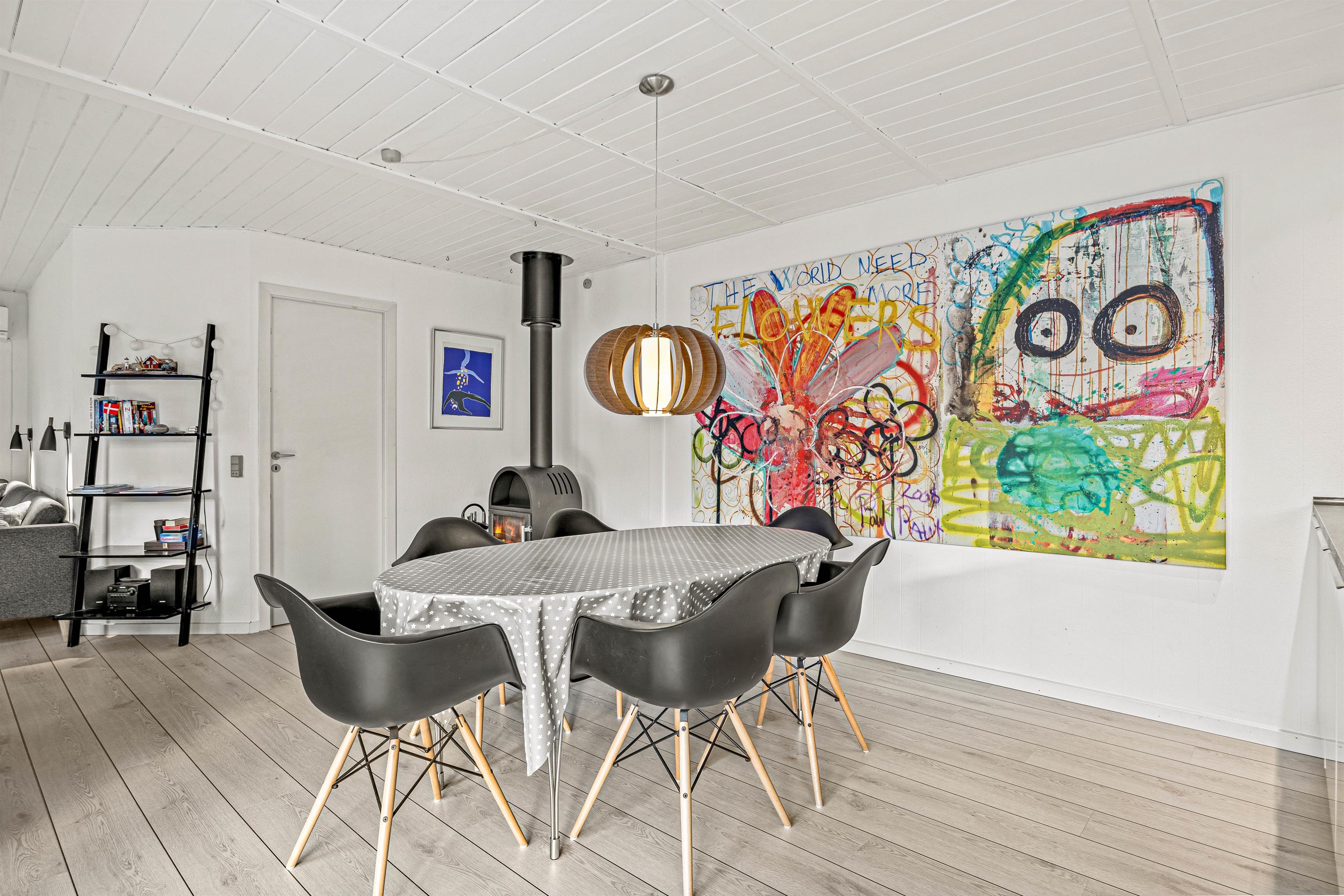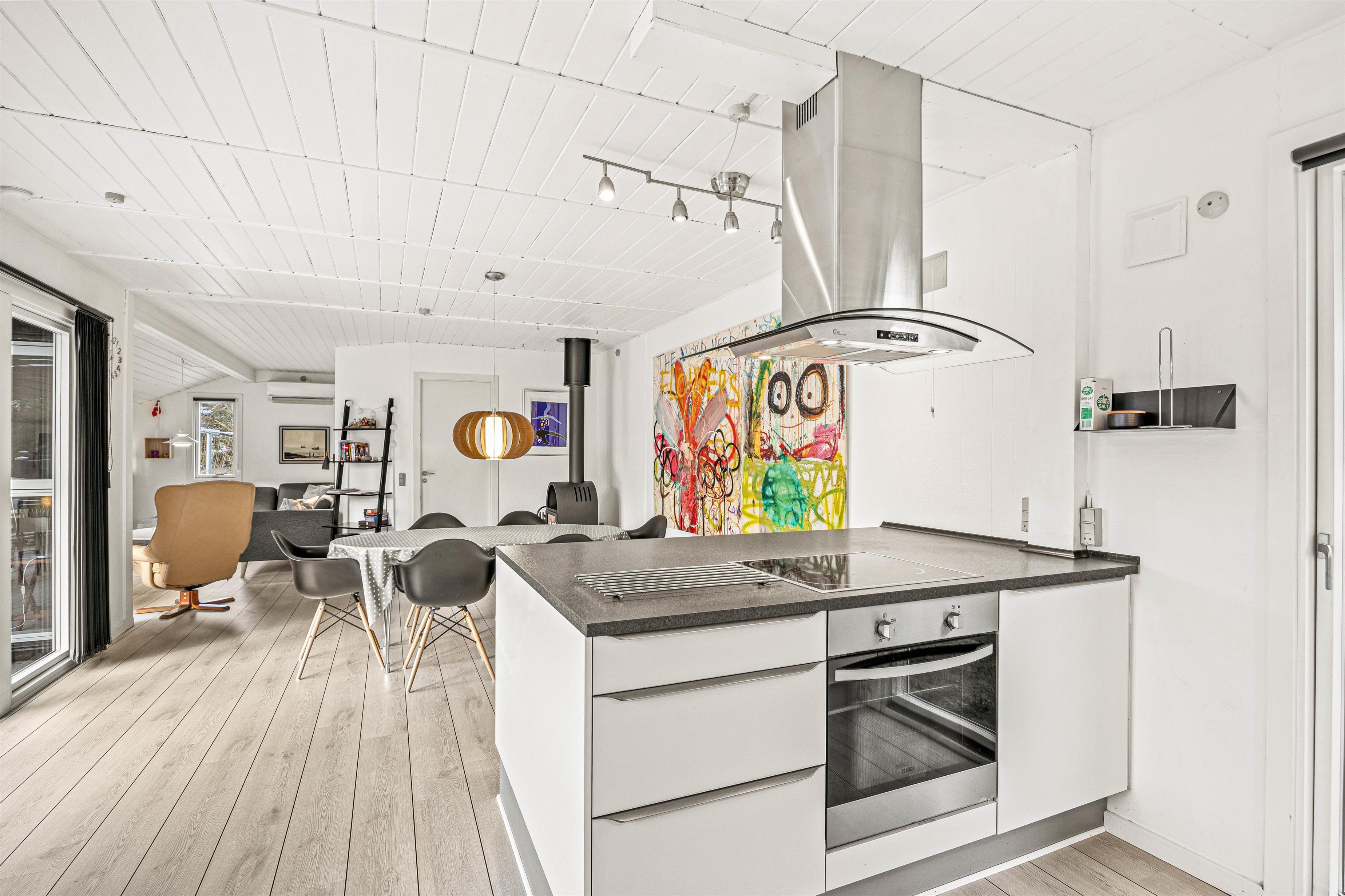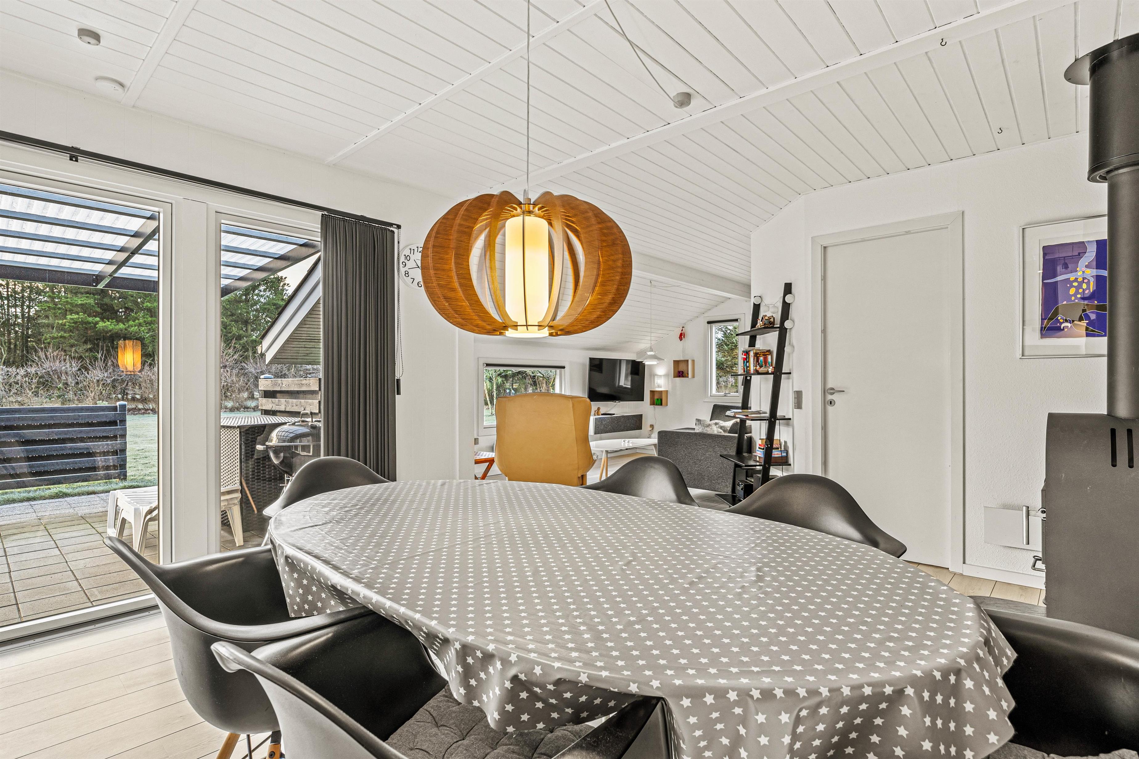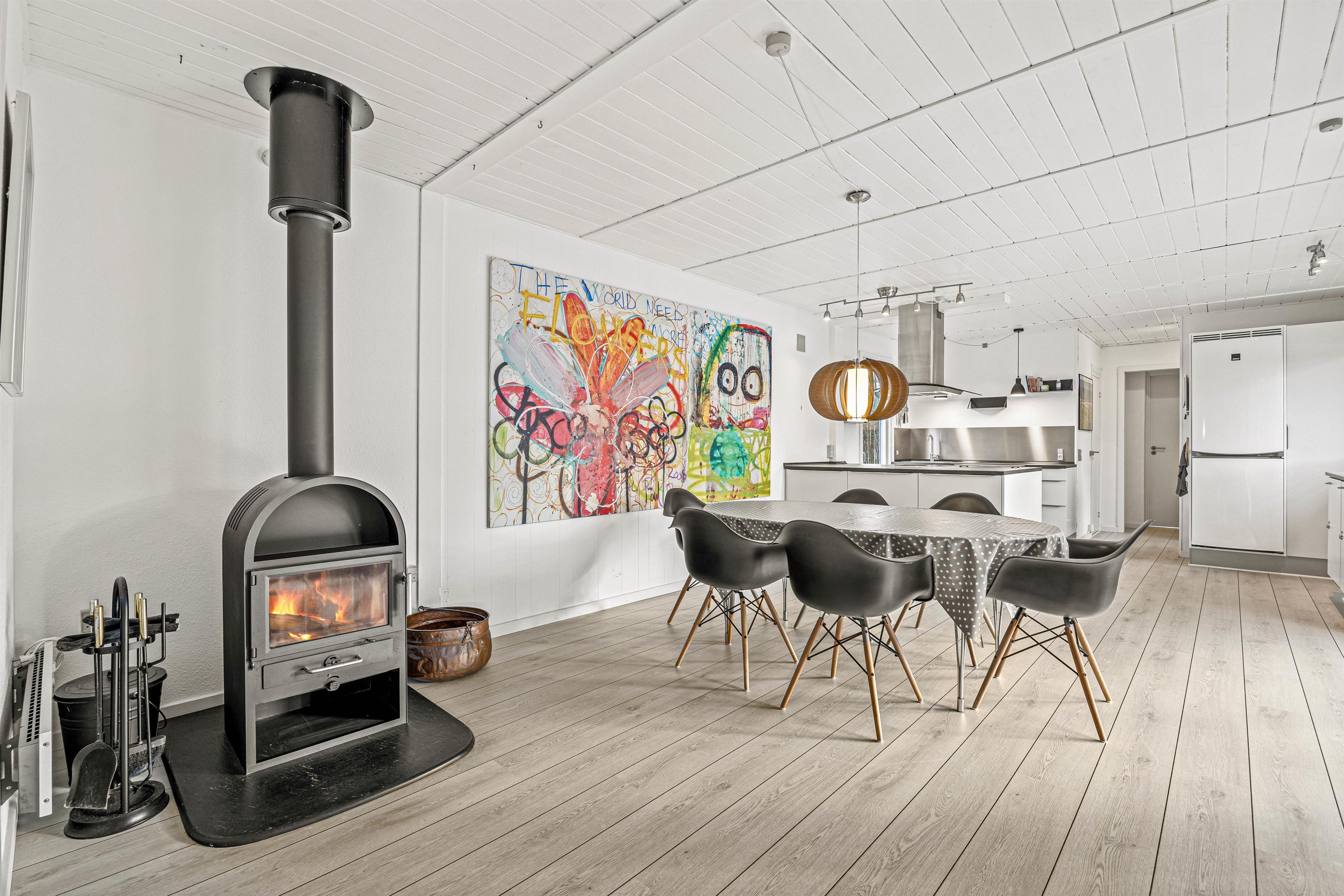 Stue, spiseafdeling og køkken flyder her sammen i ét stort opholdsrum, og de store vinduespartier inviterer solens lys indenfor, samtidig med, at I får en skøn udsigt ud over haven og den flotte natur, der omgiver jer. Og mens I slapper af på sofaen eller tager et spil kort rundt om spisebordet, vil den knitrende brændeovn fylde rummet med varme og masser af herlig feriestemning.