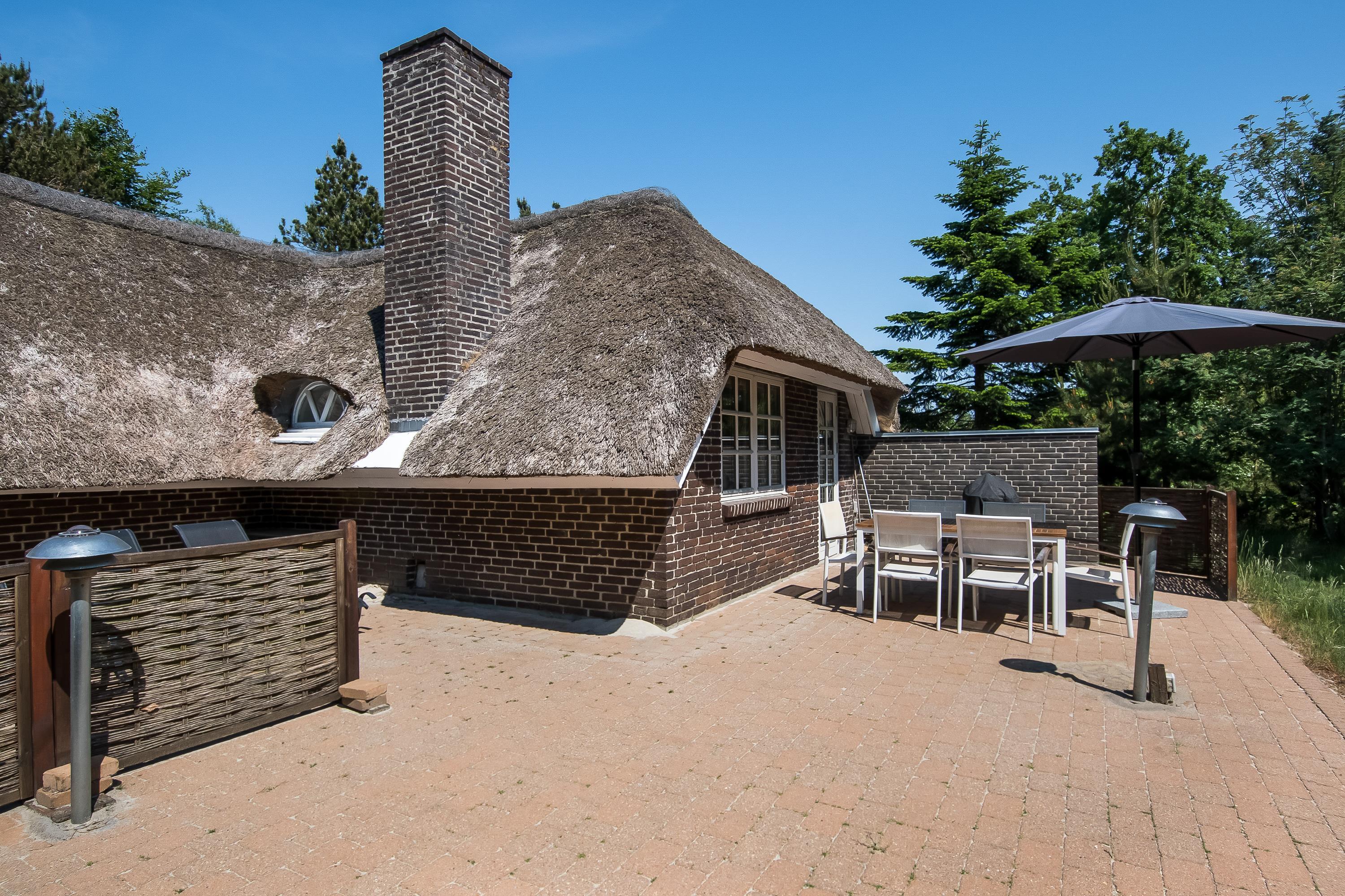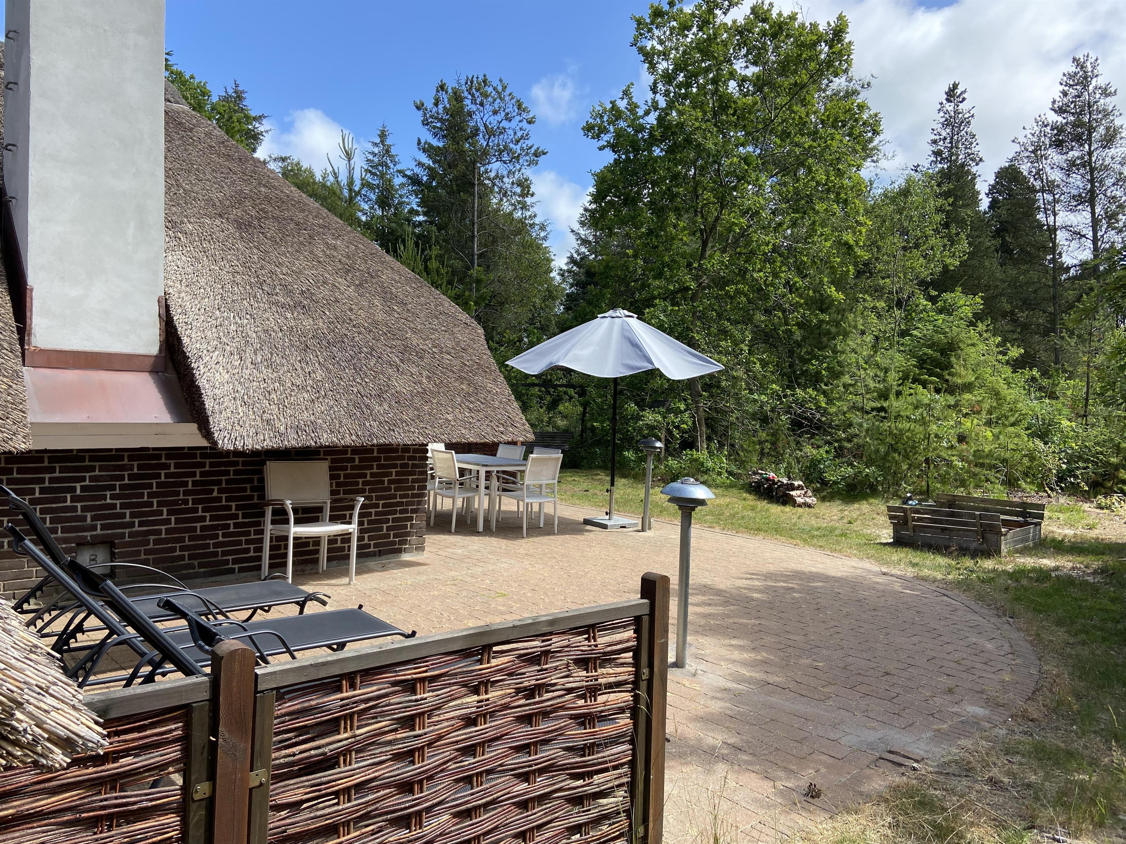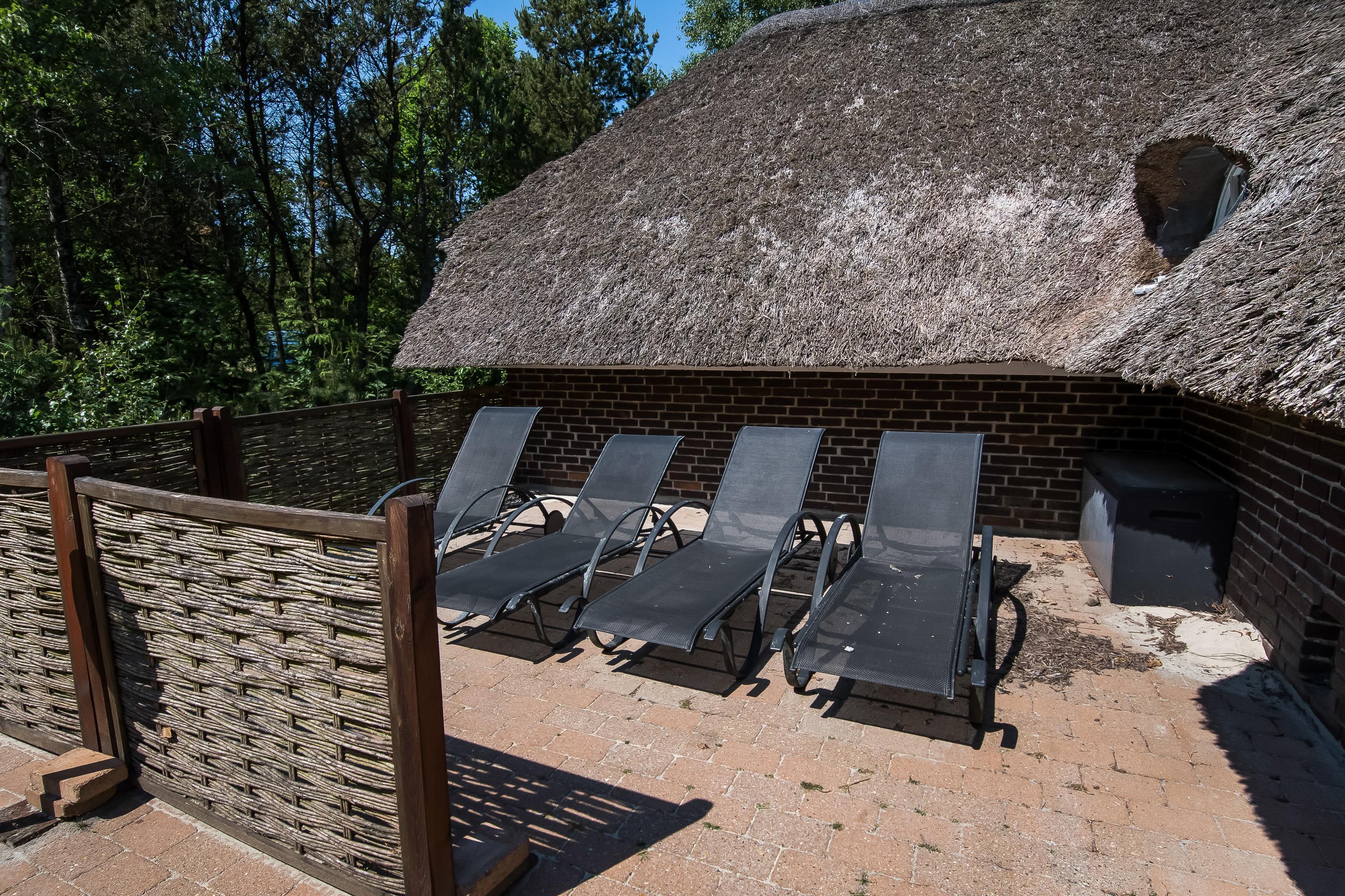 Den fine terrasse er omgivet af de høje træer, og her kan I helt ugeneret nyde ferien. Liggestole og havemøbler står klar til jer, så I kan slappe af i solen eller spise en lækker frokost i det gode vejr, og om aftenen kan I tænde op i grillen og runde dagen godt af.