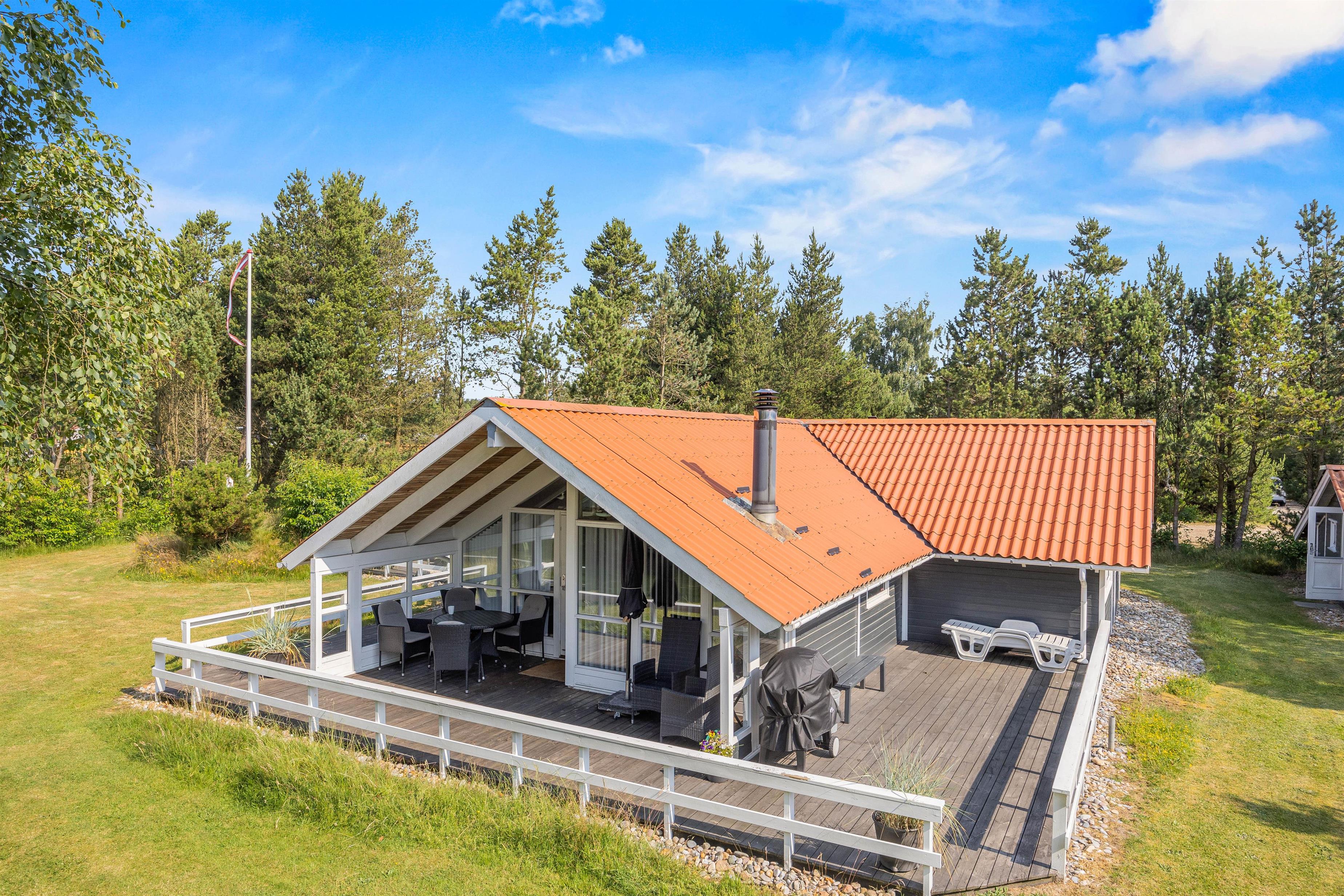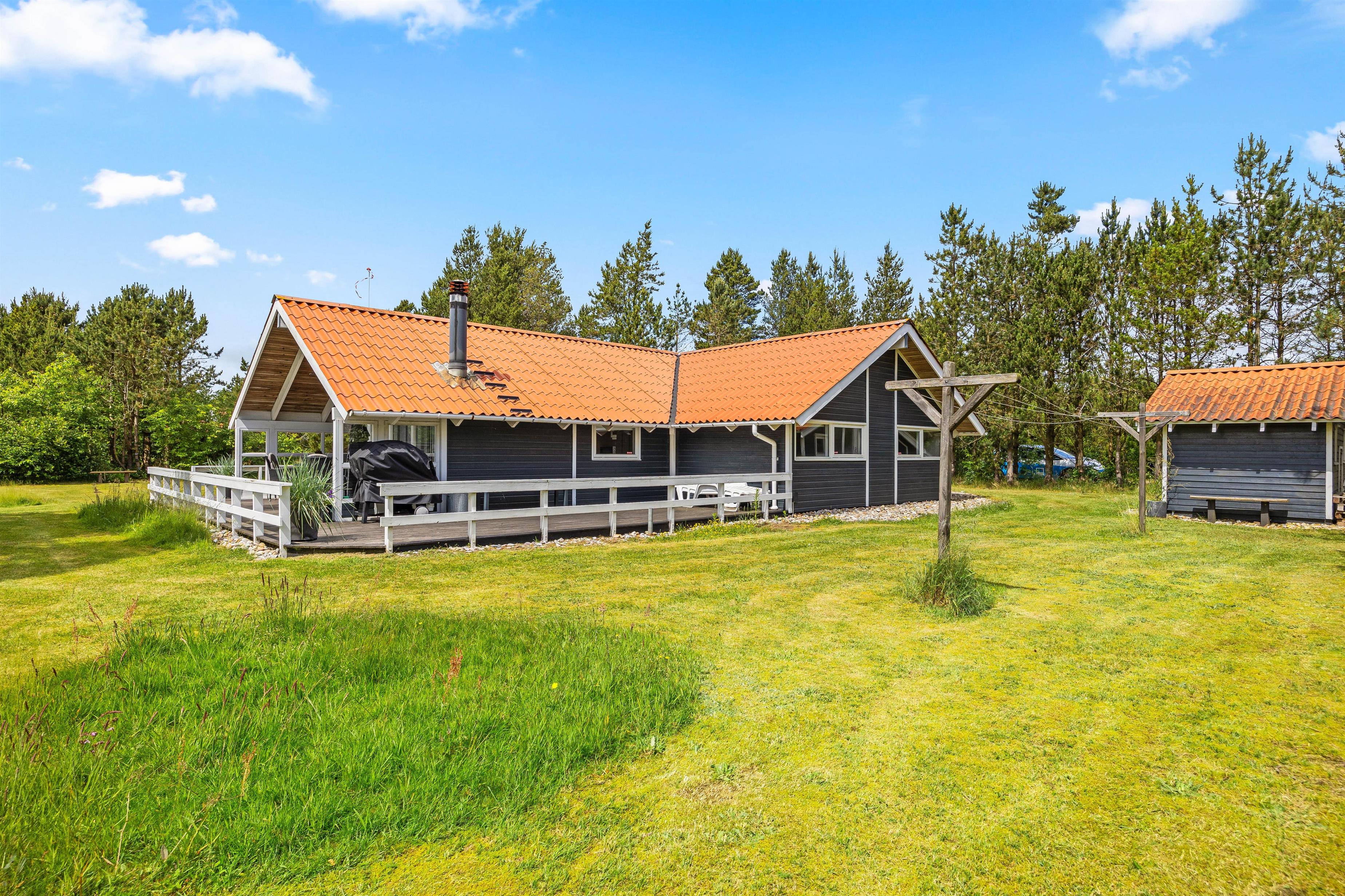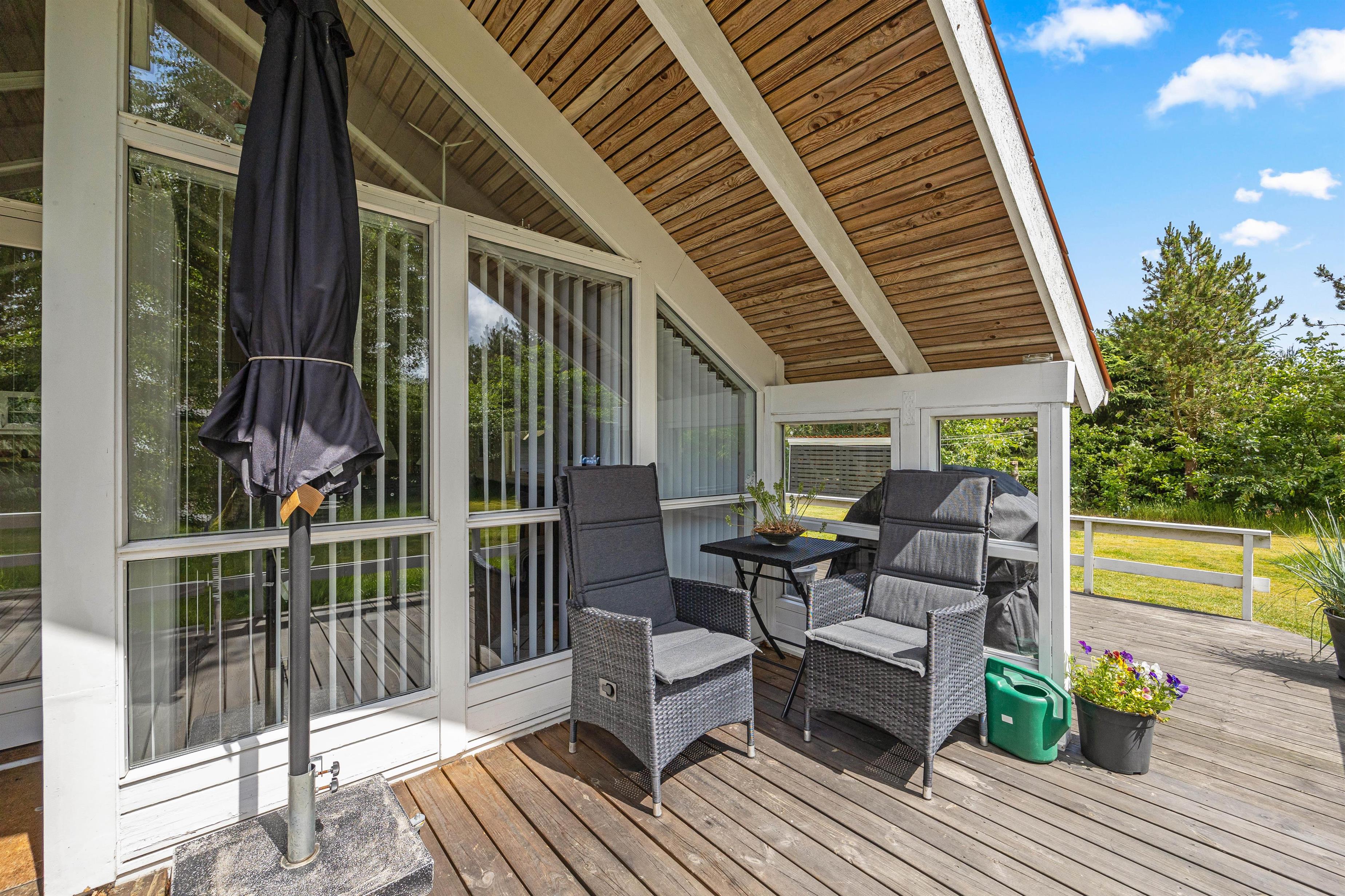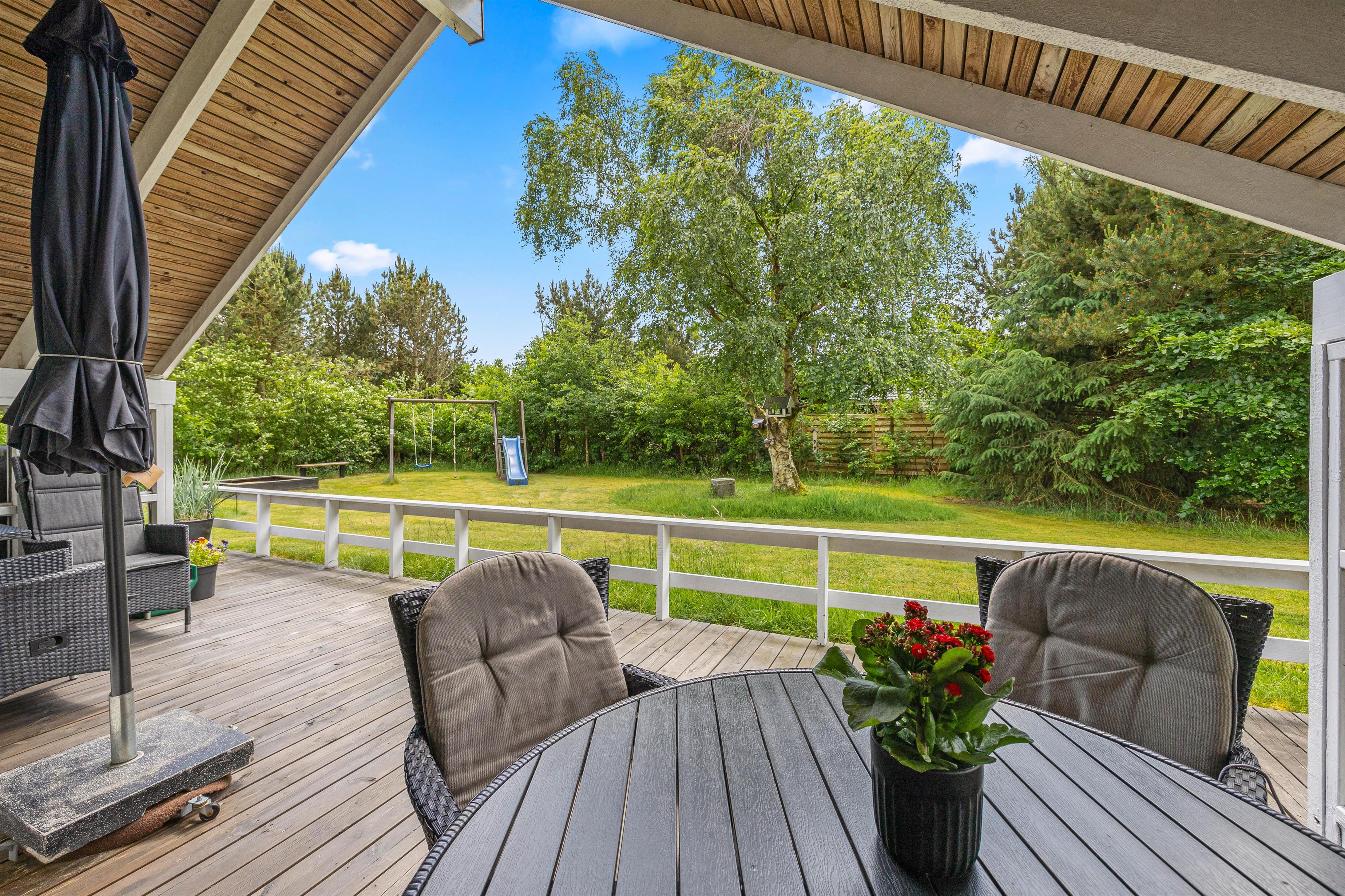 Rundt om størstedelen af sommerhuset er en terrasse, der både har en åben og en overdækket del, samt terrassen er afskærmet, så I næsten altid kan finde et sted med læ. Her står både havemøbler, solvogne og en grill til jeres rådighed, så I rigtig kan nyde en dag i haven. Både børn og hunde vil også elske det her, da den 1480 kvadratmeter store grund har en god plæne, hvor der er plads til boldspil og leg.