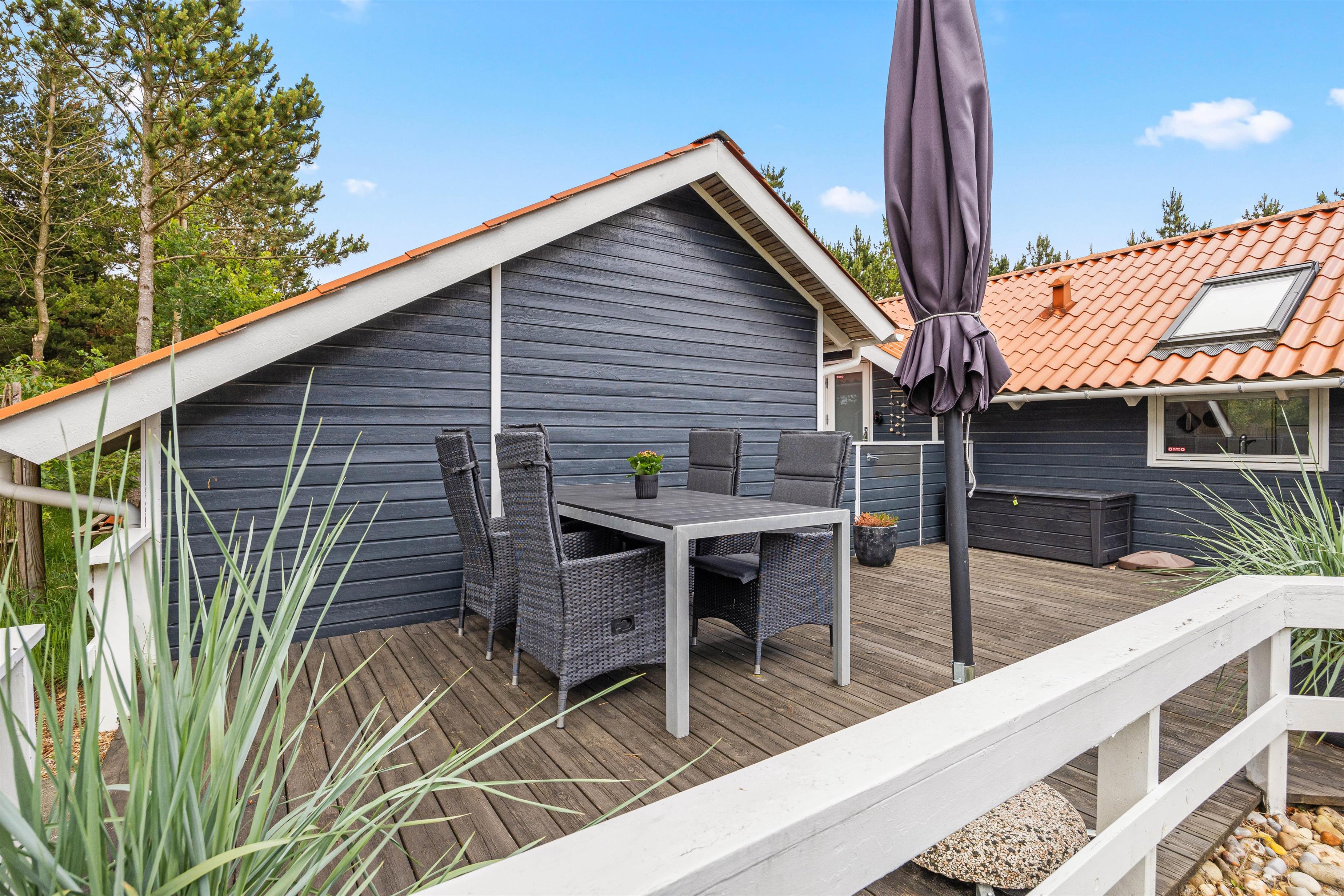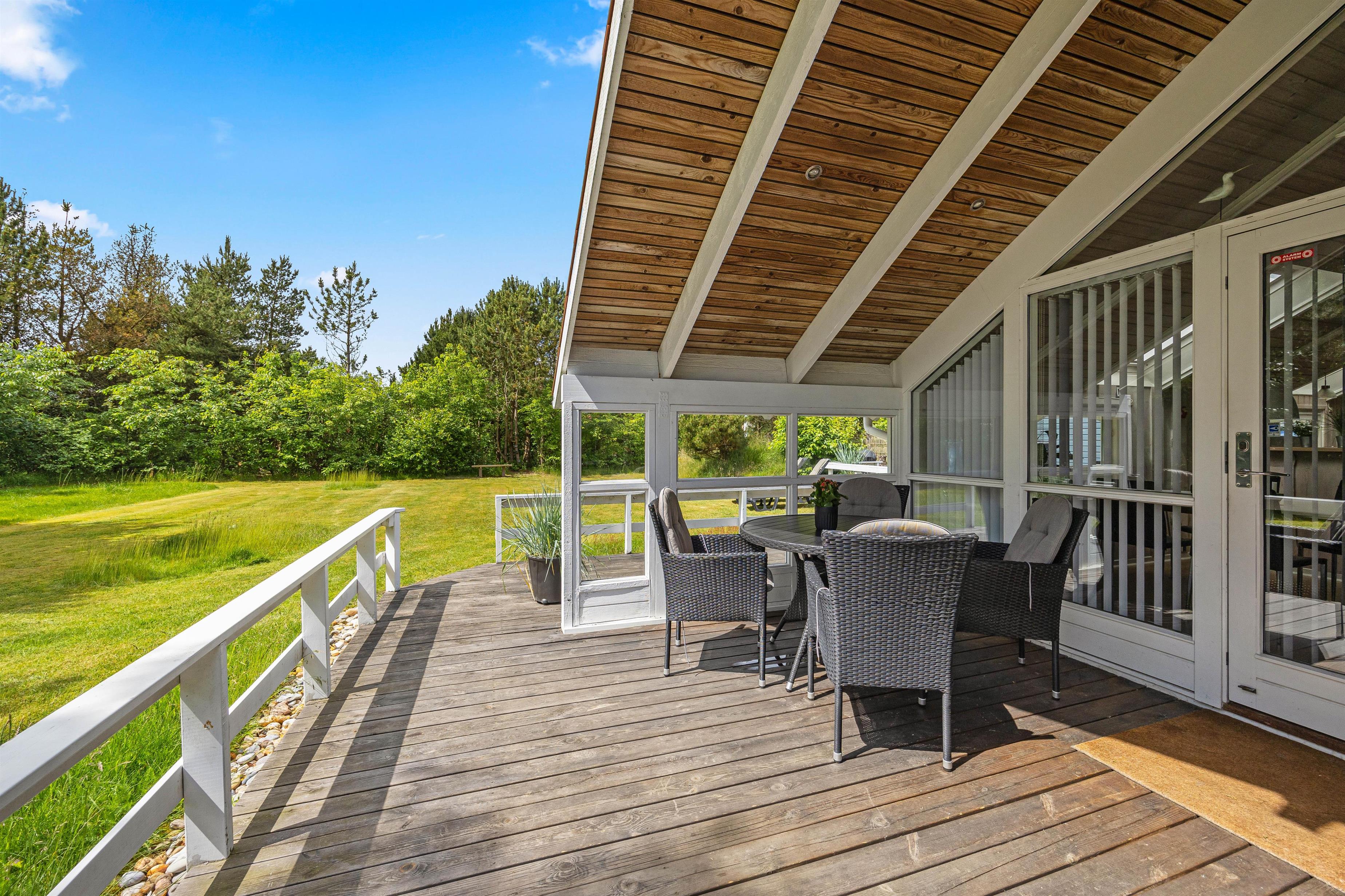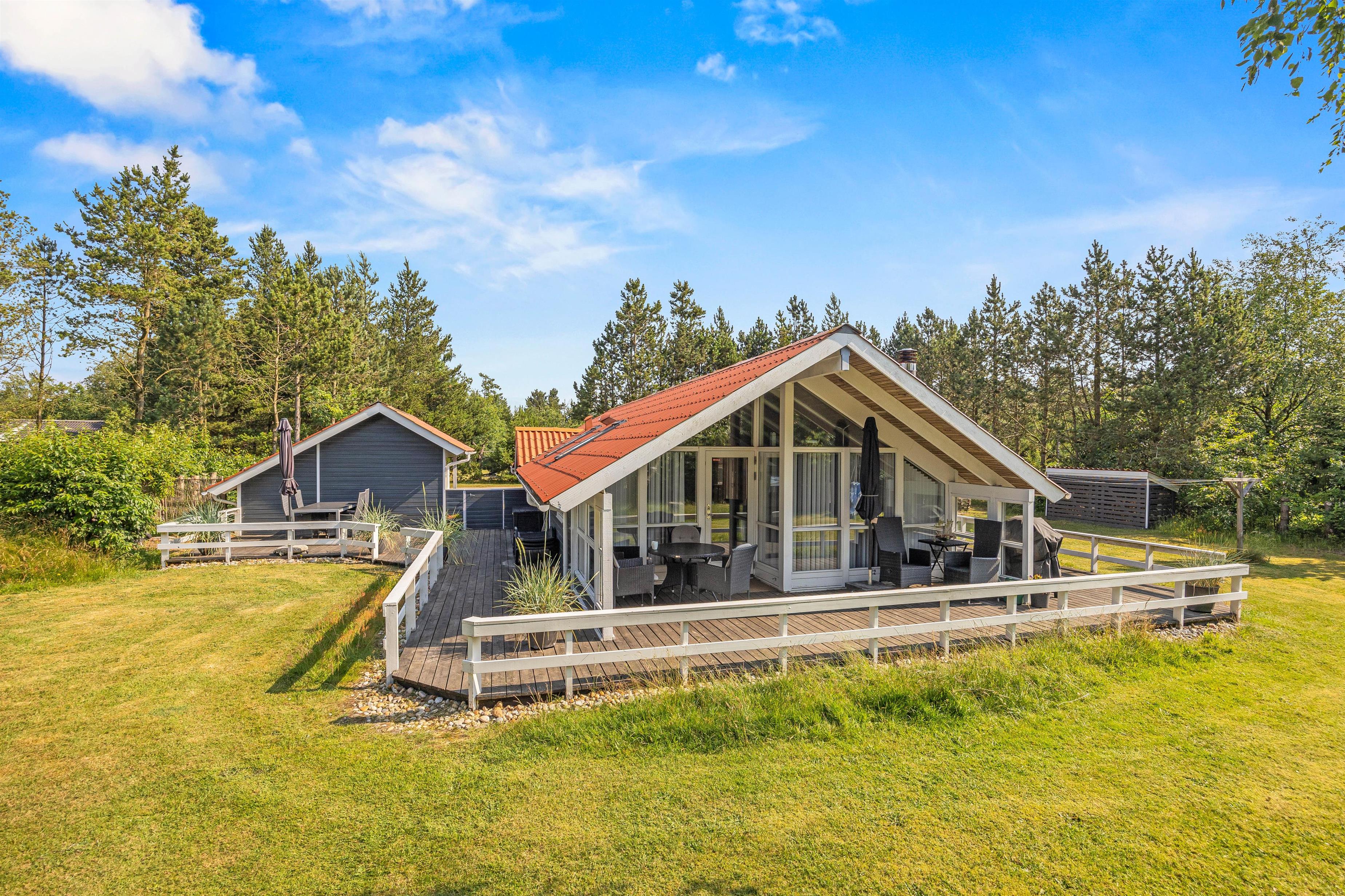 Rundt om størstedelen af sommerhuset er en terrasse, der både har en åben og en overdækket del, samt terrassen er afskærmet, så I næsten altid kan finde et sted med læ. Her står både havemøbler, solvogne og en grill til jeres rådighed, så I rigtig kan nyde en dag i haven. Både børn og hunde vil også elske det her, da den 1480 kvadratmeter store grund har en god plæne, hvor der er plads til boldspil og leg.