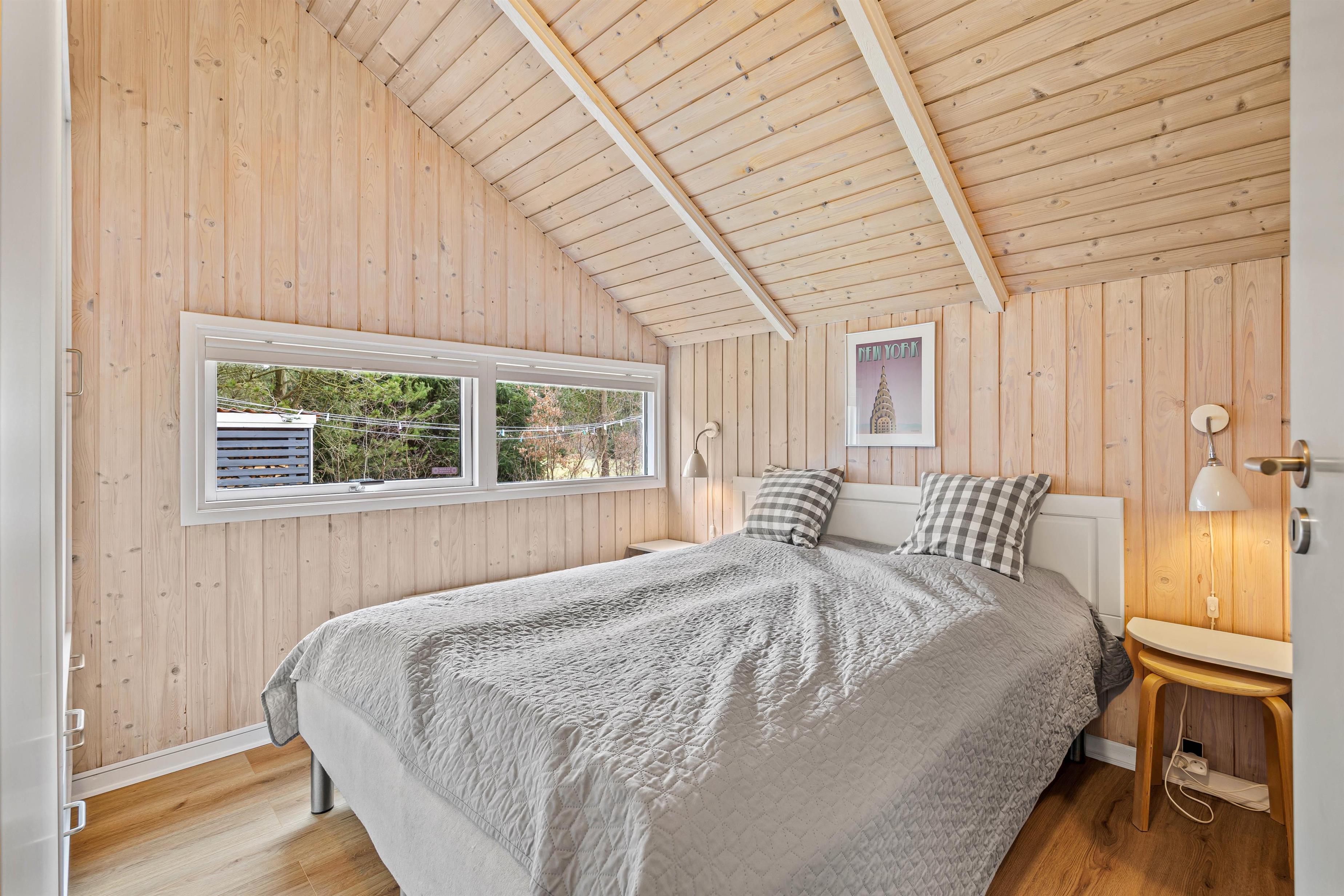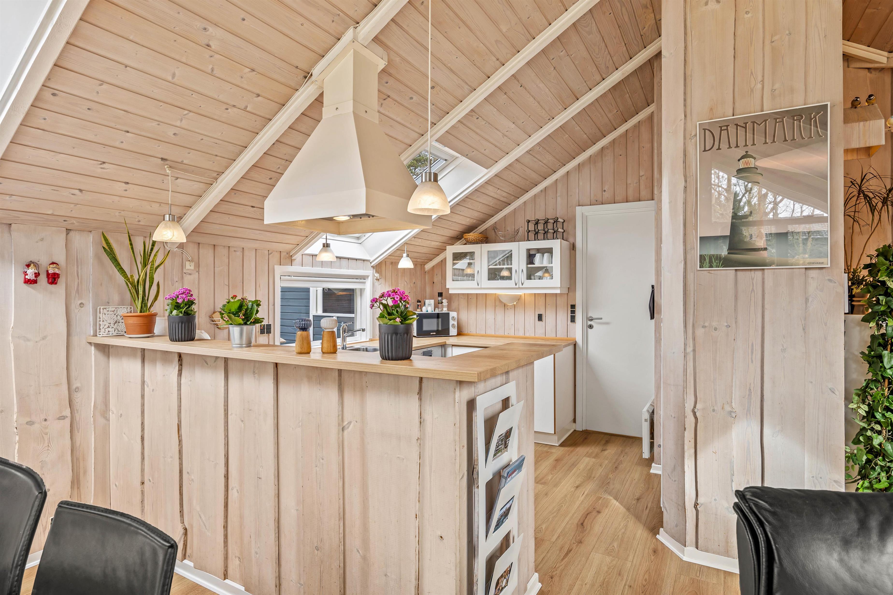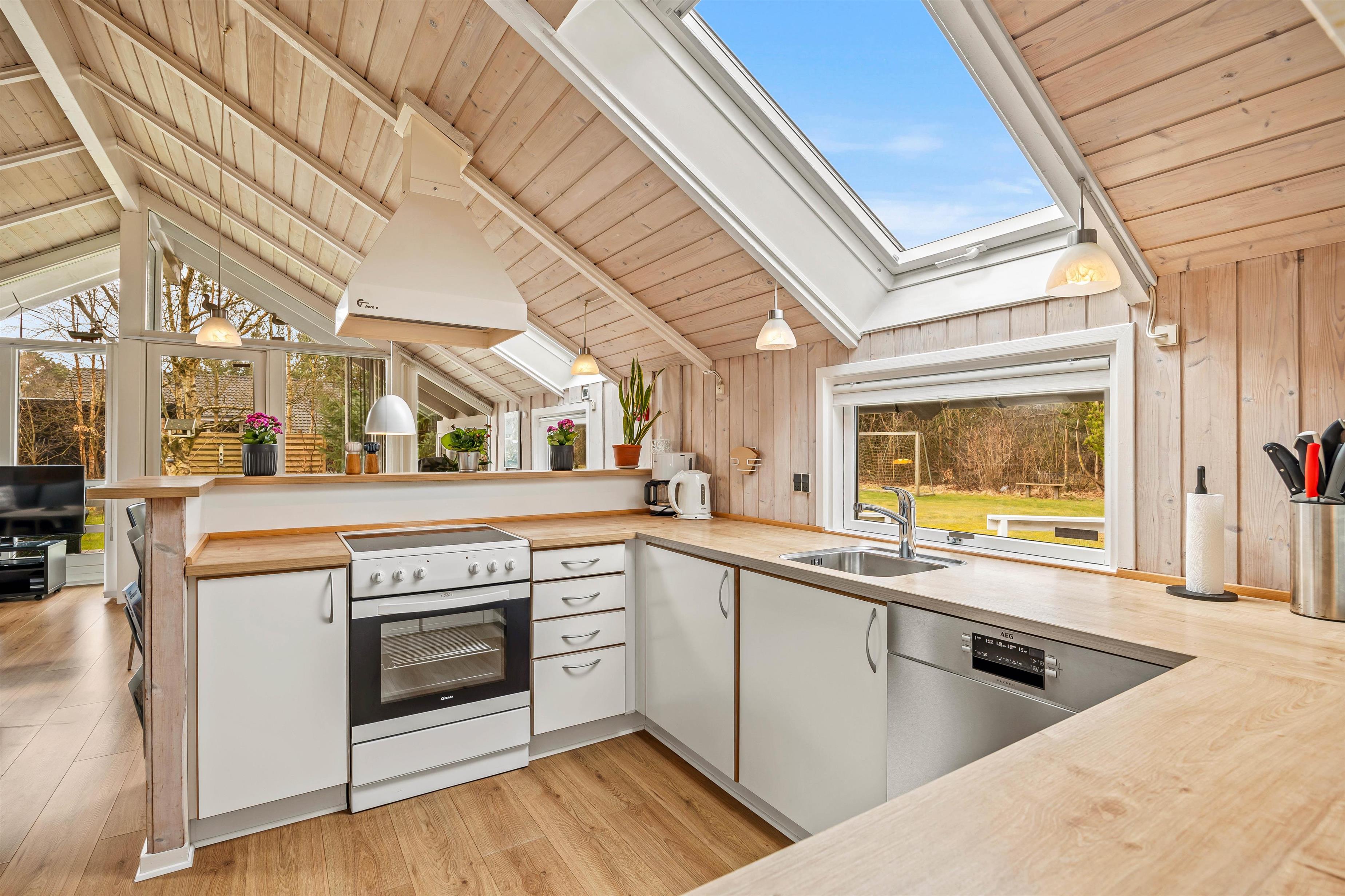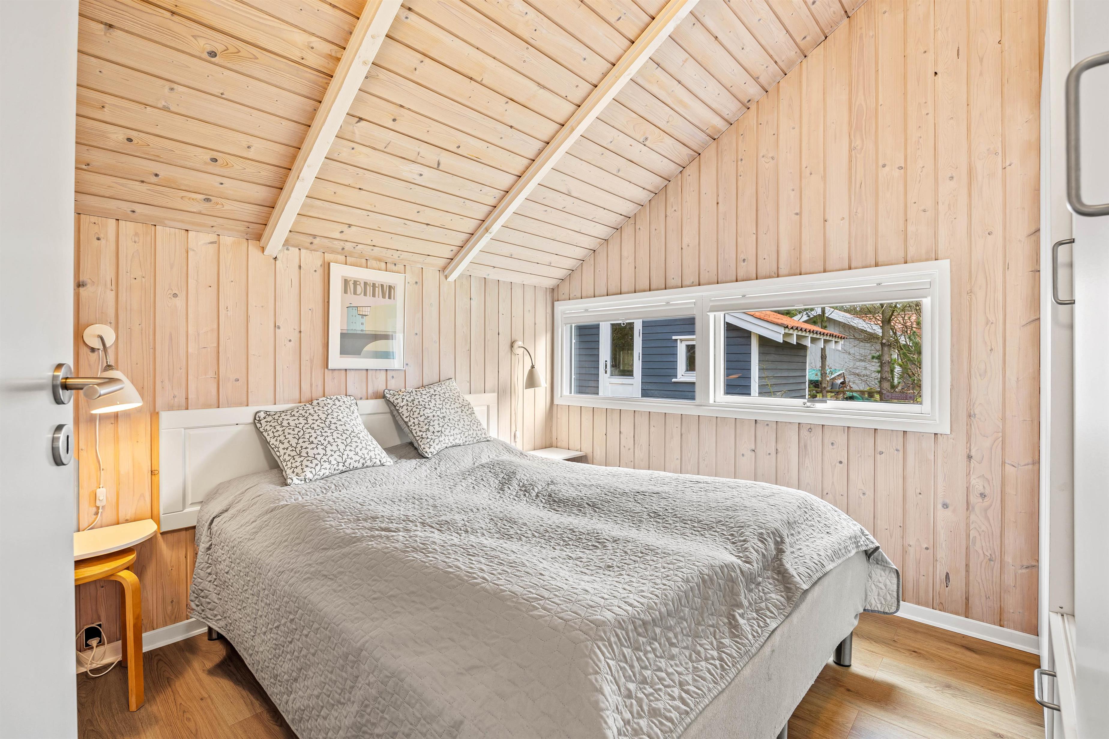 Sommerhuset fremstår lyst og indbydende, og på de 98 kvadratmeter er der blandt andet 3 gode soveværelser, som hver især er indrettet med en dobbeltseng, der måler 160 cm x 200 cm. Det store opholdsrum, hvor stue, køkken og spisestue er samlet, er det perfekte sted at nyde hinandens nærvær, mens I hver især laver noget forskelligt – lægger puslespil ved bordet, læser en bog i sofaen eller tilbereder lækre måltider.