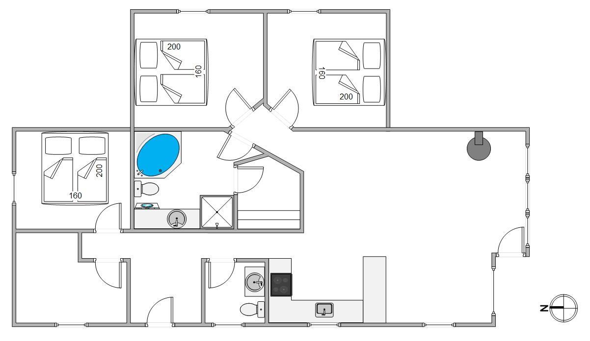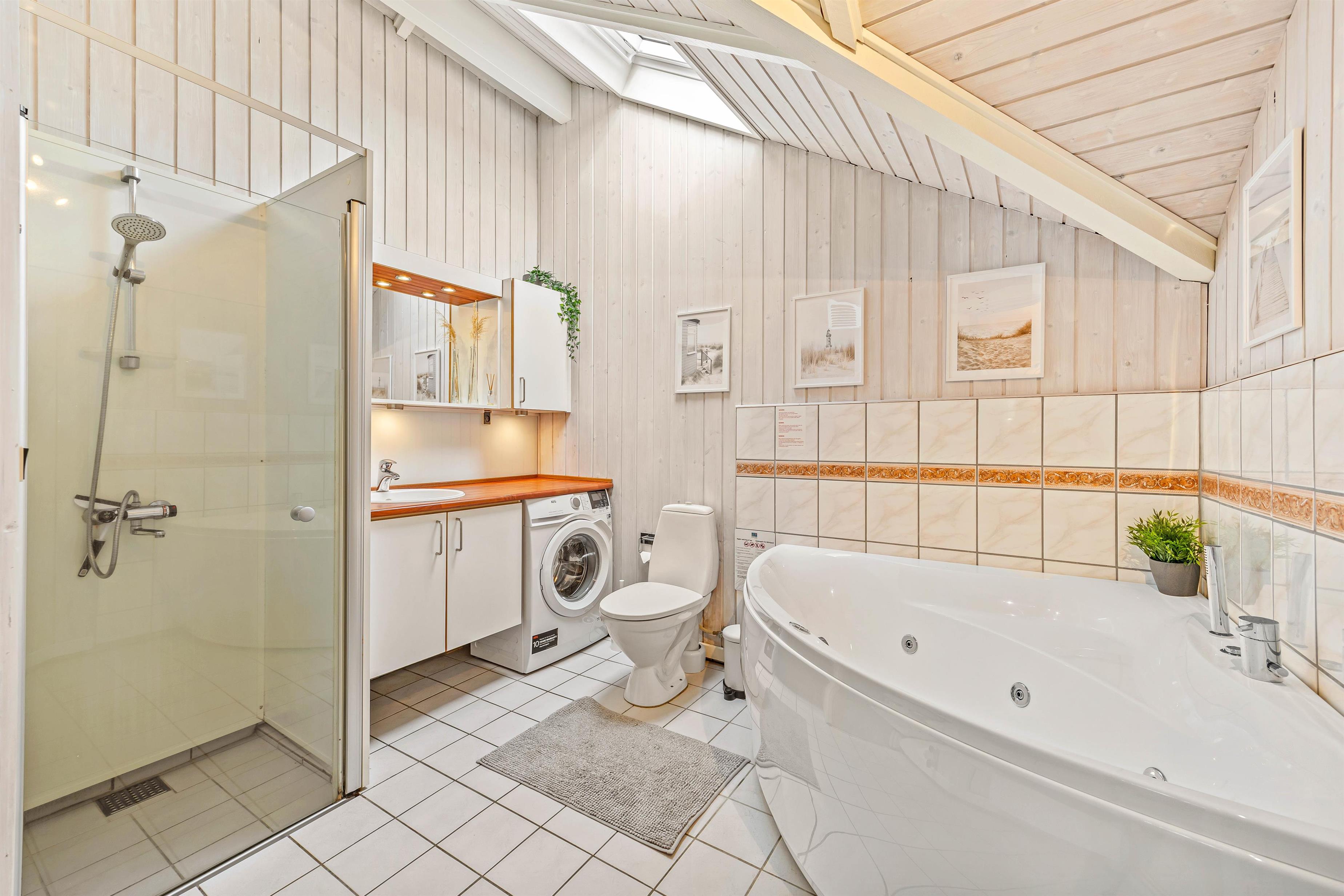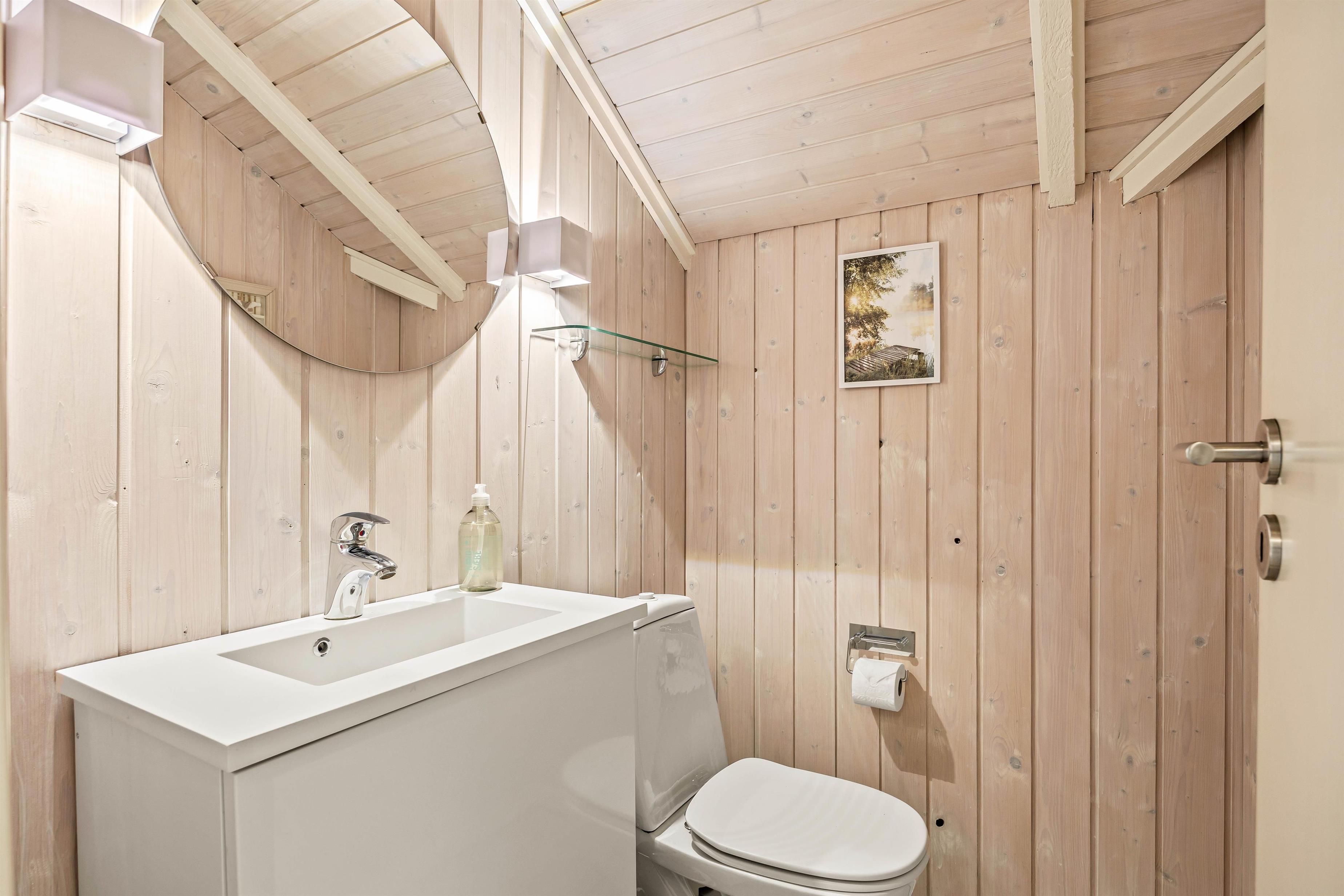 Der er både et gæstetoilet og et badeværelse med gulvvarme, så I ikke skal bekymre ger om kødannelse til toilettet, selvom I er 6 personer. På badeværelset finder I også sommerhusets sauna og spa, hvor I rigtig kan komme ned i gear og blive varmet helt igennem. Det er specielt lækkert efter en lang gå- eller cykeltur i Houstrups vidunderlige natur.