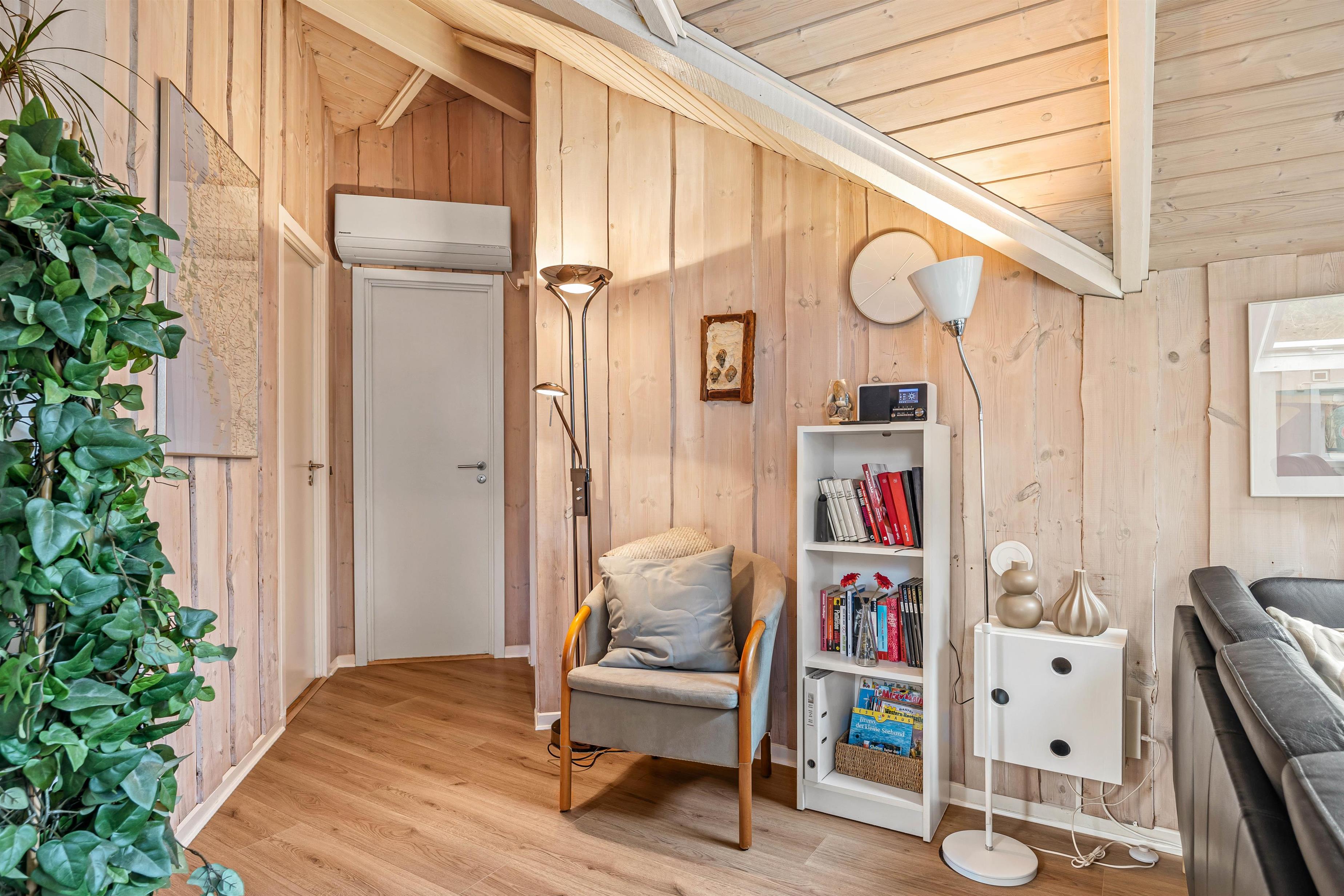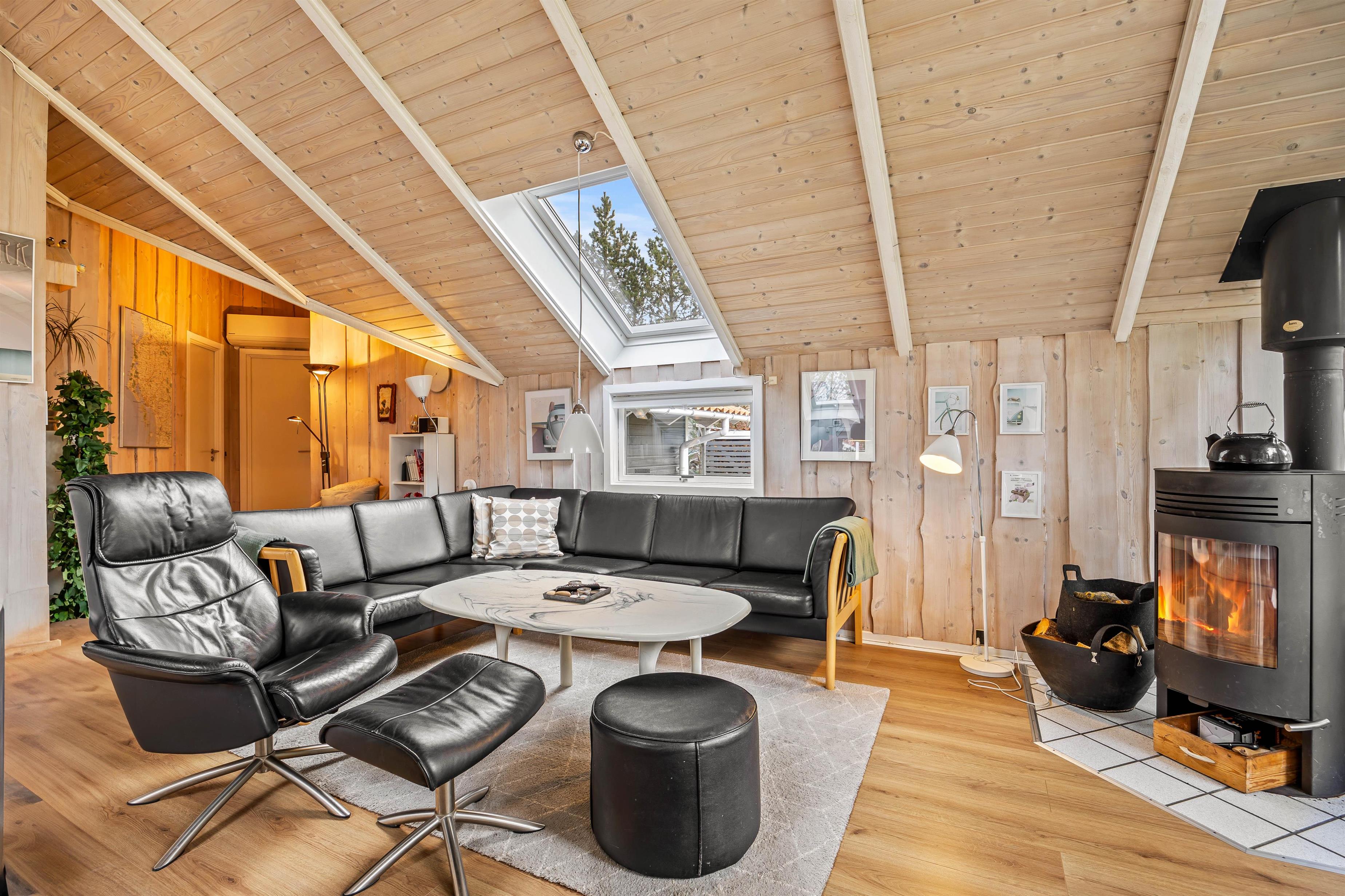 På værelserne er der el-radiatorer, som er et godt supplement til den mere energirigtige varmepumpe, så sommerhuset kan blive dejlig varmt, selv på de køligere dage. Varmepumpen sørger samtidig for cirkulation, der skaber et godt indeklima. Når hyggen skal op på næste niveau, kan I tænde op i brændeovnen og nyde de knitrende og dansende flammer, mens varmen breder sig.