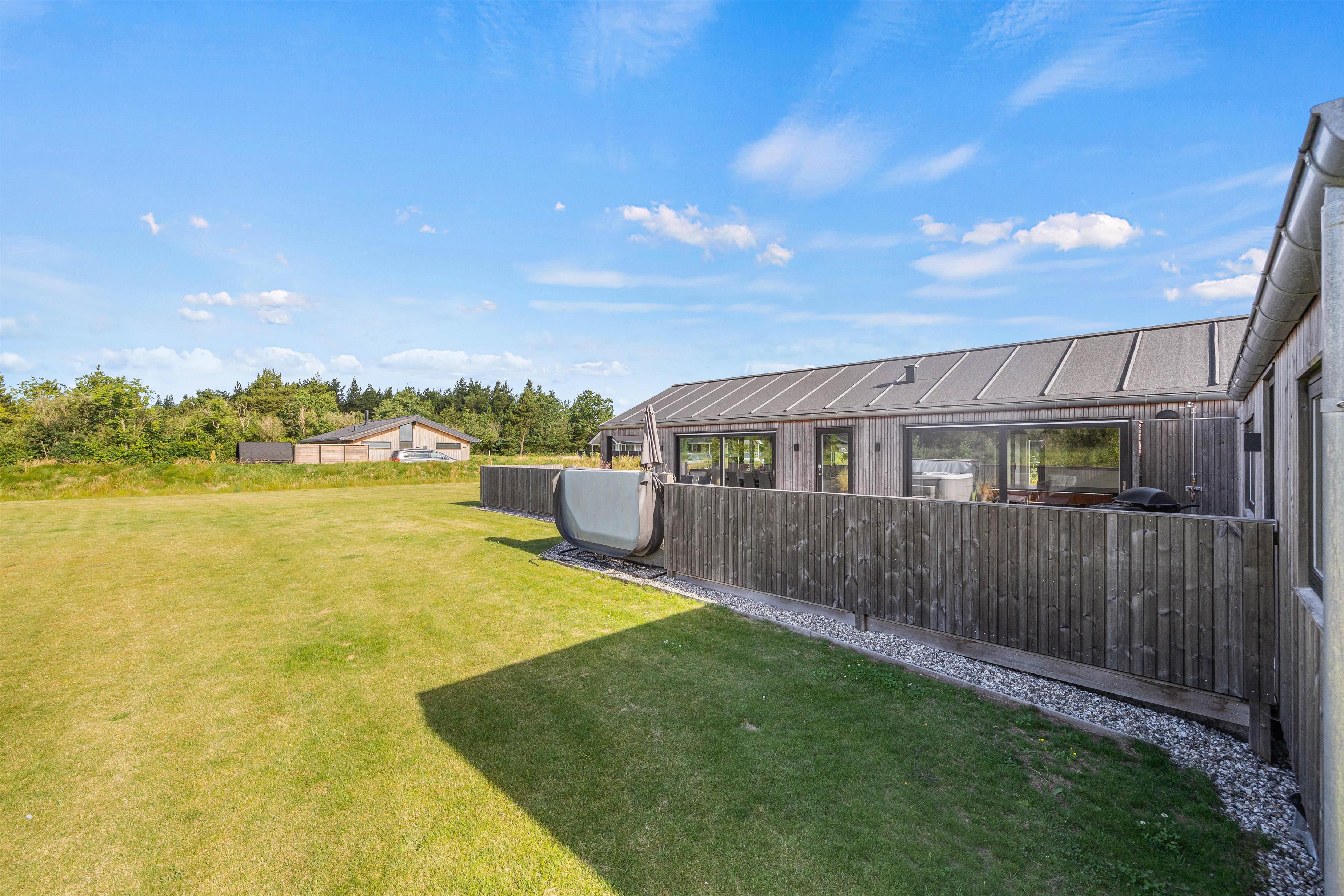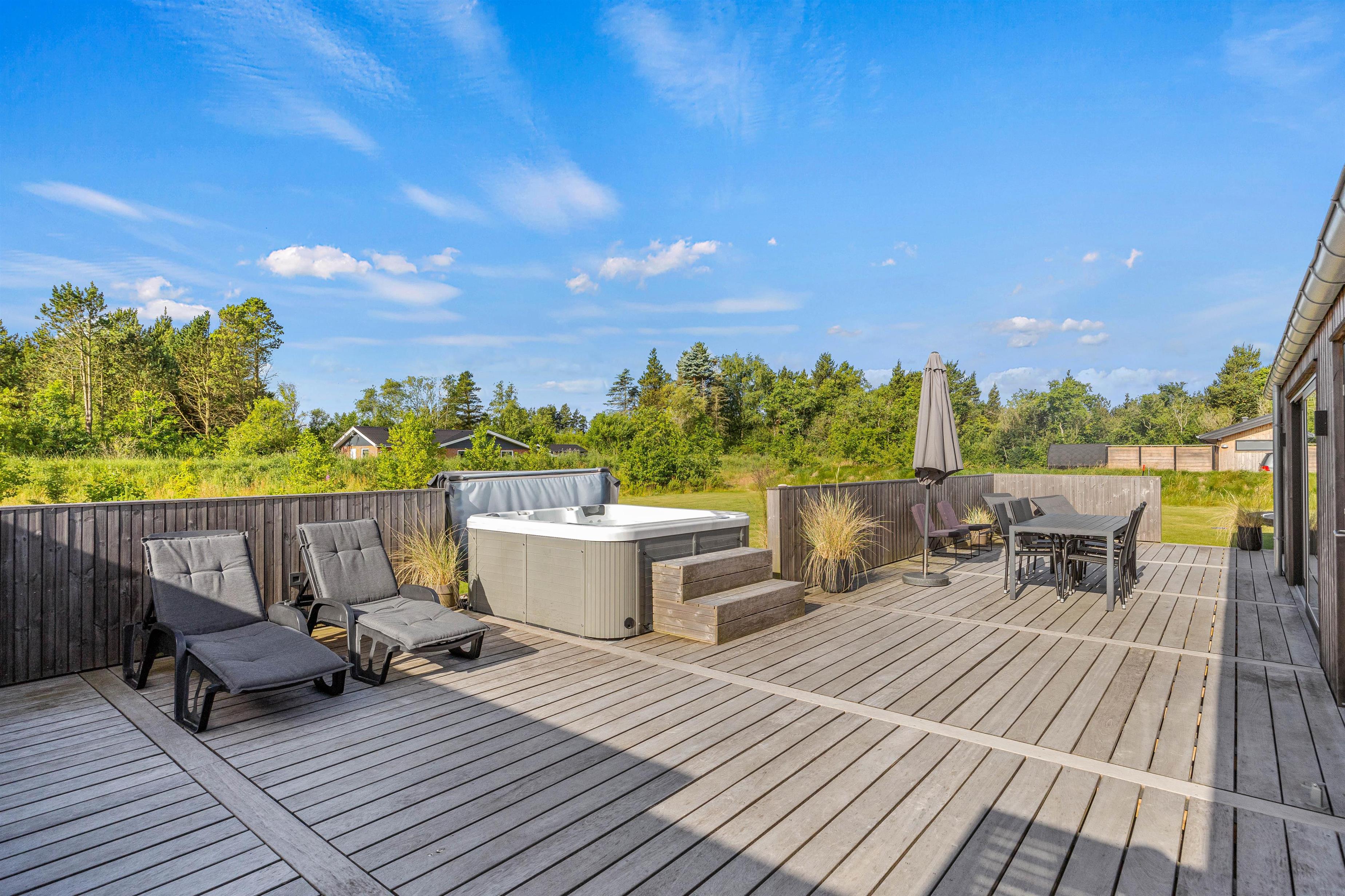 Sommerhuset har en stor lækker terrasse, der er delvist overdækket, hvor I finder en række lækre faciliteter. Her kan I forkæle jer selv med en tur i udespaen, hvor I kan nyde det varme, afslappende vand med en udsigt over den smukke og rolige natur, som sommerhuset er omgivet af. Desuden er der en udendørs bruser på terrassen, hvor I kan skylle jer inden en tur i udespaen eller efter en tur på stranden. Denne kan benyttes fra april til november.