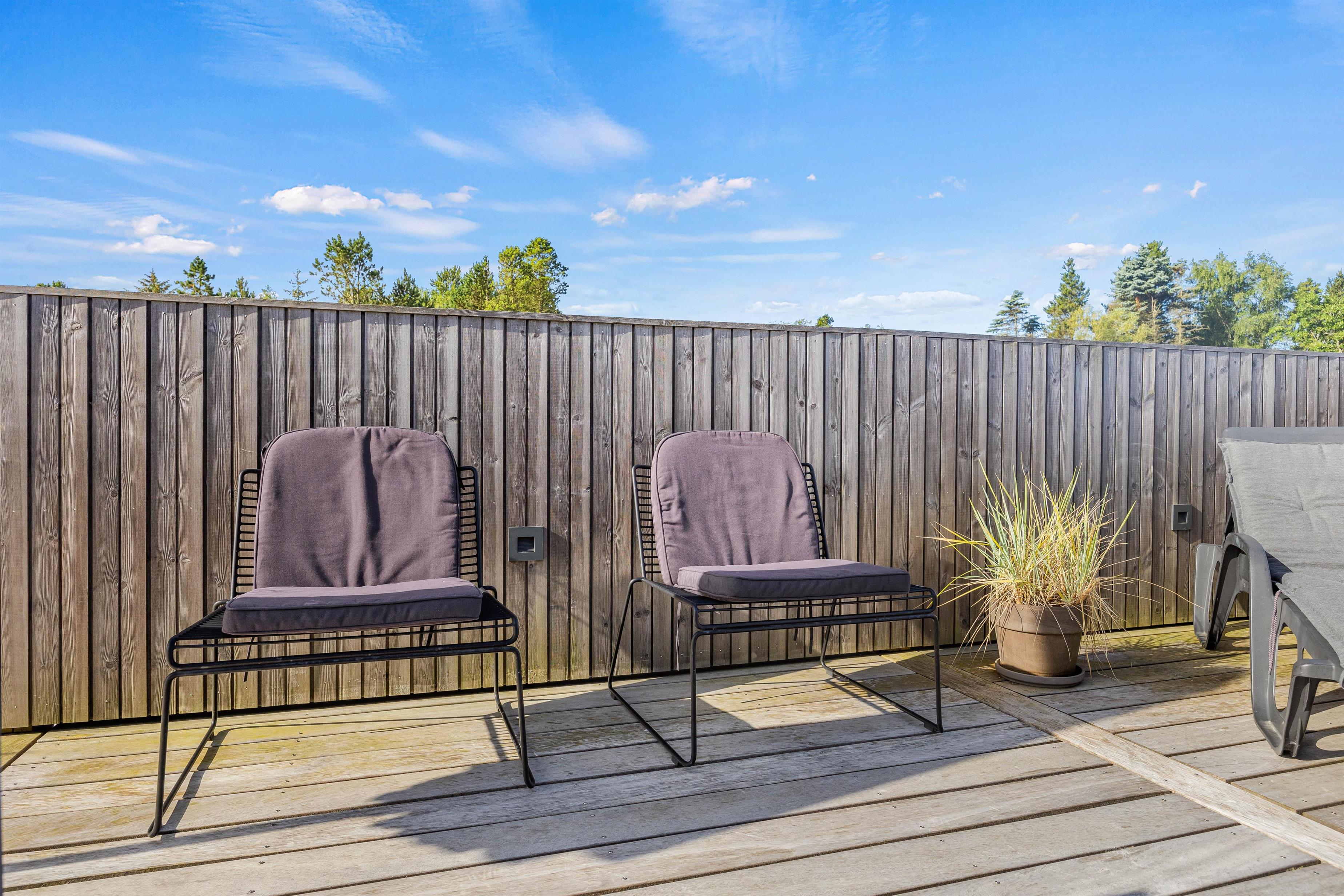 På terrassen er der liggestole, havemøbler og grill, og I kan derfor nyde de varme sommerdage fuldt ud, mens I er i sommerhuset. I kan ligge og suge solens stråler til jer i liggestolene om dagen, og om aftenen kan I samles i havemøblerne og nyde en lækker middag, der er lavet på grillen.