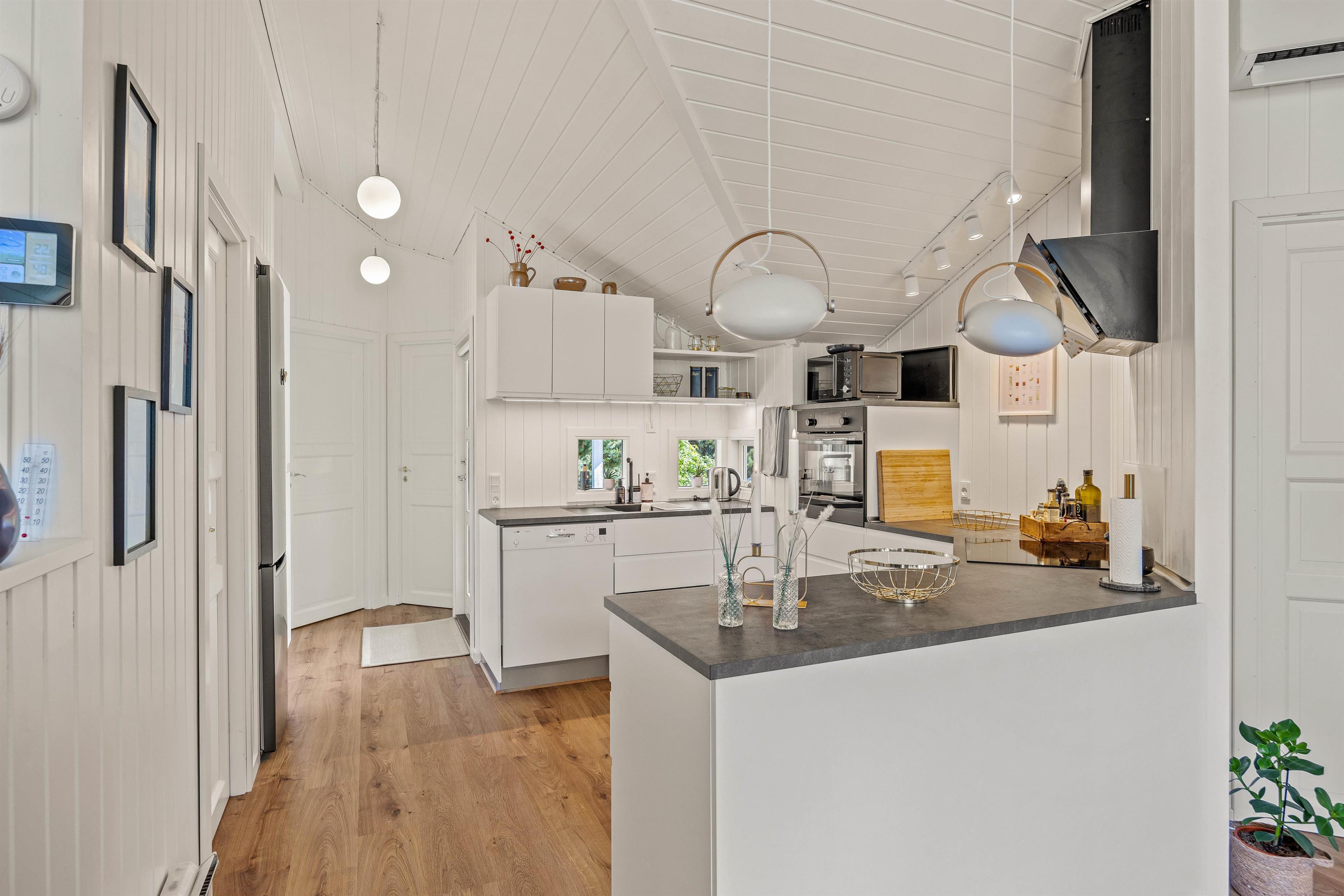 Træhuset er lyst og hjemligt indrettet, og den kombinerede spisestue med integreret nyt køkken (2022) er husets hjerte og bliver centrum for samvær i løbet af ferien. De store vinduesfronter lader solens lys slippe ind og giver jer samtidig en flot udsigt ud over haven og naturen, som I bor midt i. Efter maden kan I sætte jer godt til rette i sofaen og nyde varmen fra brændeovnen, mens opvaskemaskinen klarer oprydningen for jer.