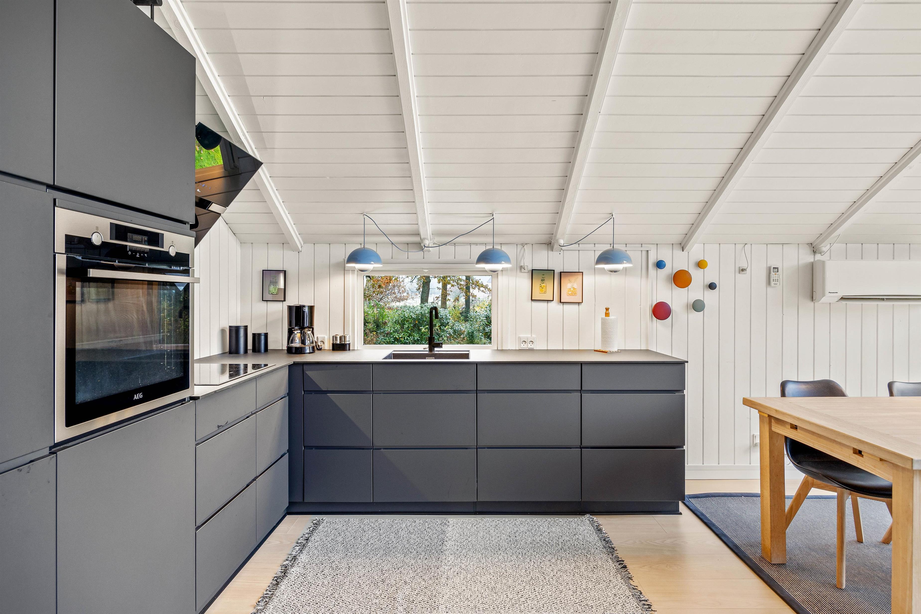 Indenfor venter en indbydende åben planløsning, hvor køkkenet forbindes sømløst med spisestuen og stuen, hvilket gør det nemt for jer at være sammen, uanset om I laver mad eller slapper af. I stuen finder I Chromecast, der gør det enkelt at nyde film og serier, mens den hyggelige brændeovn tilfører en autentisk sommerhusstemning.