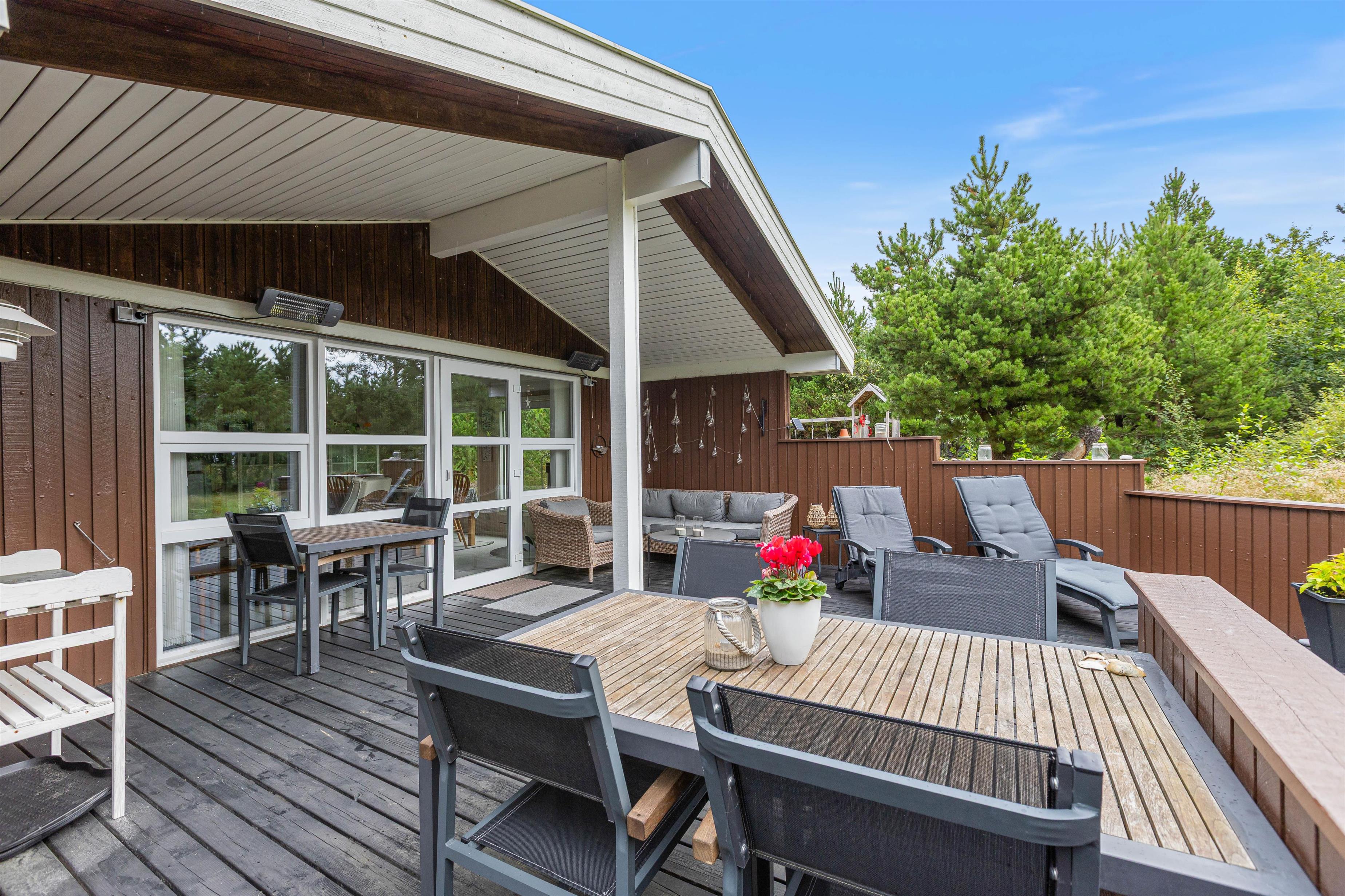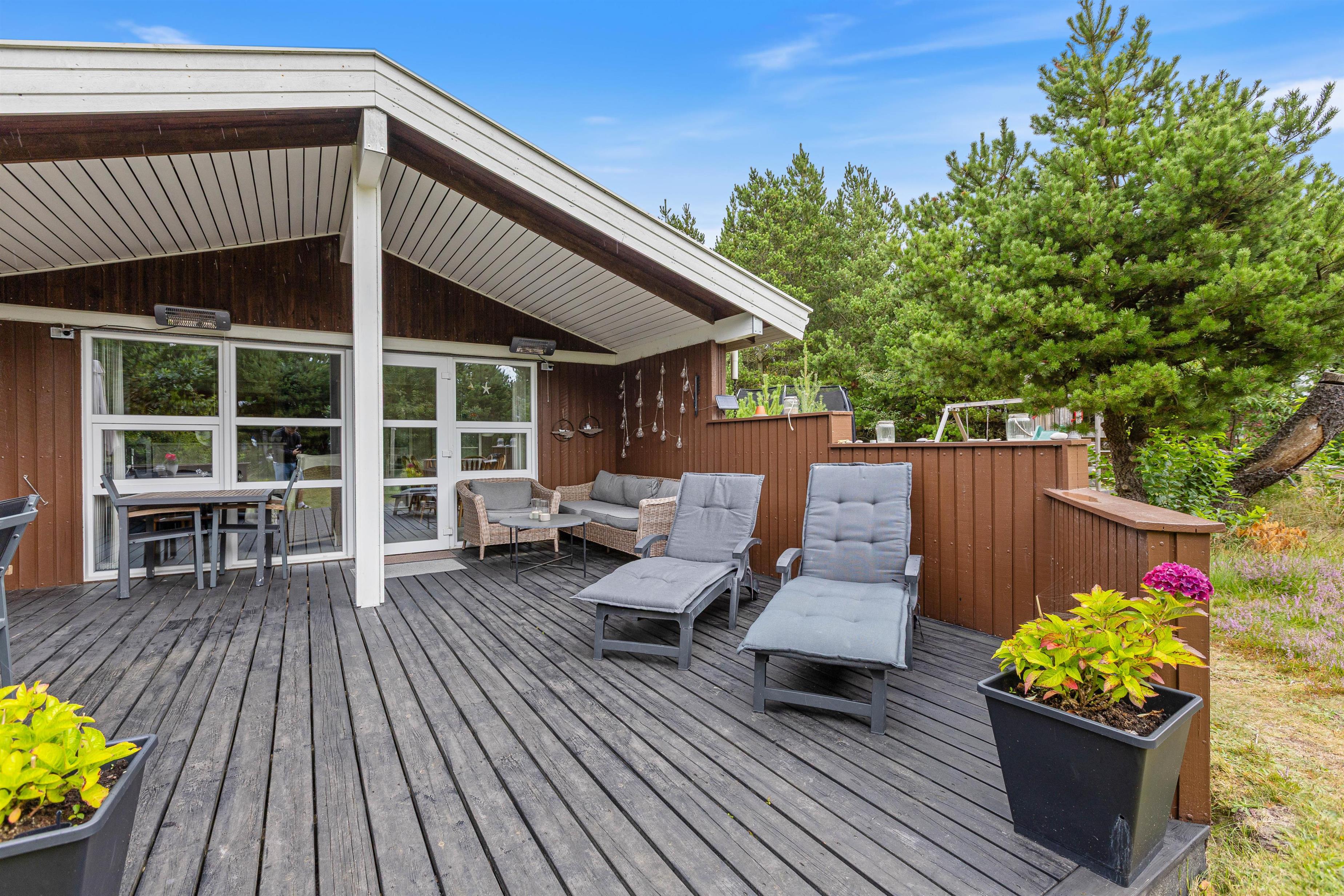 På Kirkeflod 3 kan I nyde solen lige fra morgen til aften, da solen vil være at finde på alle Feriehusets terasser. I har den store terasse som vender mod syd, her vil I have rig mulighed for at nyde solen fra i står op oghelt til aften. På den lille terasse der er vestvendt, vil I kunne nyde solen om eftermiddagen og sidst men ikke mindst, vil I kunne nyde aftensolen på den lille flisebelagte terasse som I finder i det sydøst vendte hjørne af haven. På den østvendte terrasse kan I nyde morgensolen, og om sommeren er den perfekt til at nyde den friske luft og solskin til morgenmaden.