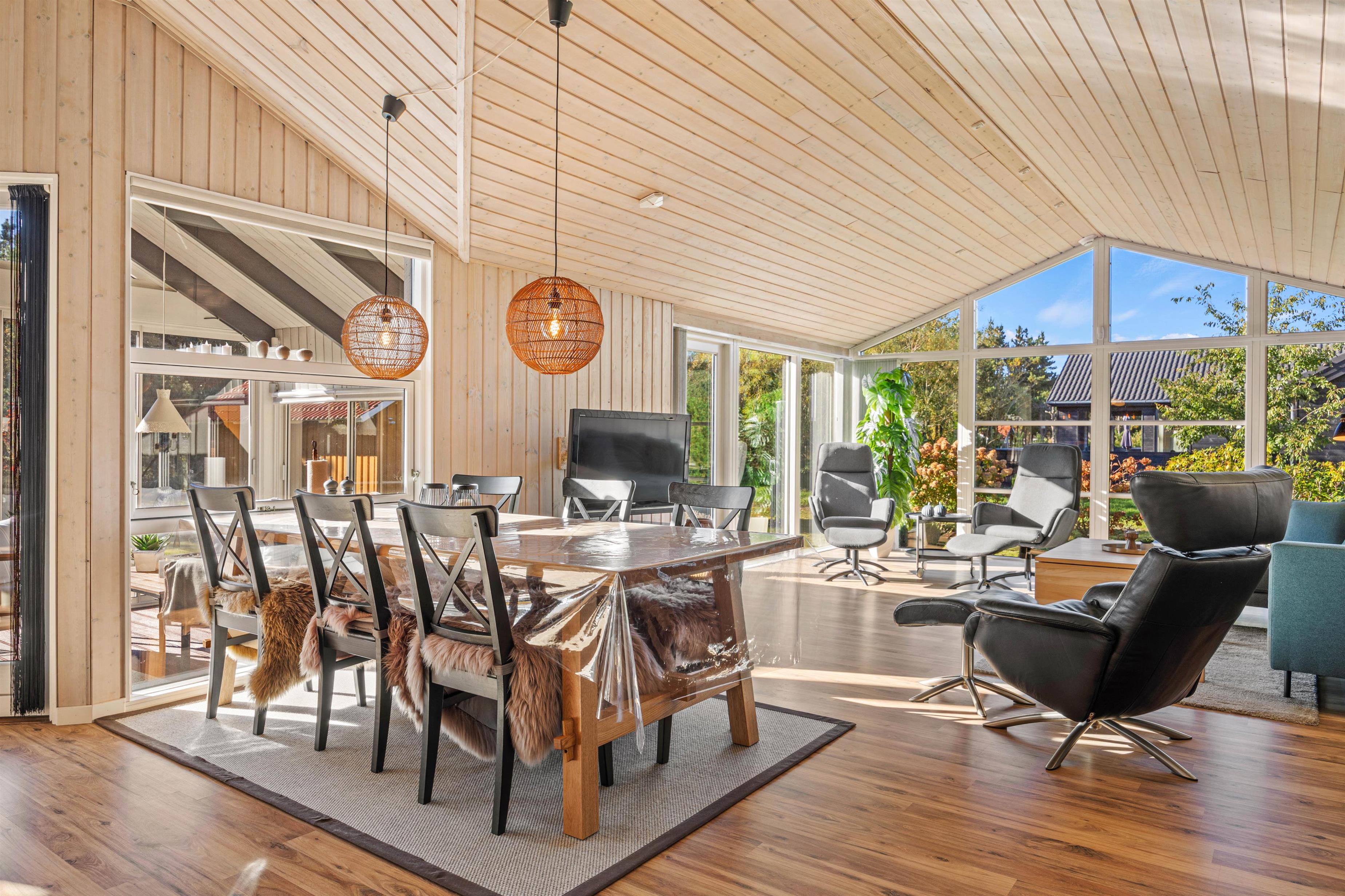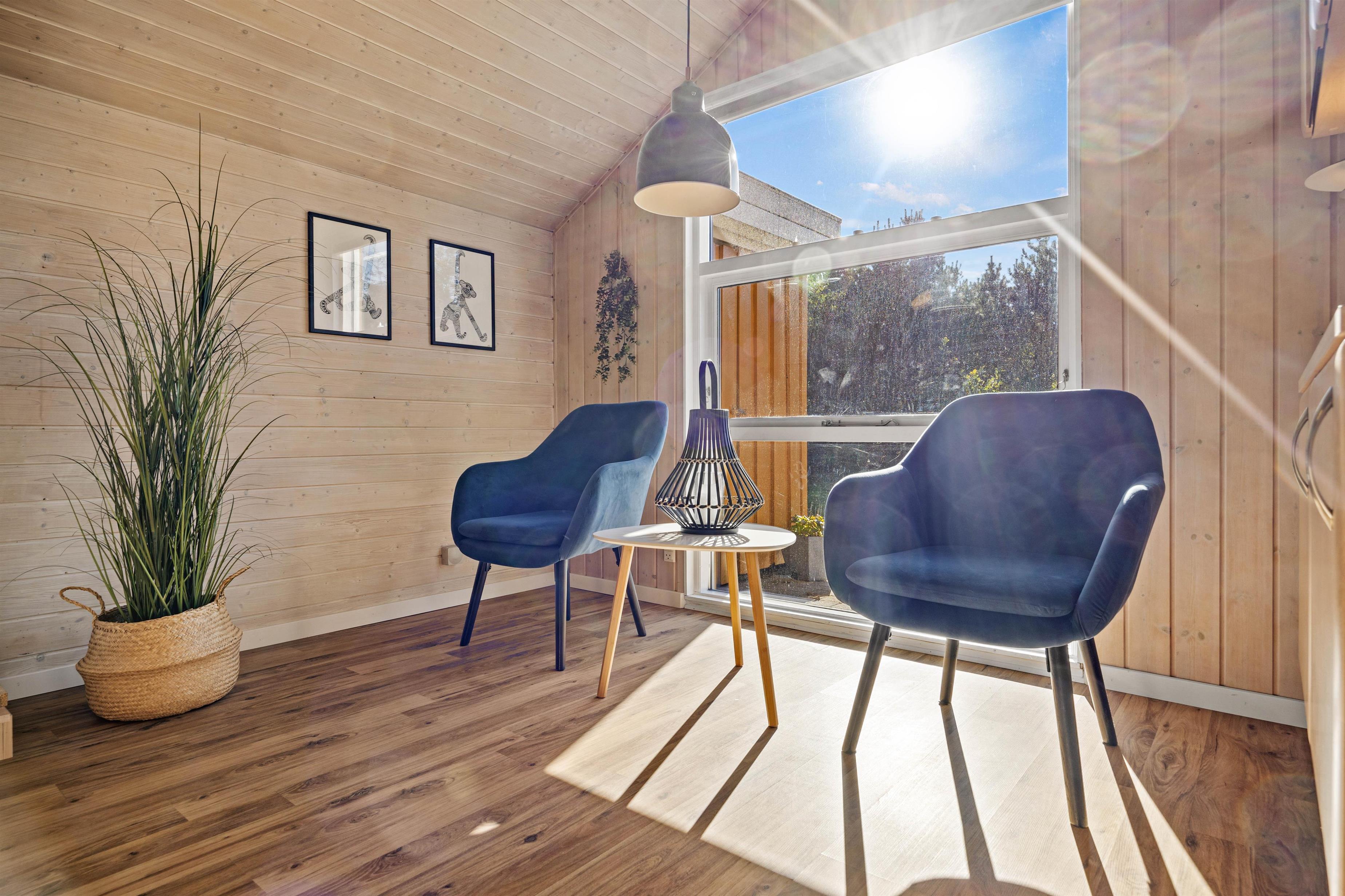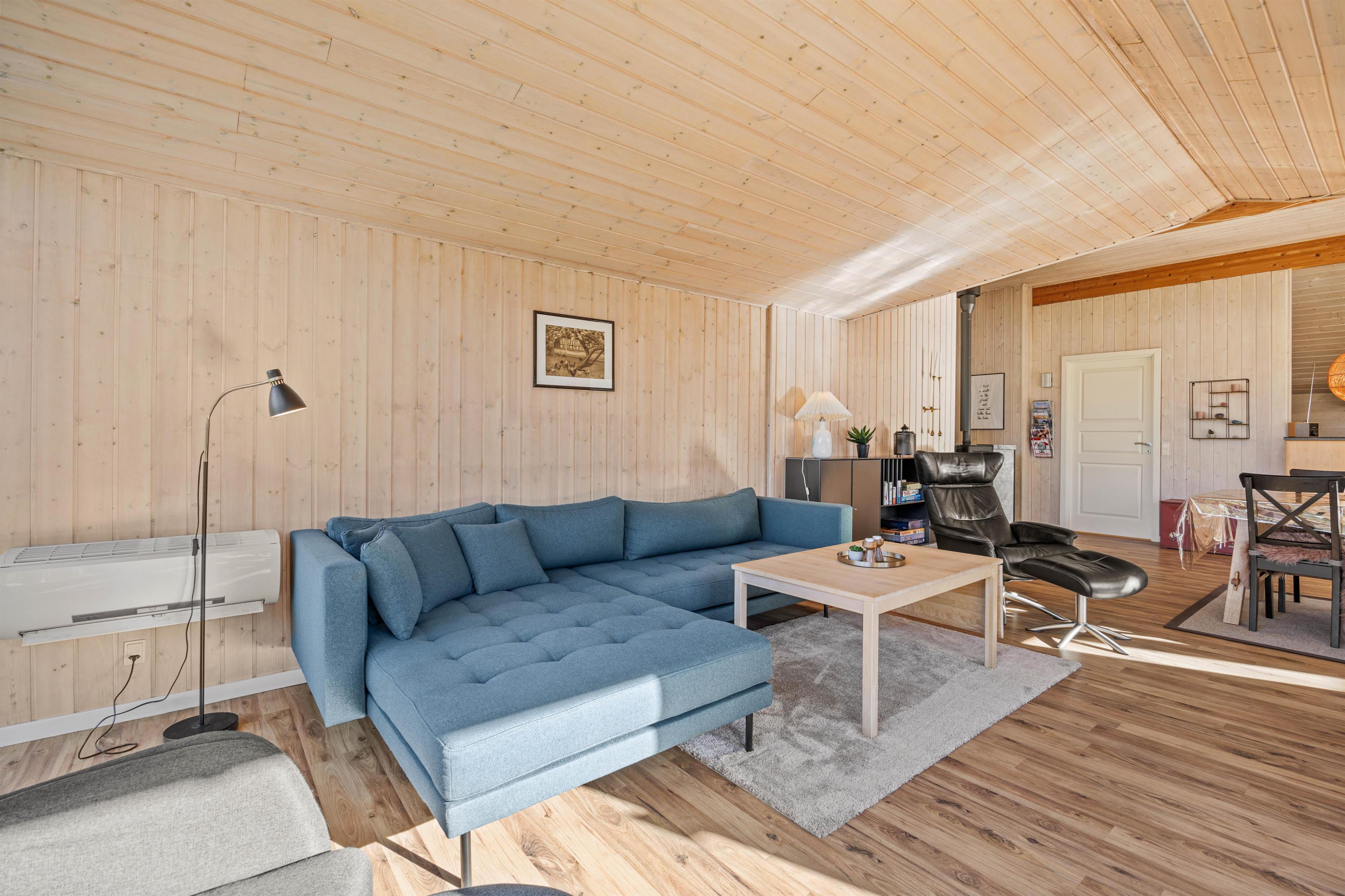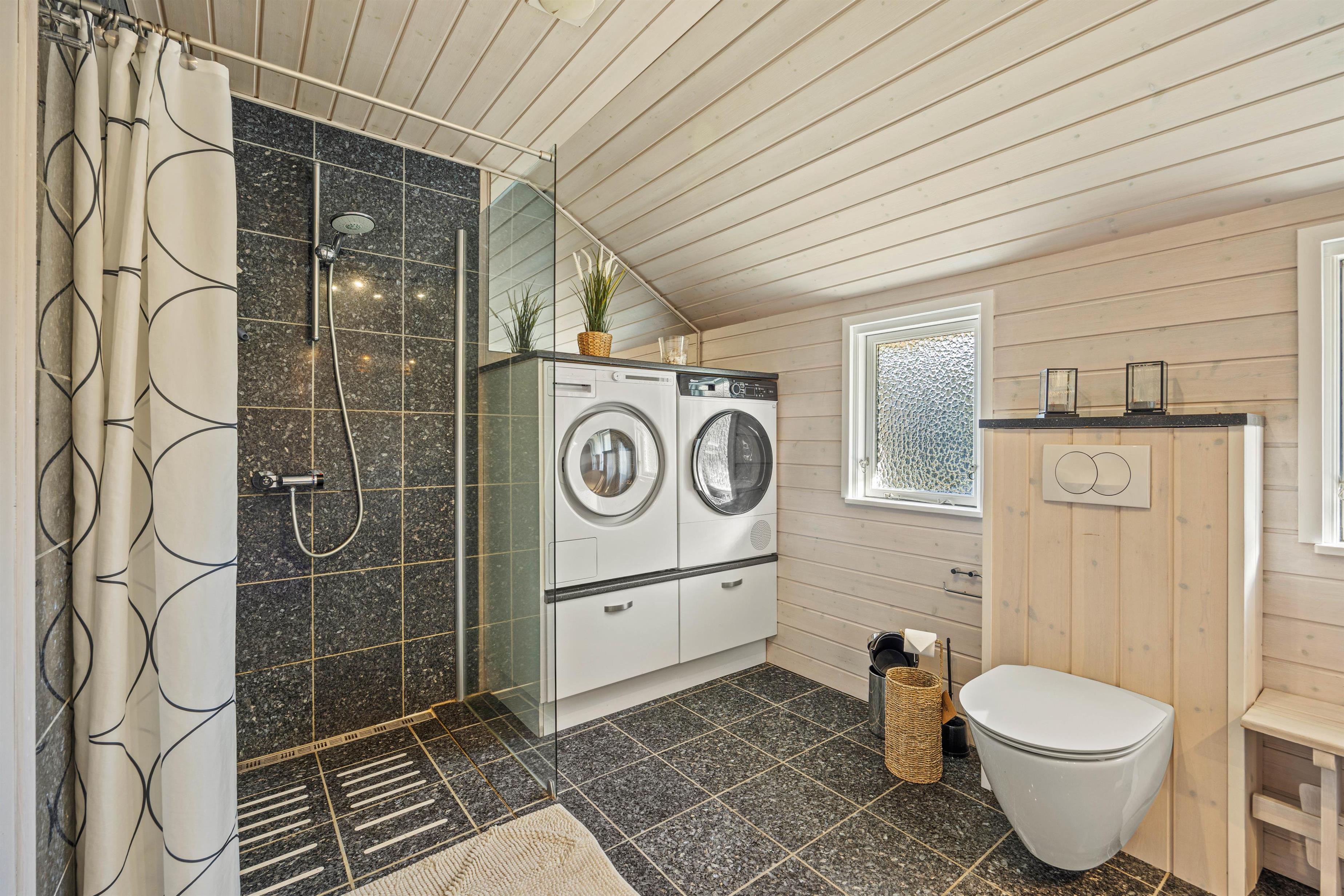 Når du træder ind i huset, bliver du straks mødt af udestuens lysfyldte rum, hvorfra du kan nyde udsigten til den omkringliggende natur. Bevæger du dig videre, møder du stuen med sin brændeovn, der skaber en varm atmosfære, perfekt til hyggelige stunder. Efter en lang dag kan I desuden slappe af i husets sauna og lade roen sænke sig. Begynder maverne at rumle, kan du nemt begynde madlavningen i det rummelige køkken, som nemt klarer oprydningen med den praktiske opvaskemaskine, og takket være både vaskemaskine og tørretumbler kan du uden besvær tage dig af de praktiske gøremål.
