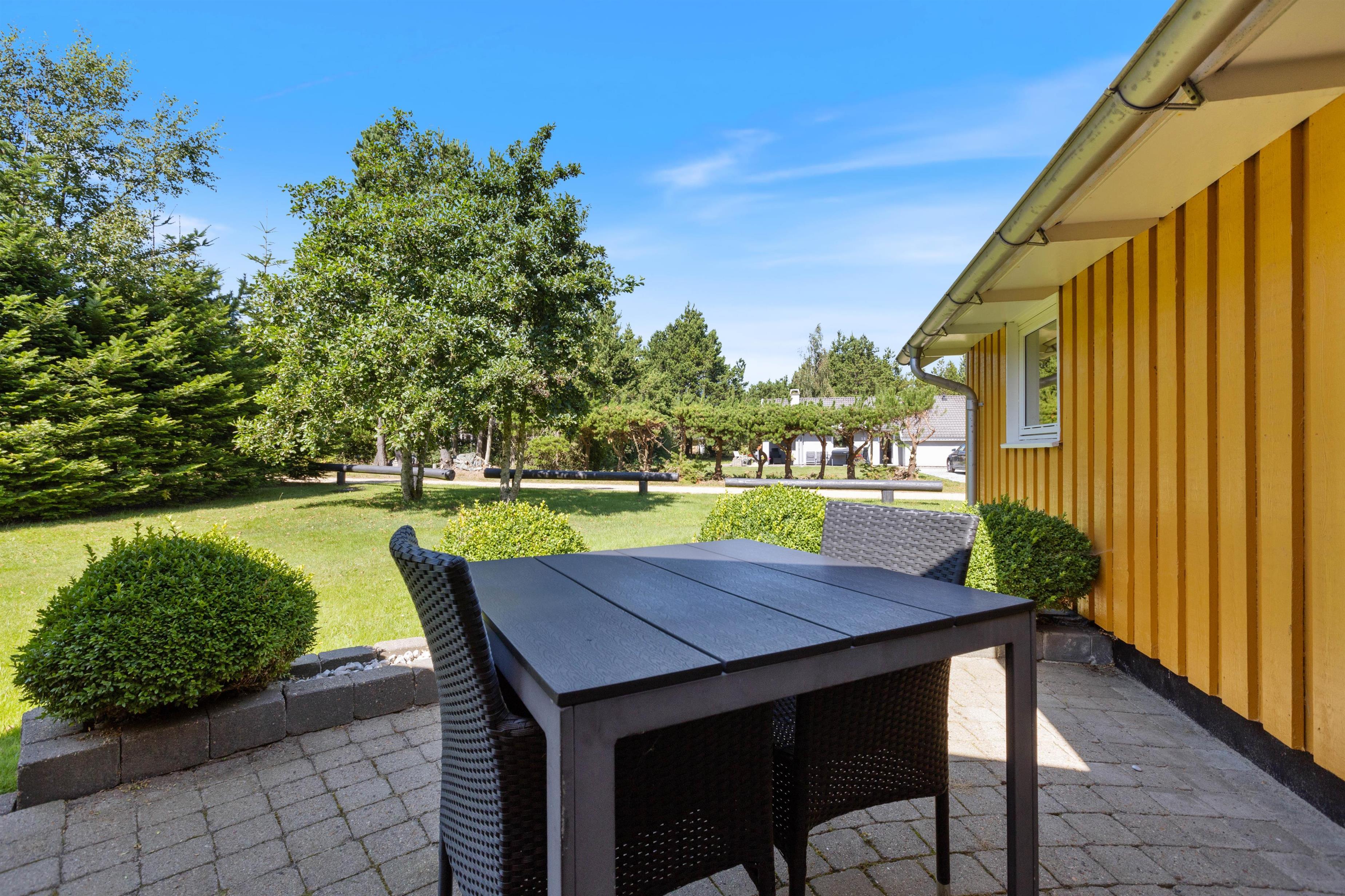 Sommerhusets udendørsområder byder på en række muligheder for både afslapning og aktivitet. Plænegrunden er et ideelt sted for udendørs spil og leg, hvor hele familien kan samles til sjov under den åbne himmel. Den afskærmede terrasse giver et skønt privatliv, hvor I kan nyde måltider al fresco, tilberedt på grillen, og skabe minder om lange sommeraftener. Her kan I slappe af, læne jer tilbage og nyde solens varme eller nyde en stille stund under stjernerne. På grunden finder I også et praktisk redskabsrum, hvor havemøbler, cykler eller andre udendørseffekter kan opbevares sikkert, hvilket sikrer, at I har alt, hvad I behøver for en uforstyrret ferieoplevelse i det fri.
