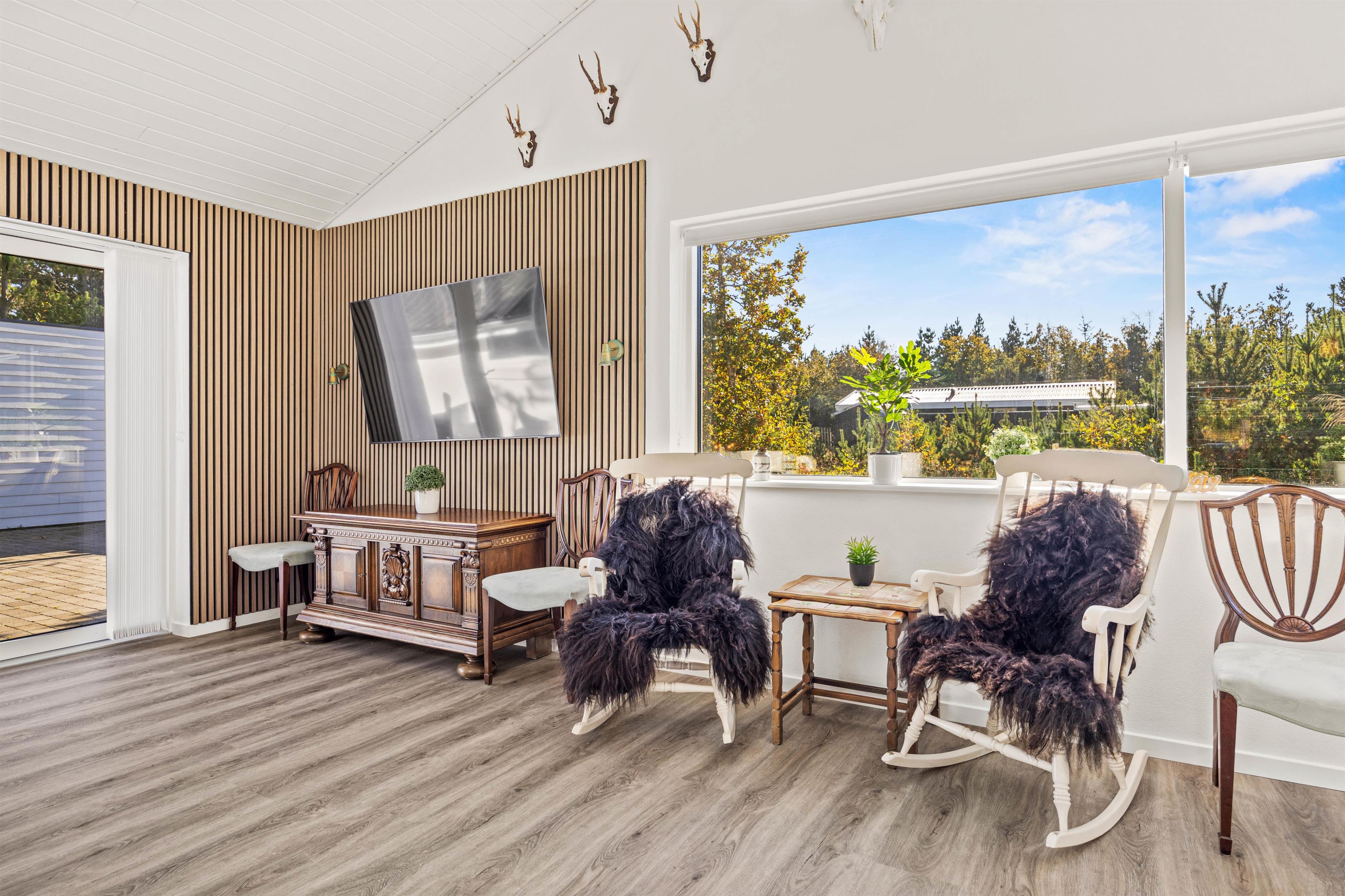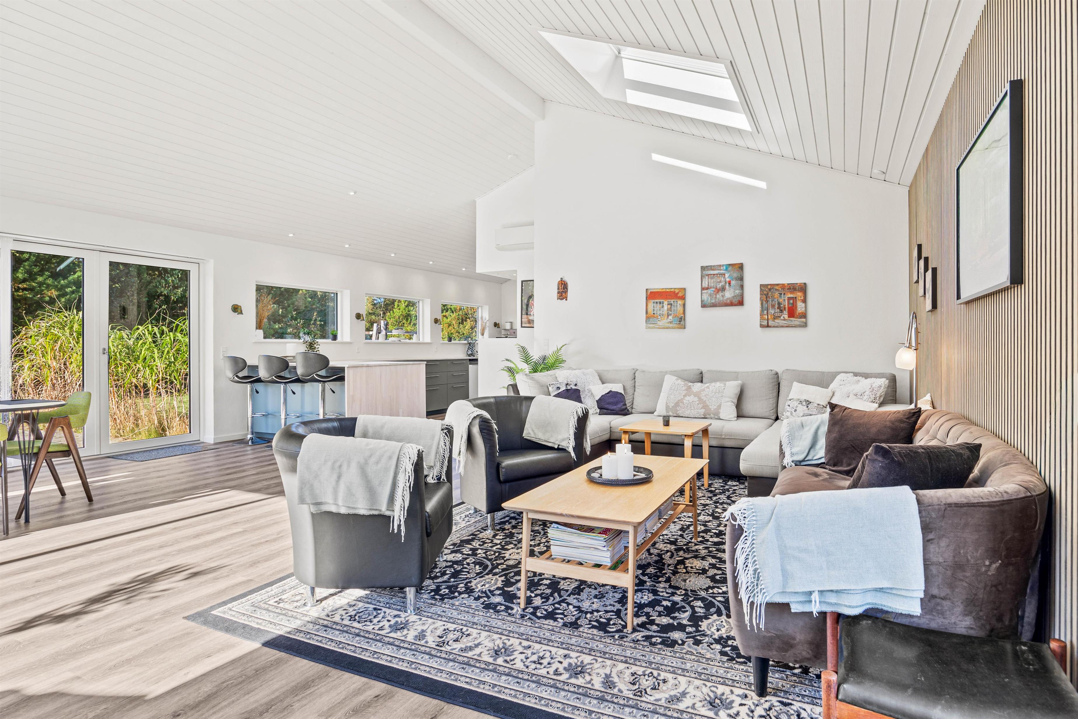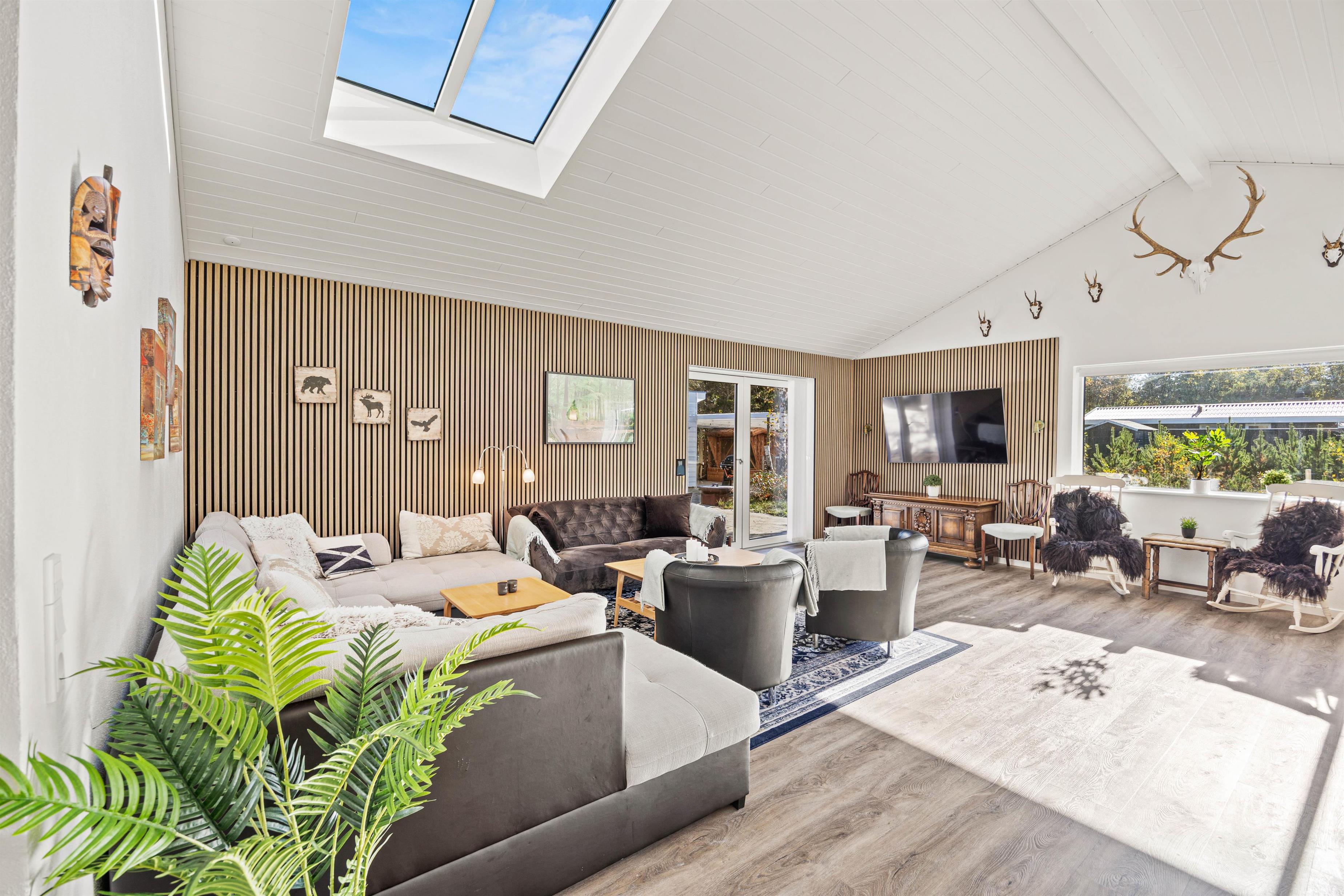 Sommerhuset i Houstrup imponerer med sin smagfulde indretning, hvor intet er overladt til tilfældighederne. Sommerhusets hjerte er den åbne opholdsstue med højt til loftet og store vinduespartier, som lukker masser af naturligt lys ind. Her kan I nyde rolige aftener foran fjernsynet eller lytte til jeres yndlingsmusik via Bluetooth-højttaleren. Den energibesparende varmepumpe sørger for den perfekte temperatur og et behageligt indeklima året rundt.