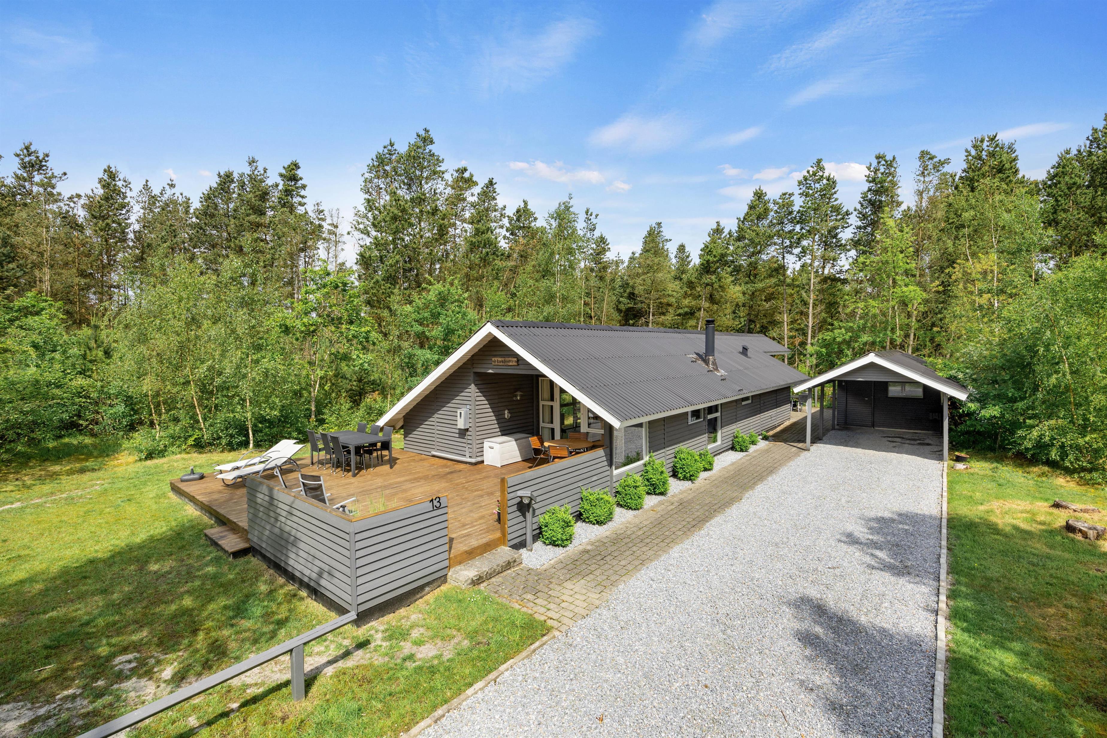 Direkte fra sommerhusets stue kan i træde ud på sommerhusets store afskærmede terrasse. Den store terrasse giver masser af plads til hele familien at nyde solen eller slappe af i skyggen. Der er rigeligt med udendørs møbler til rådighed, herunder en grill til lækre udendørs måltider, havemøbler til afslapning, solvogne til at nyde solen og en parasol til at skabe skygge på varme dage.