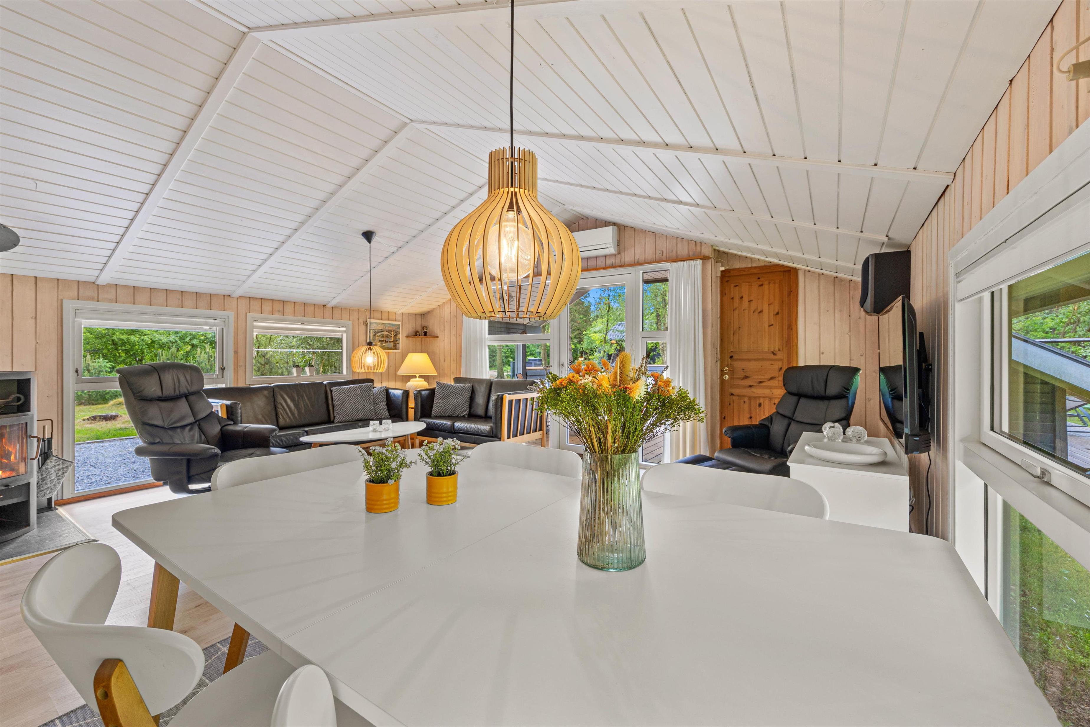 Det veludstyrede køkken, komplet med opvaskemaskine, åbner op til en hyggelig stue og spisestue, hvor I kan nyde kulinariske oplevelser og samtidig være sammen. En effektiv varmepumpe sørger for behagelige temperaturer året rundt, mens brændeovnen tilføjer en ekstra dimension af hygge, perfekt til kølige aftener. De lyse træpaneler og store vinduer skaber en luftig og indbydende atmosfære, der straks får jer til at føle jer hjemme.