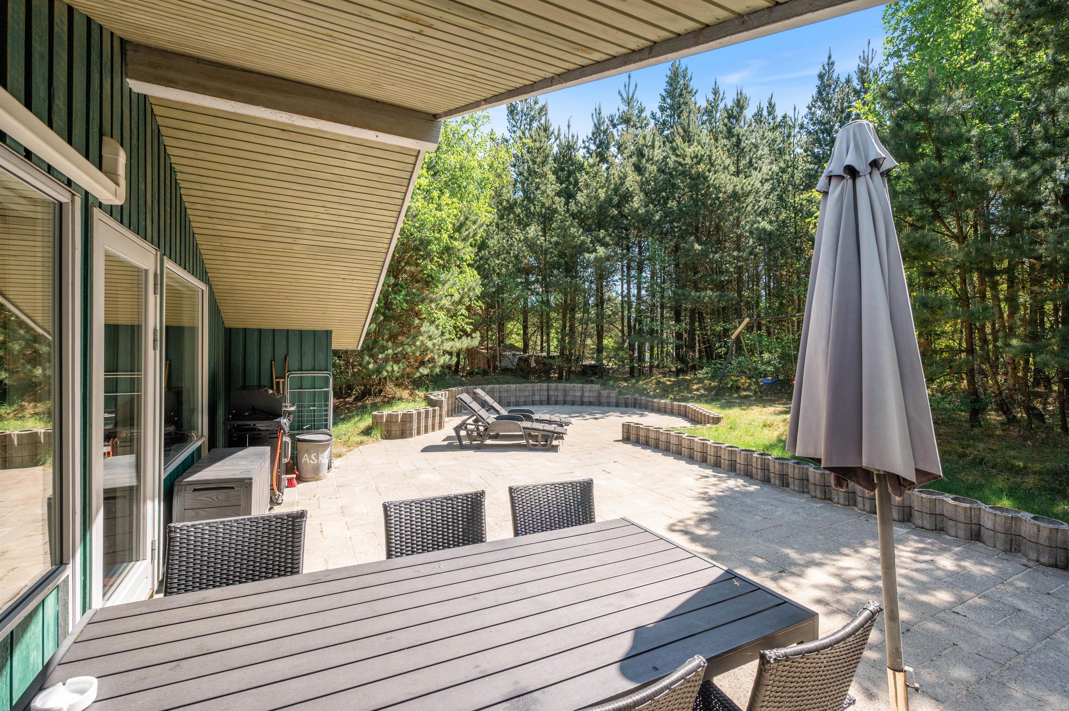 Fra stuen er der direkte udgang til den afskærmede terrasse med de gode havemøbler. Her er masser af plads til lange dage med solbadning på husets solvogn. Om aftenen kan I tænde op i grillen, - her er altid en læplads og da terrassen til dels er overdækket, kan I sagtens nyde jeres grillmad, også hvis det drypper lidt.