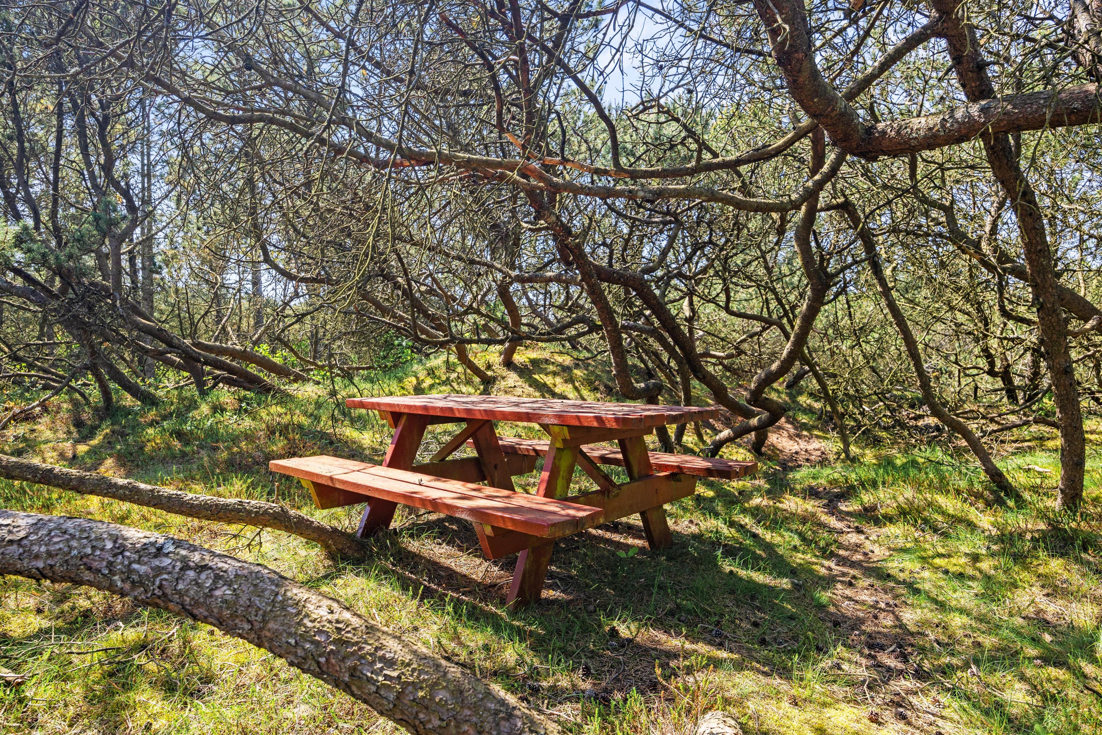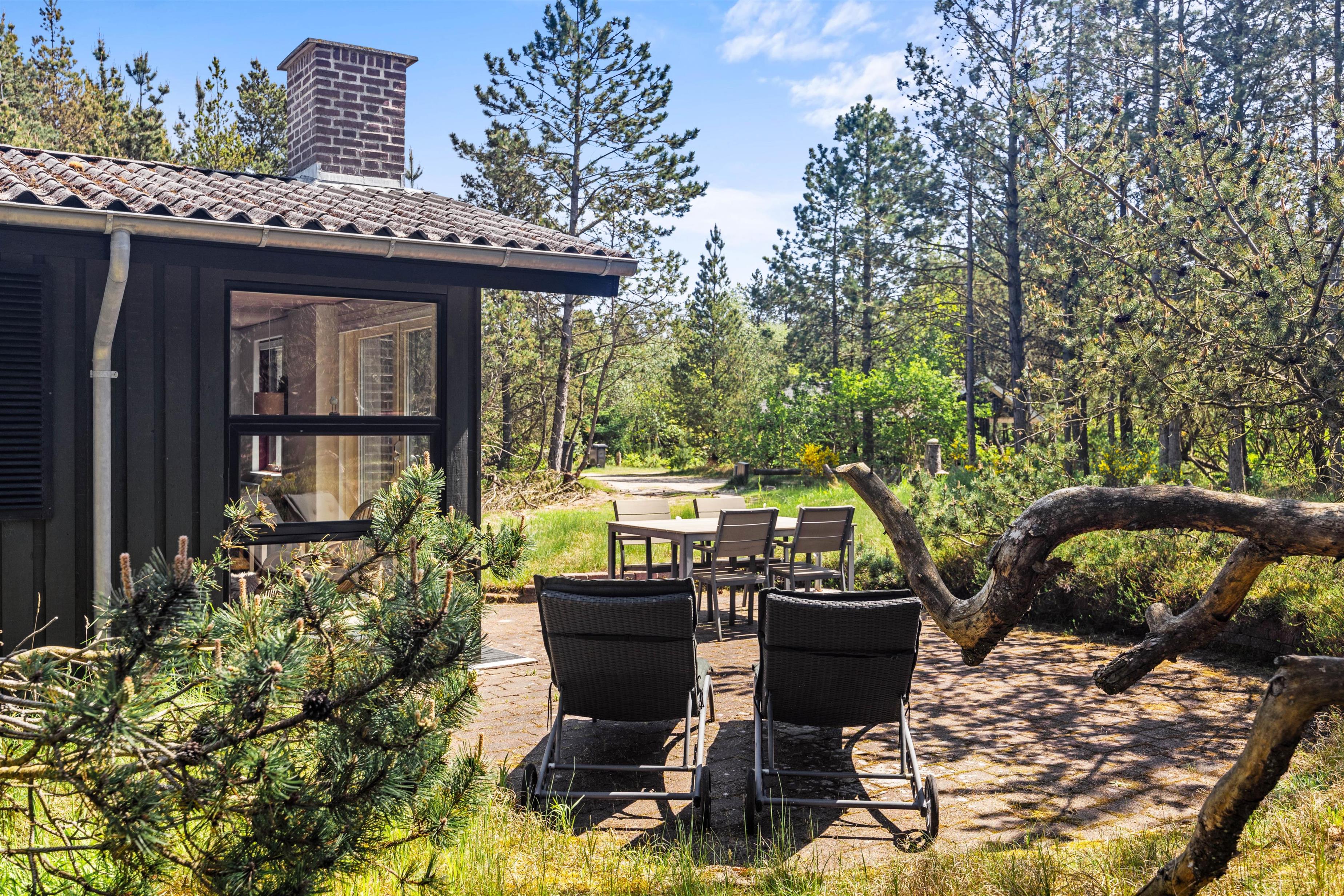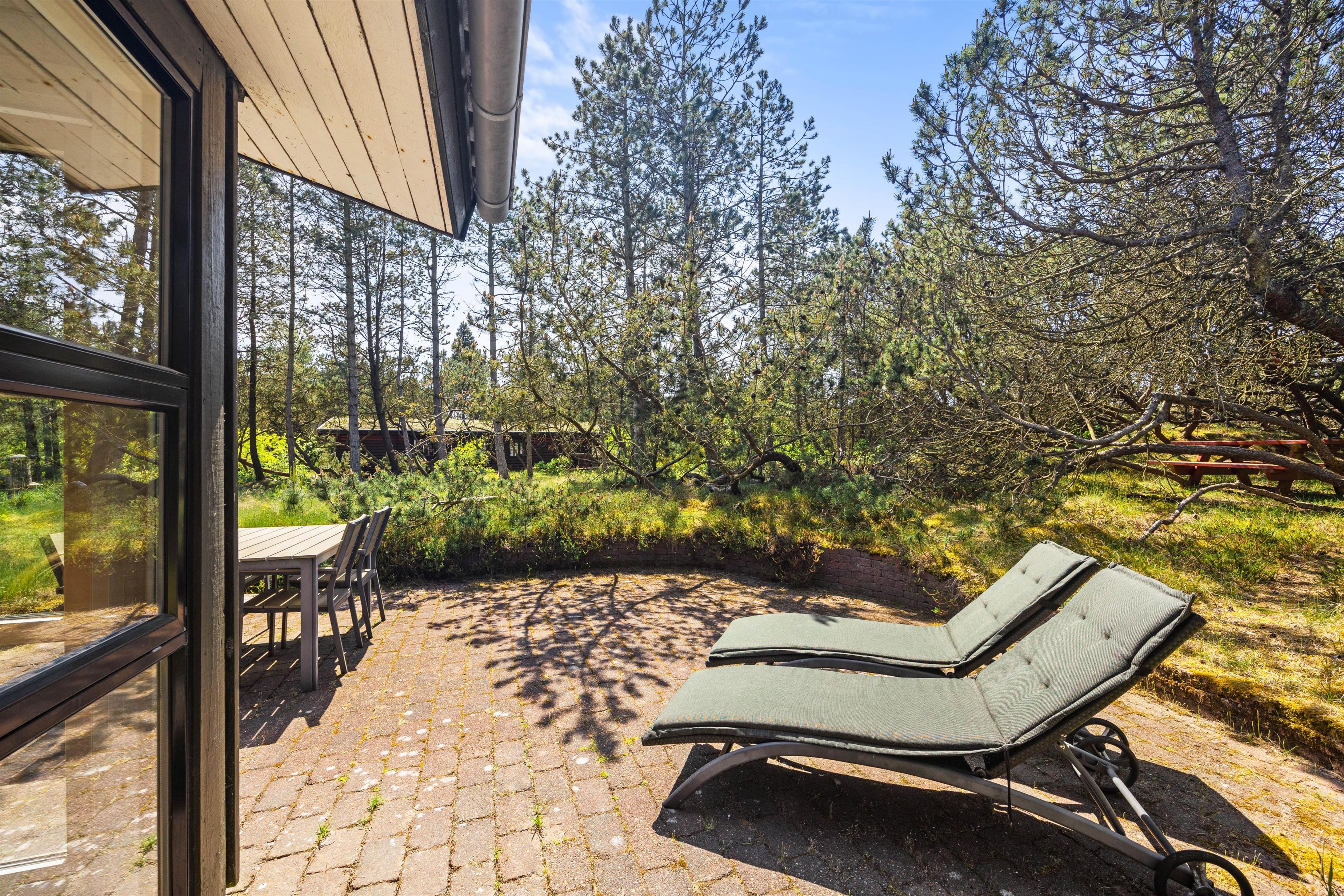 Fred og ro er der masser af her, og på den tæt bevoksede naturgrund kan I helt ugeneret slænge jer i liggestolene eller spise frokost i solen. I kan også gå på opdagelse rundt om sommerhuset, hvor I finder masser af små hyggekroge, blandt andet en bænk inde mellem træerne.