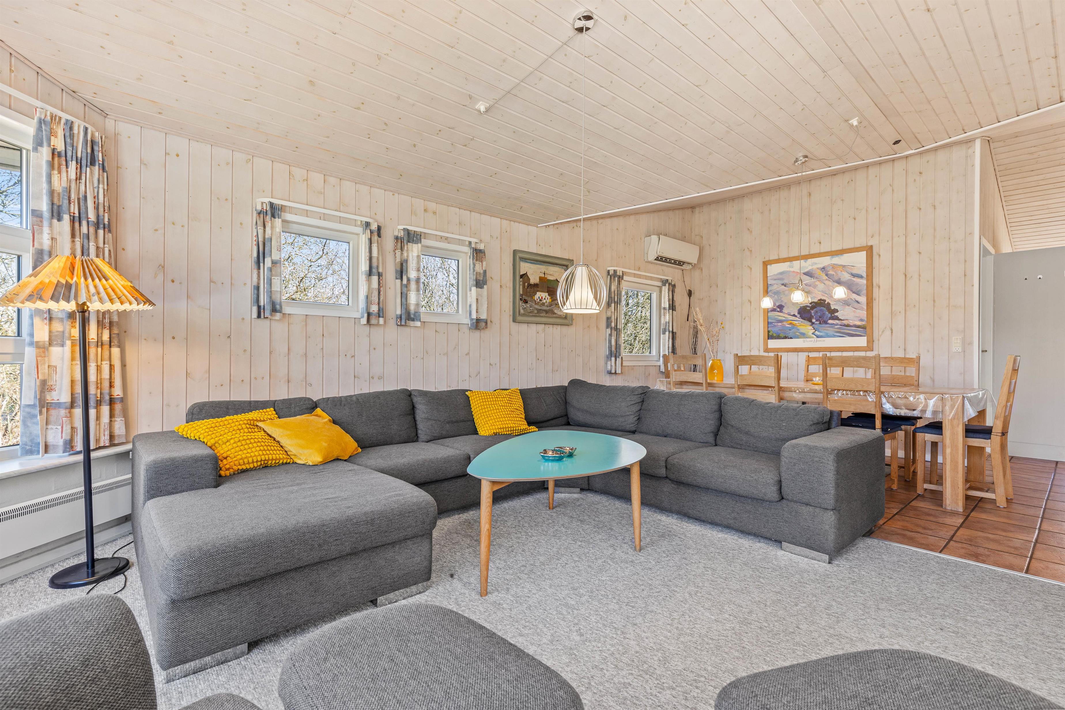 Husets hjerte er det store opholdsrum, der indbyder til mange timers familiehygge. I den hyggelige stue med det store flotte vinduesparti er der både stor hjørnesofa og gode lænestole. Tænd op i brændeovnen og nyd den hyggelige varme og lyden af ildens knistren. Så er scenen sat til lange hyggeaftener med en god bog eller en film på det store fladskærms-tv. I har naturligvis også gratis Wlan. Fra spisestuen har I udgang til husets terrasse, hvor i finder gode havemøbler, solvogne og grill.