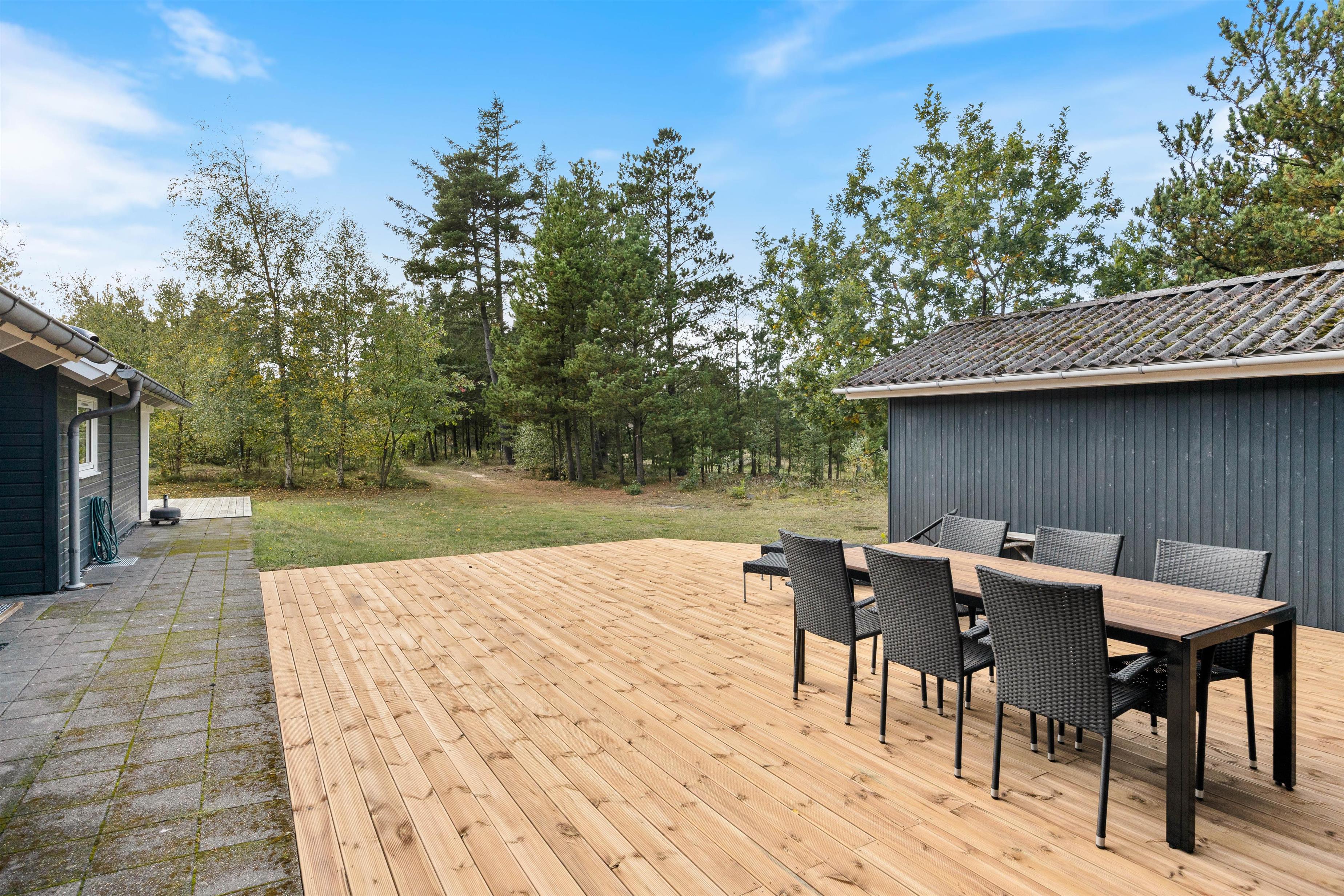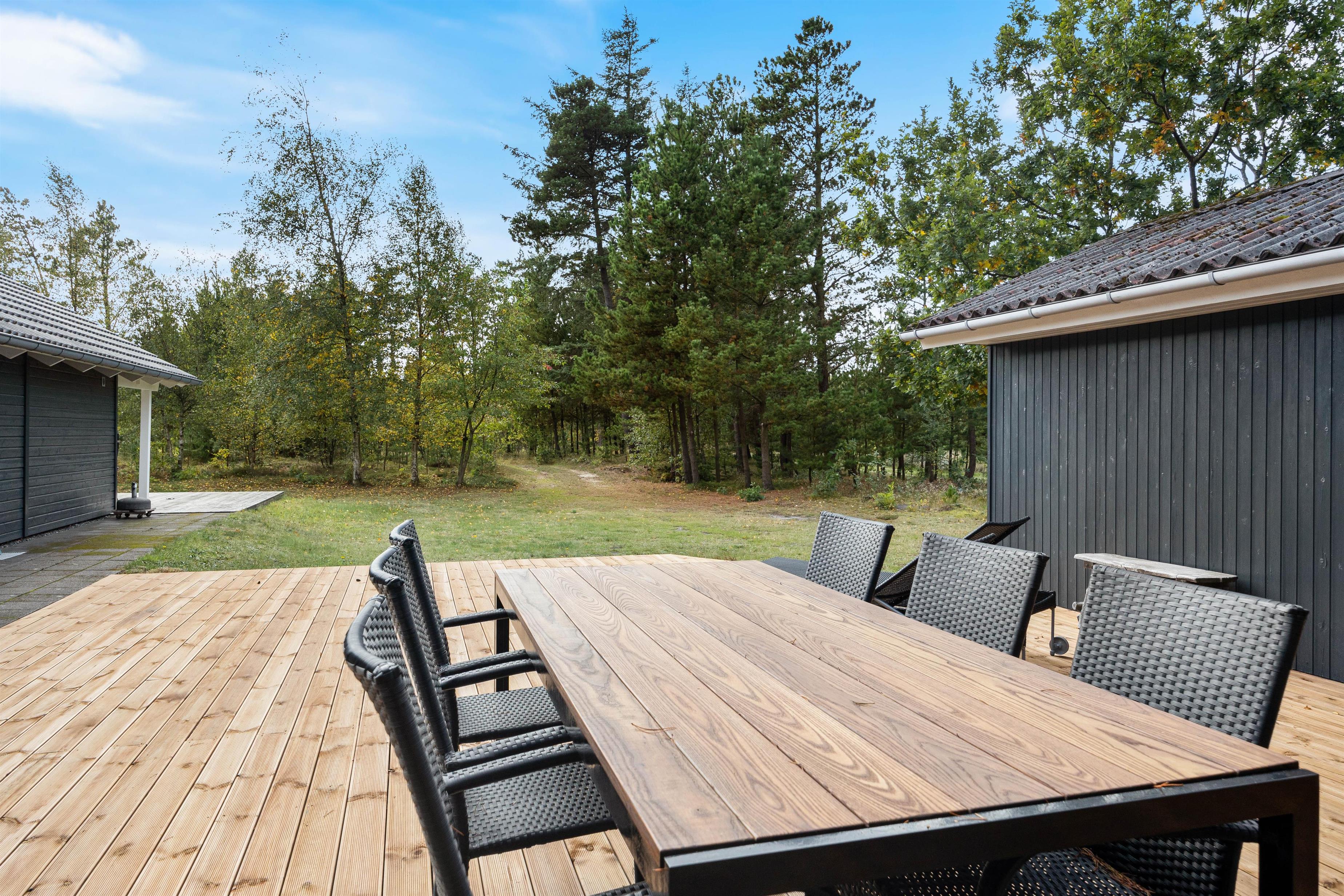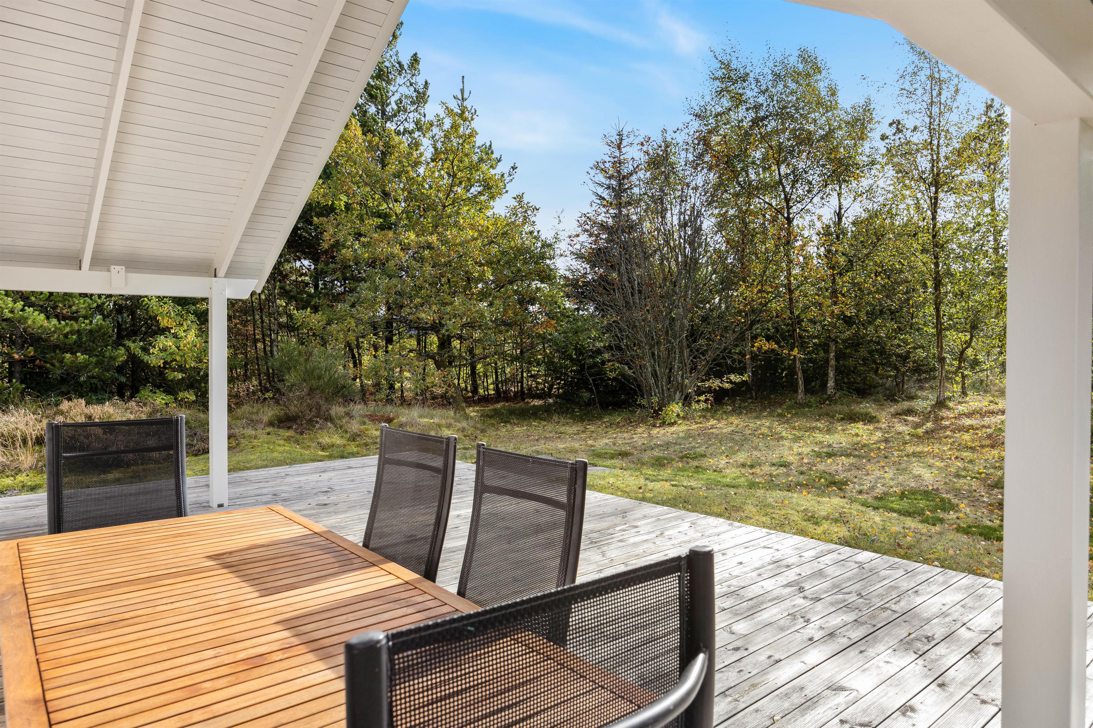 På den åbne, delvist overdækkede terrasse står havemøblerne klar, og I kan nyde hver en solstråle på de varme feriedage. De mange træer skærmer hele grunden af, så I helt ugeneret kan sole jer i liggestolene eller drikke morgenkaffen ude i solen, mens fuglene kvidrer i trætoppene.