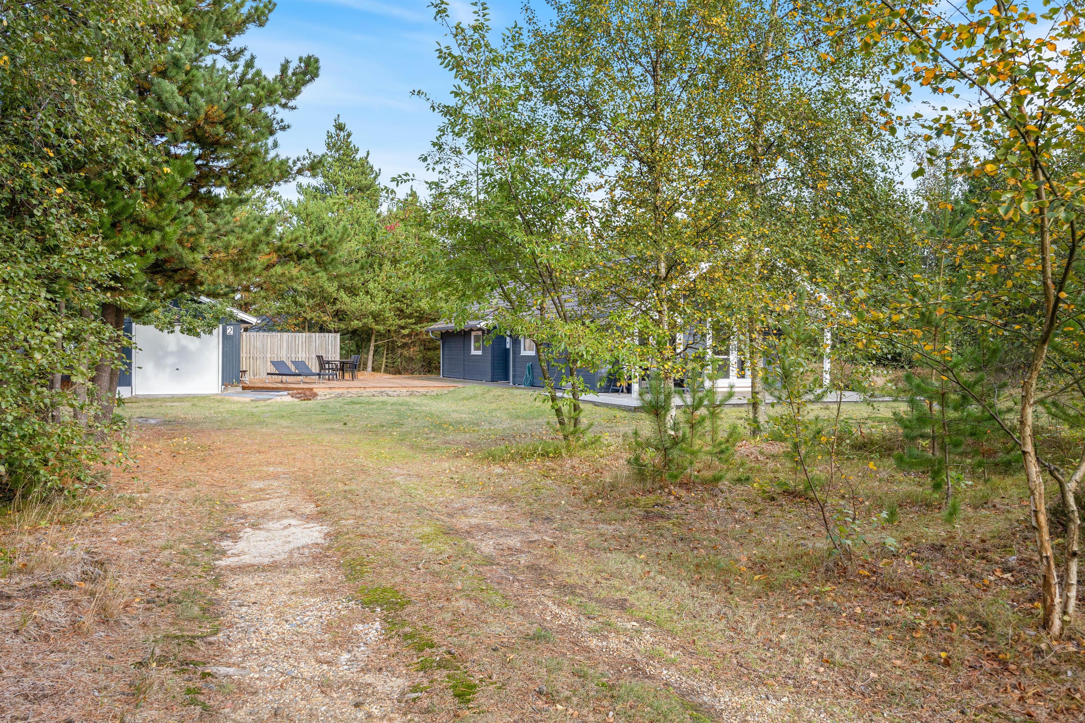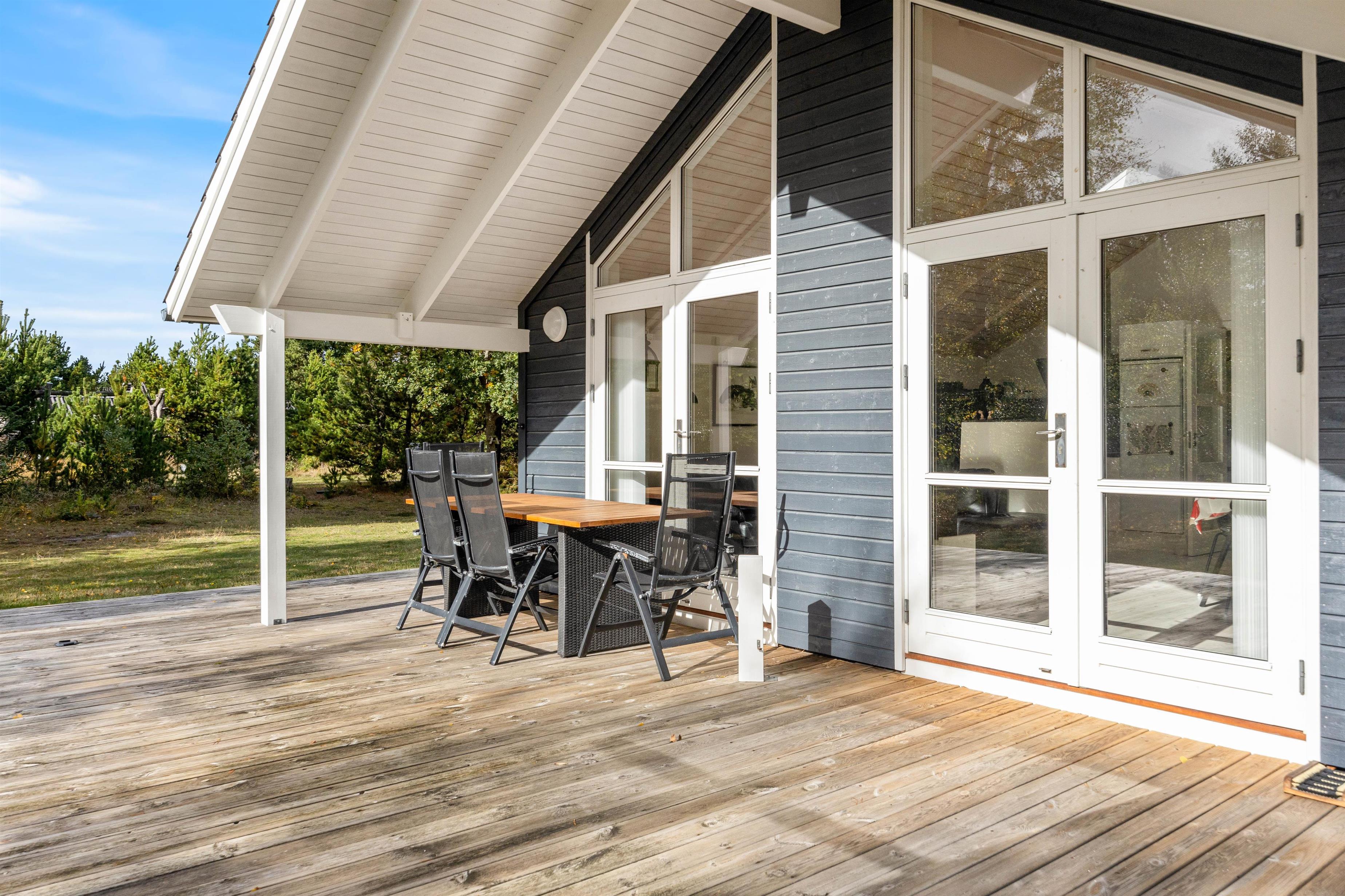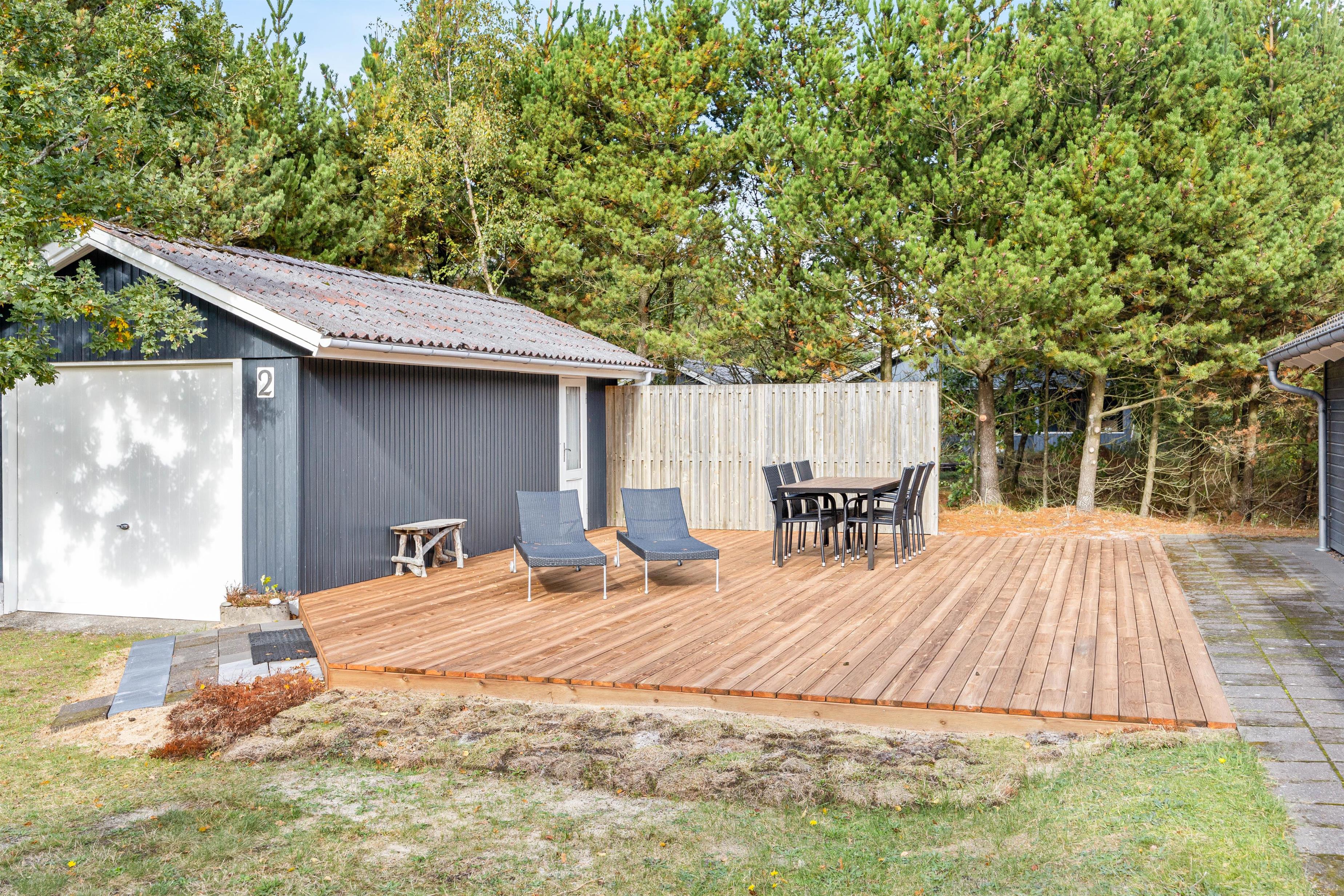 På den åbne, delvist overdækkede terrasse står havemøblerne klar, og I kan nyde hver en solstråle på de varme feriedage. De mange træer skærmer hele grunden af, så I helt ugeneret kan sole jer i liggestolene eller drikke morgenkaffen ude i solen, mens fuglene kvidrer i trætoppene.