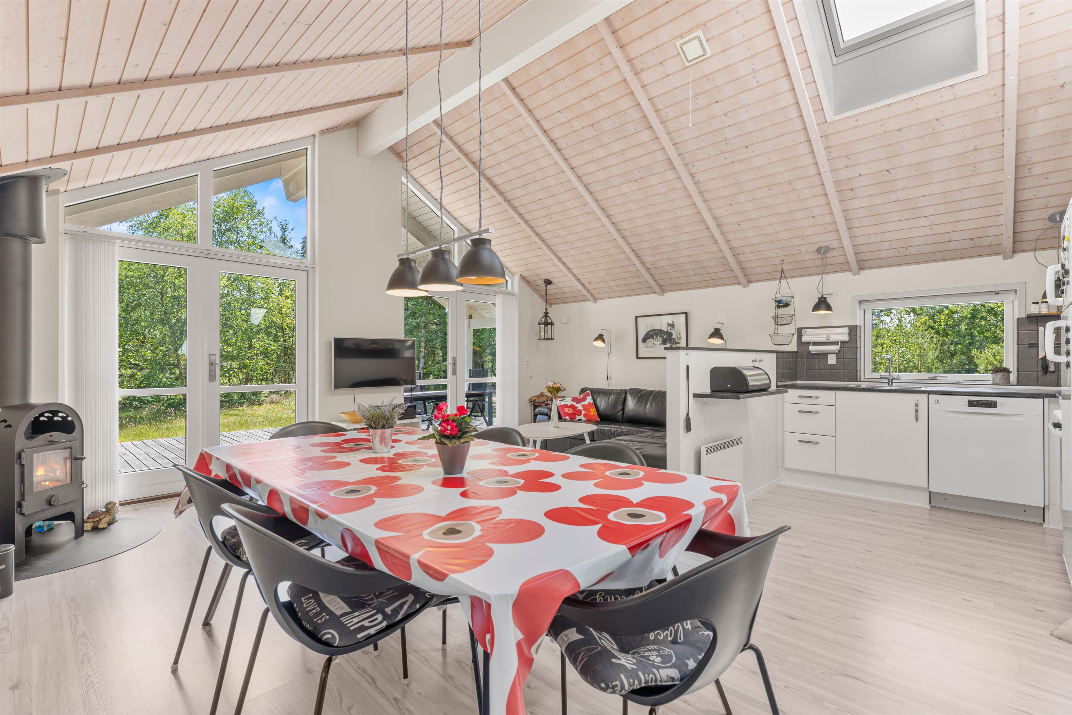 Køkkenalrum og stue ligger i åben forbindelse med hinanden, og her er loftet åbnet op til kip for at give huset ekstra rummelighed, som bliver yderligere understreget af de store vinduer, der inviterer solens lys og den smukke natur indenfor.
