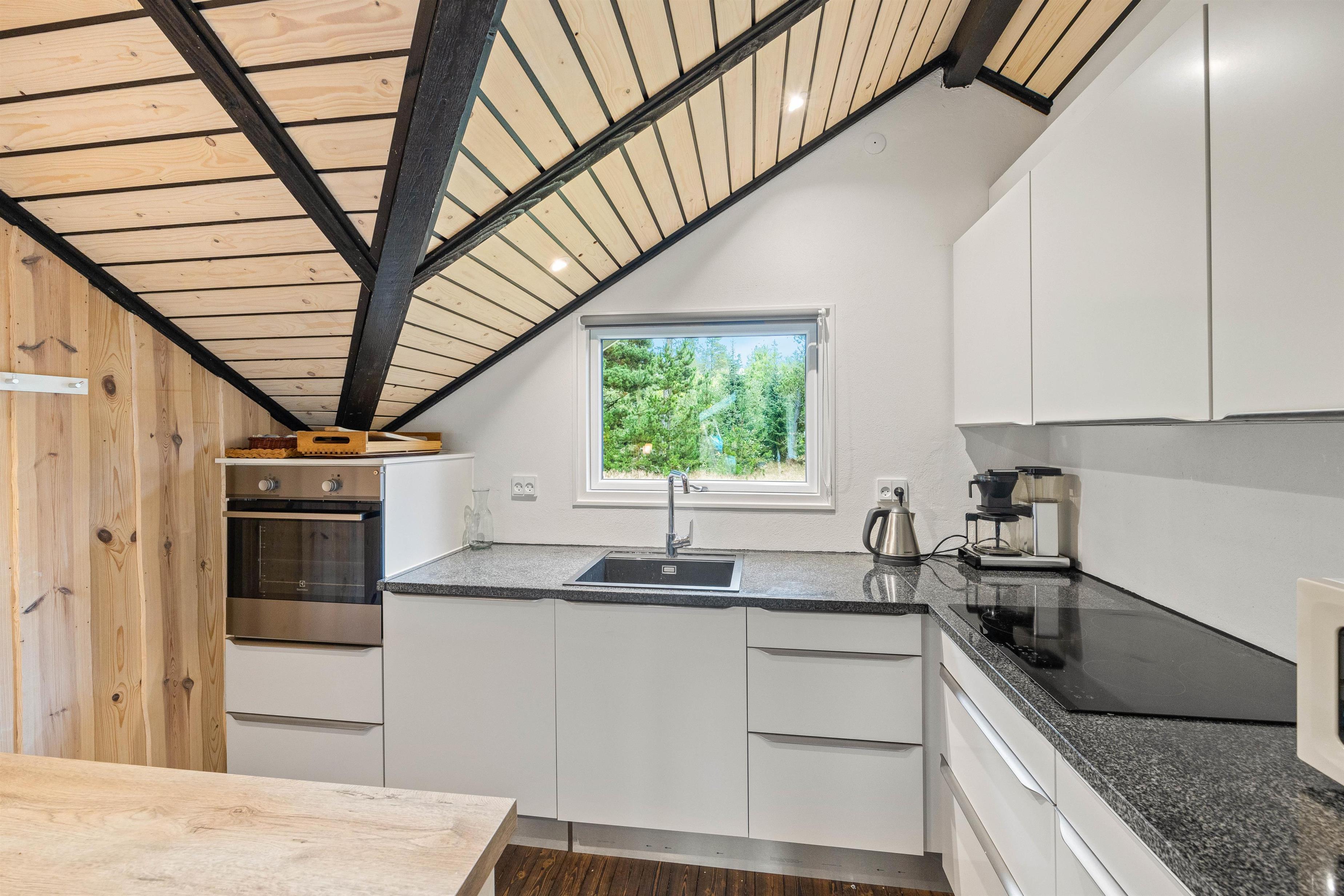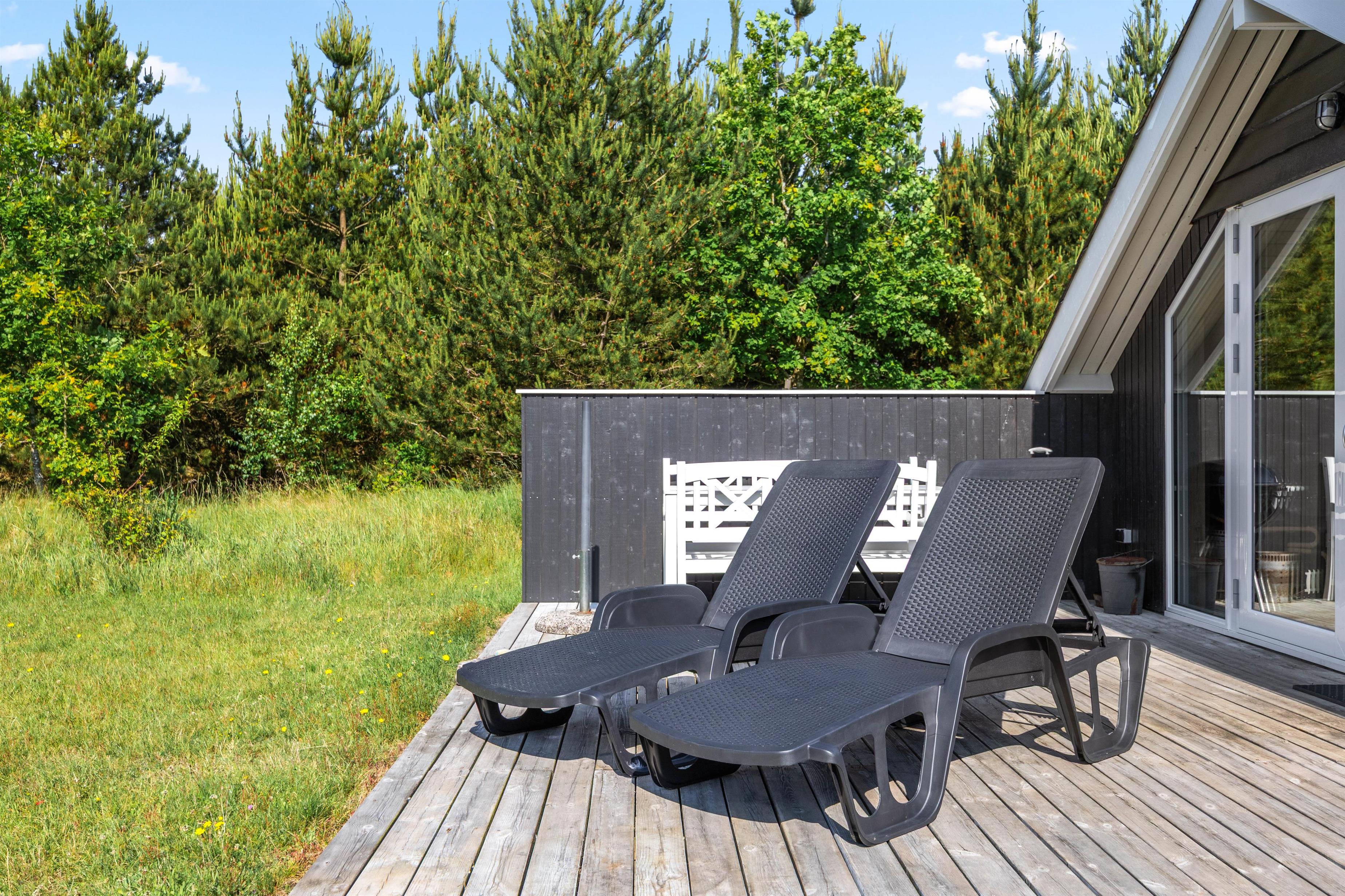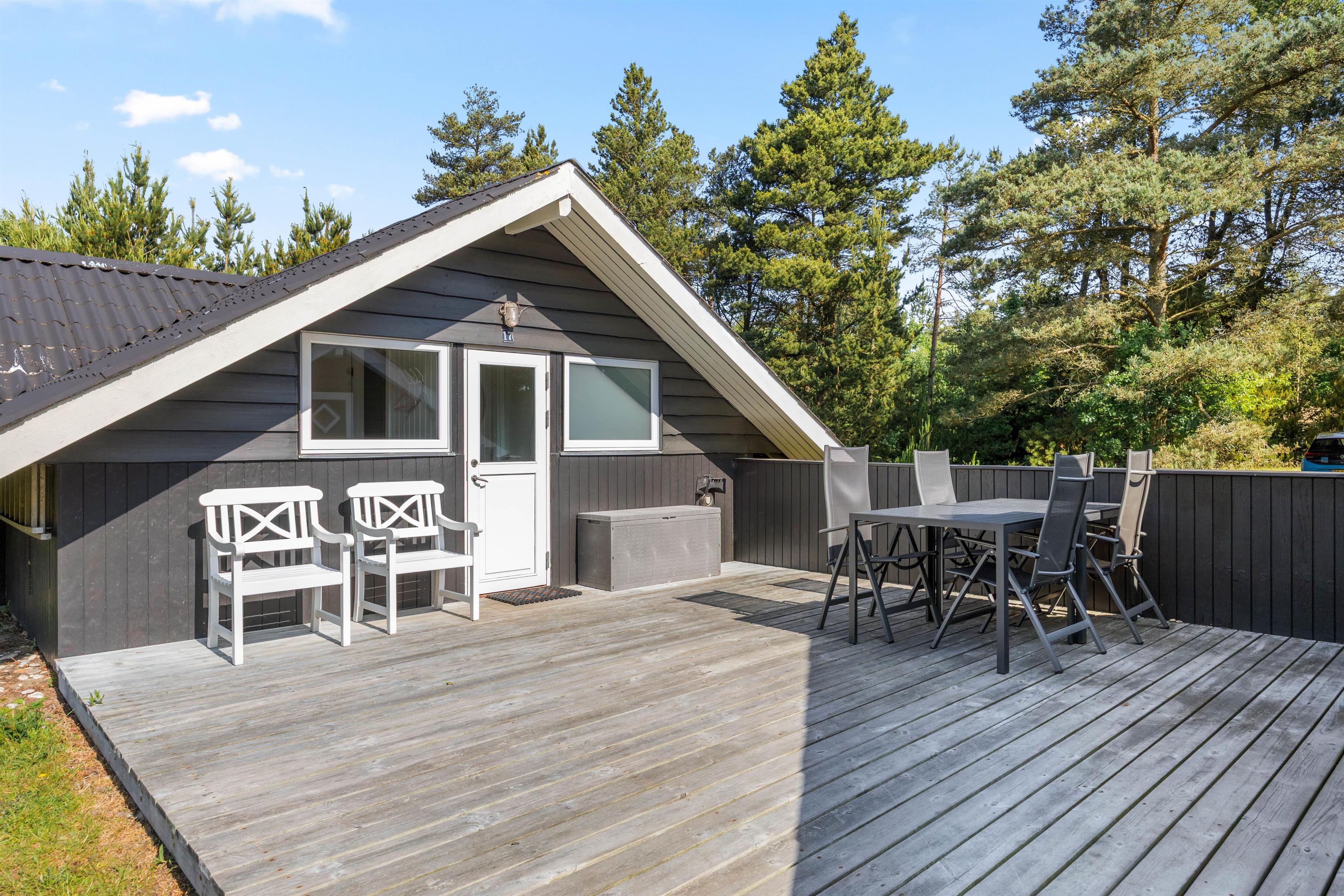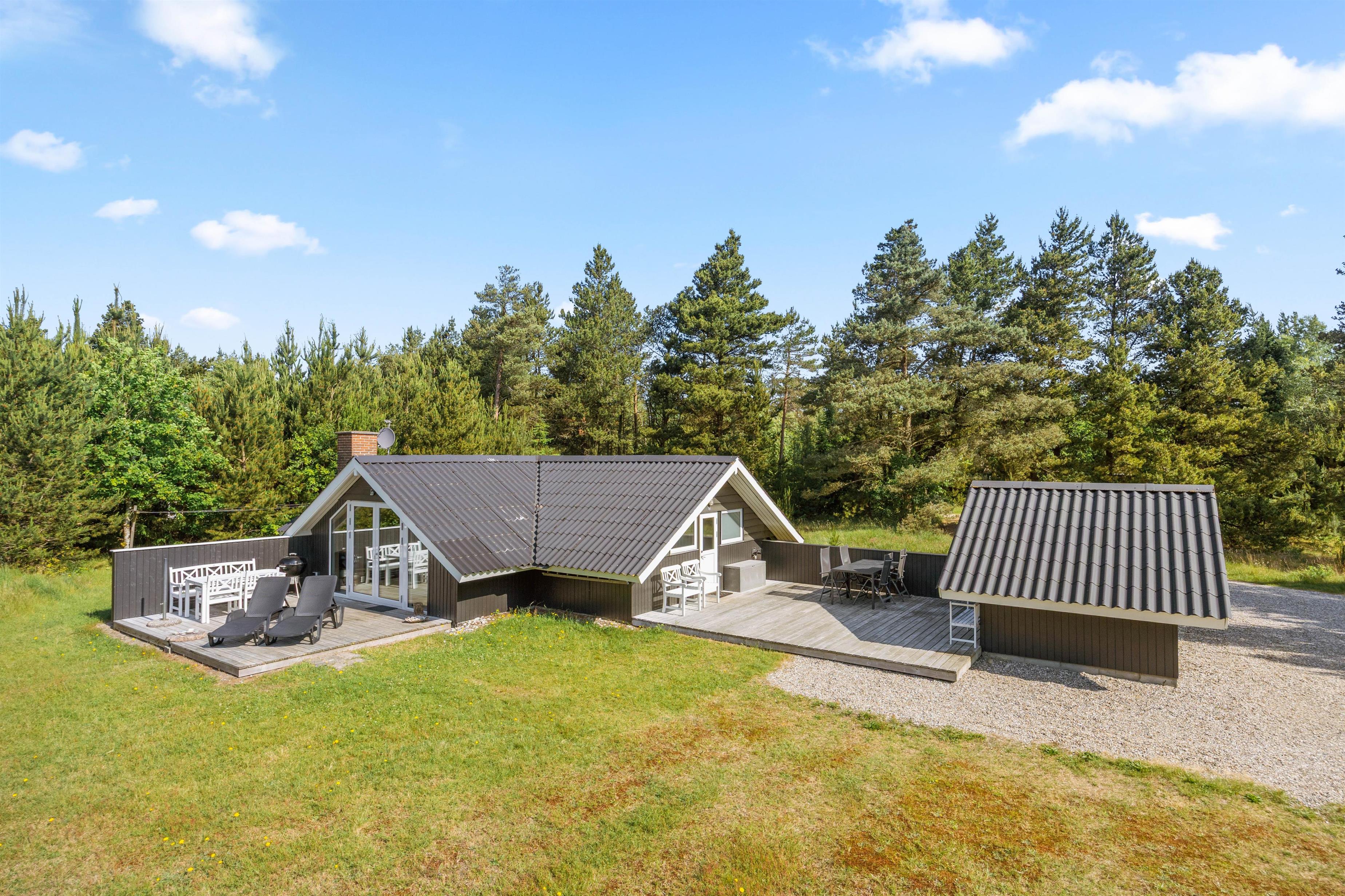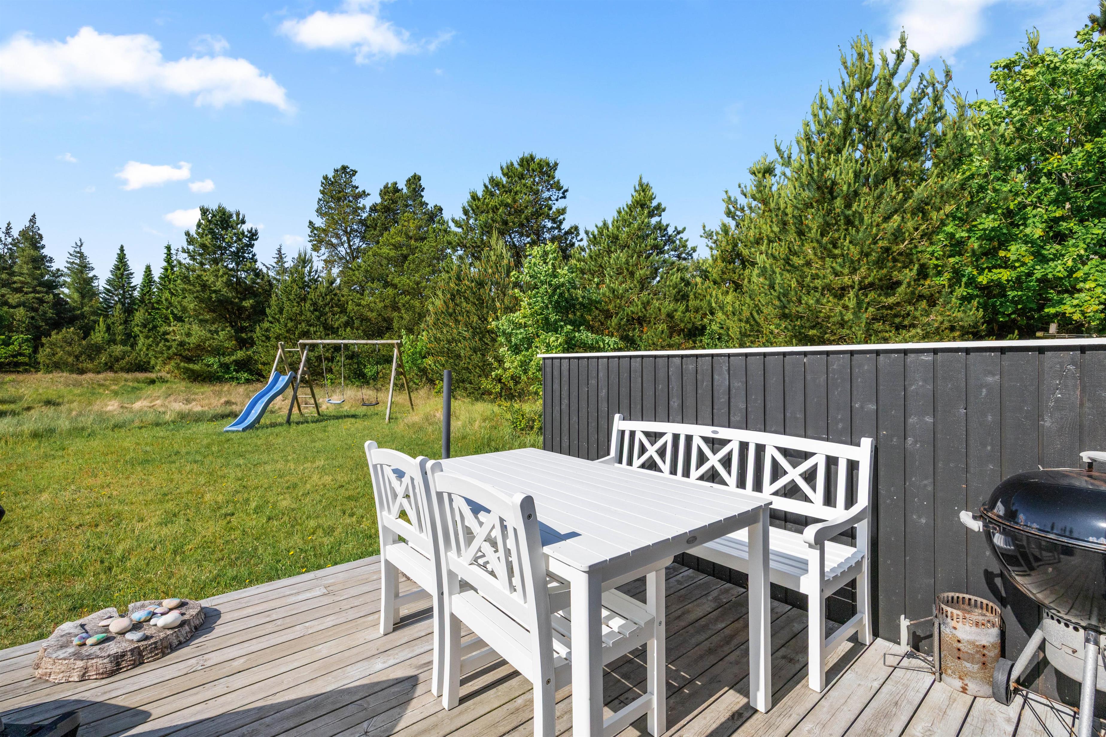 Sommerhuset, der er indrettet med personlighed og charme, har et stort lyst vinduesparti, hvorfra der er adgang til en dejlig terrasse og den skønne naturgrund. Når I åbner de store terrassedøre, kommer naturen helt ind i stuen. Mens I drikker morgenkaffen, kan I nyde den skønne udsigt over den store baghave, hvor I kan se helt over til Blåbjerg Plantage direkte fra morgenbordet.