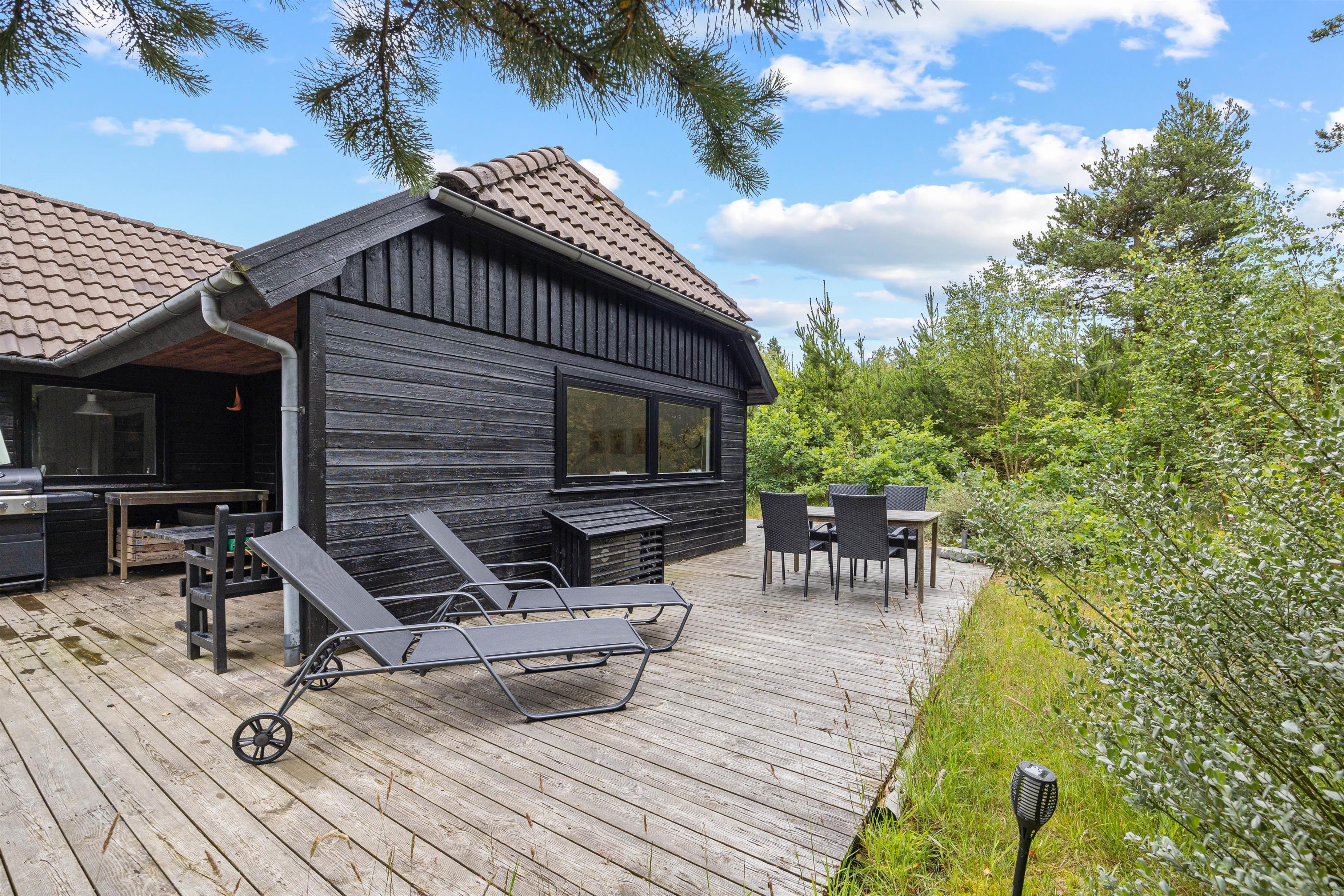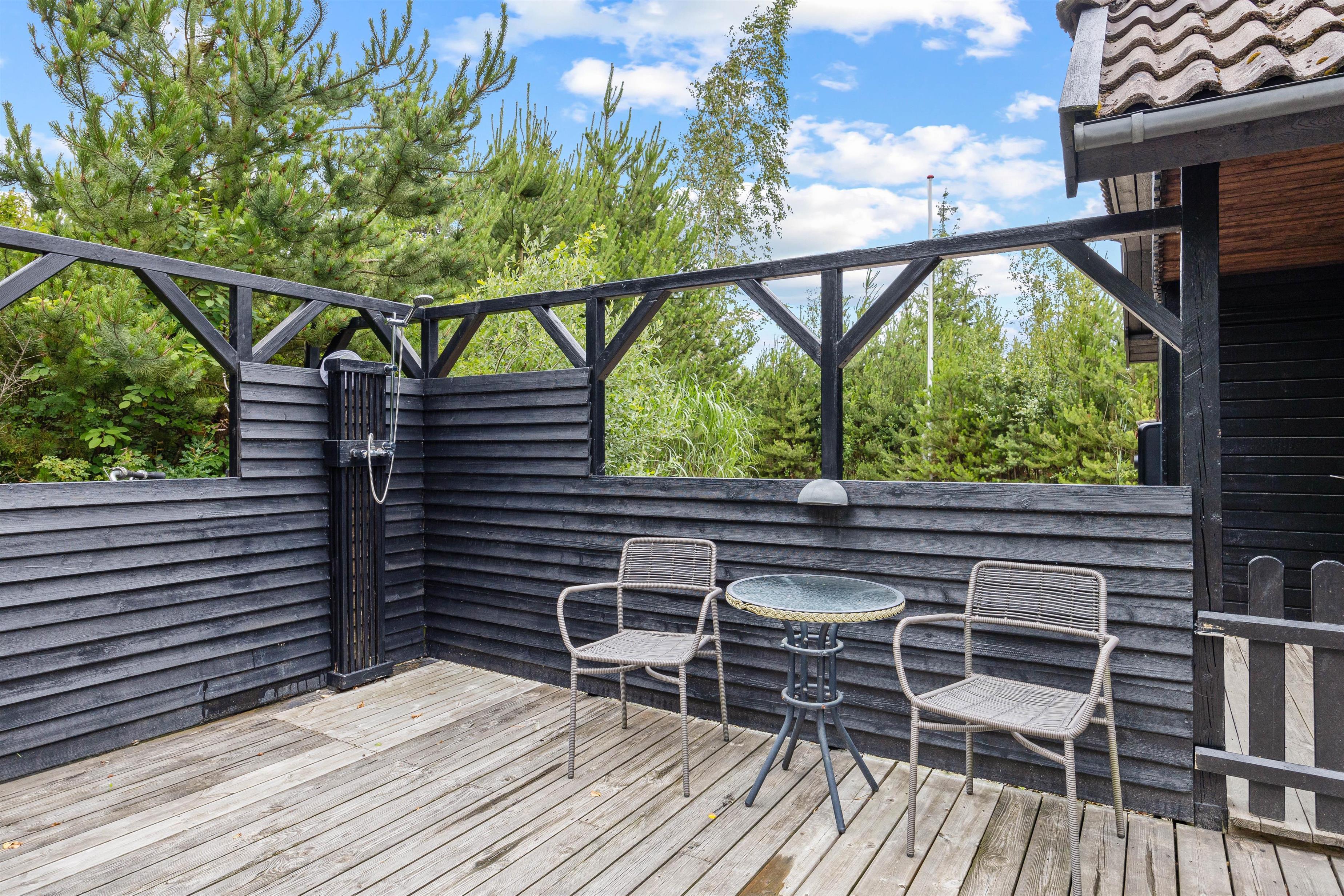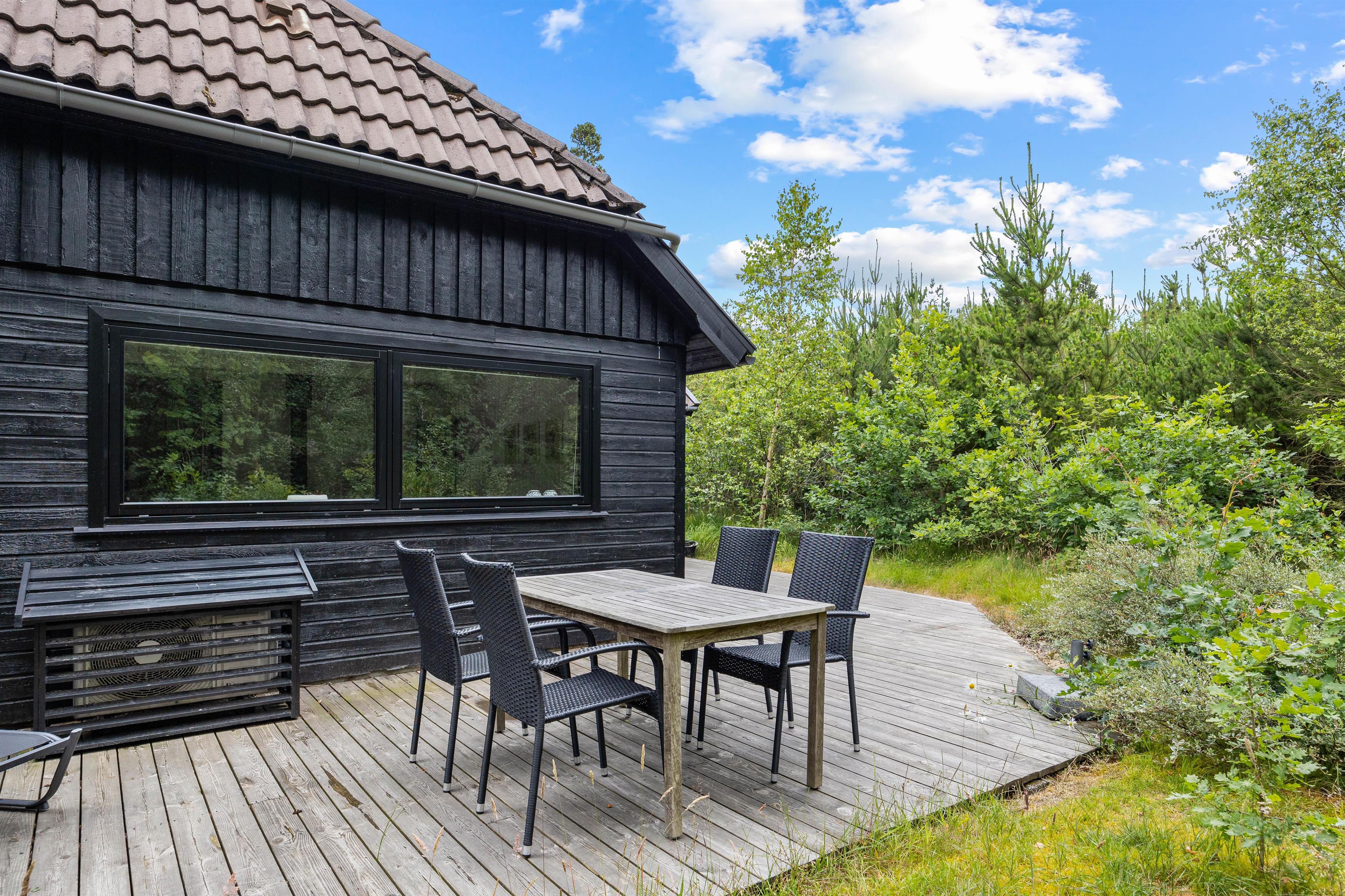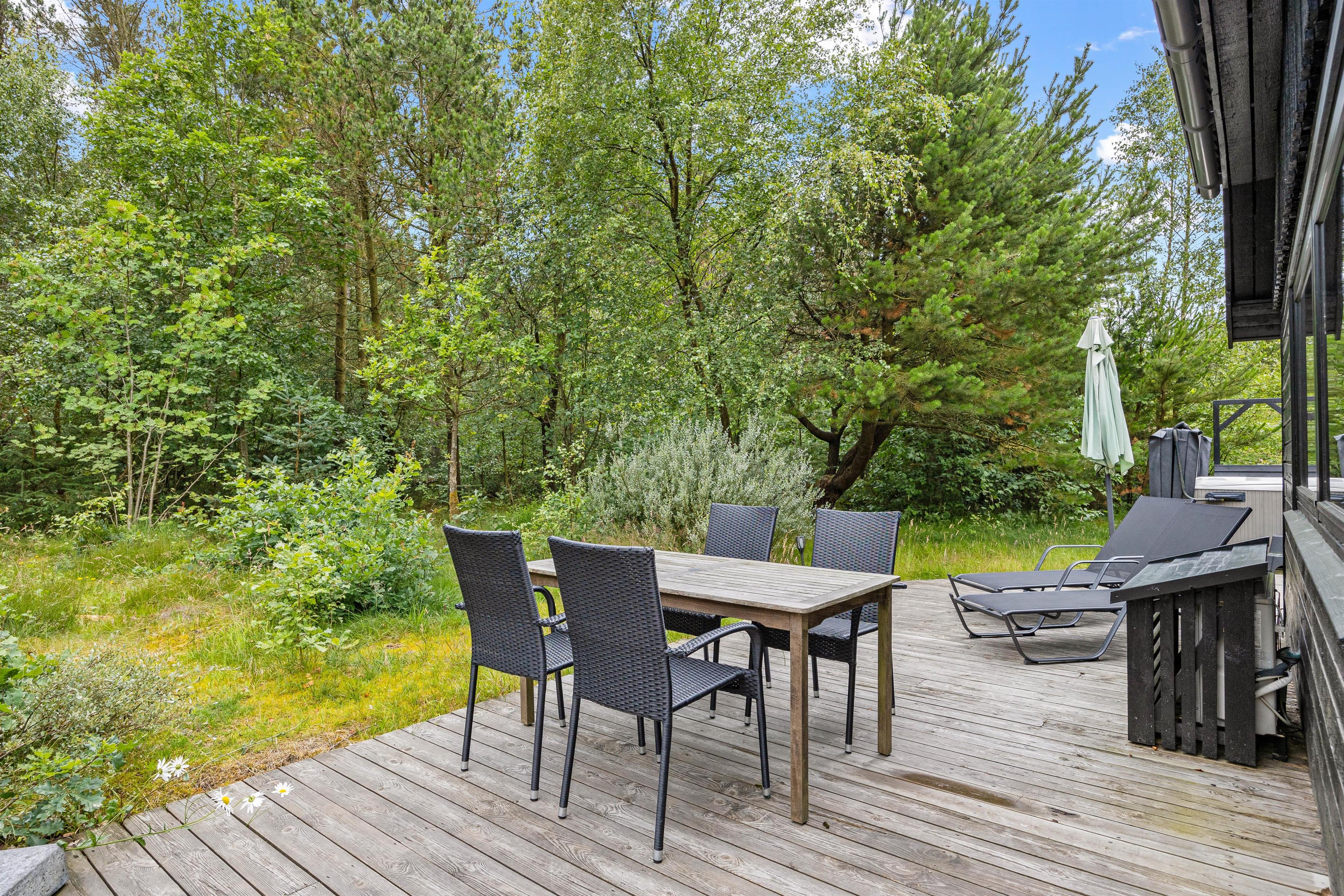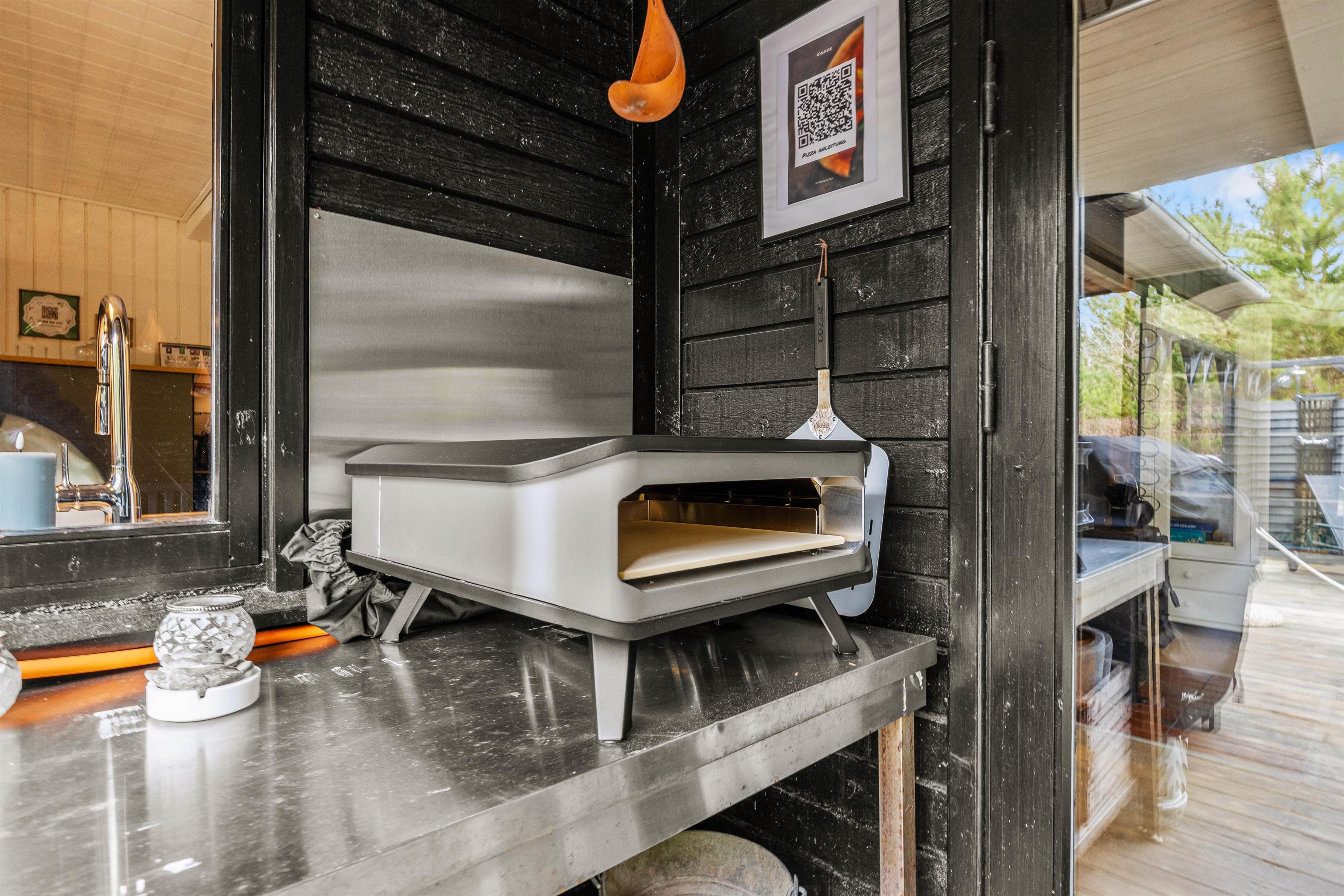 Terrassen omkring sommerhuset er udstyret med komfortable havemøbler, der indbyder til afslapning og måltider under åben himmel. For de kulinariske er der desuden en pizzaovn på terrassen. Den store grund på 1560m2 giver masser af plads til leg og fritidsaktiviteter.