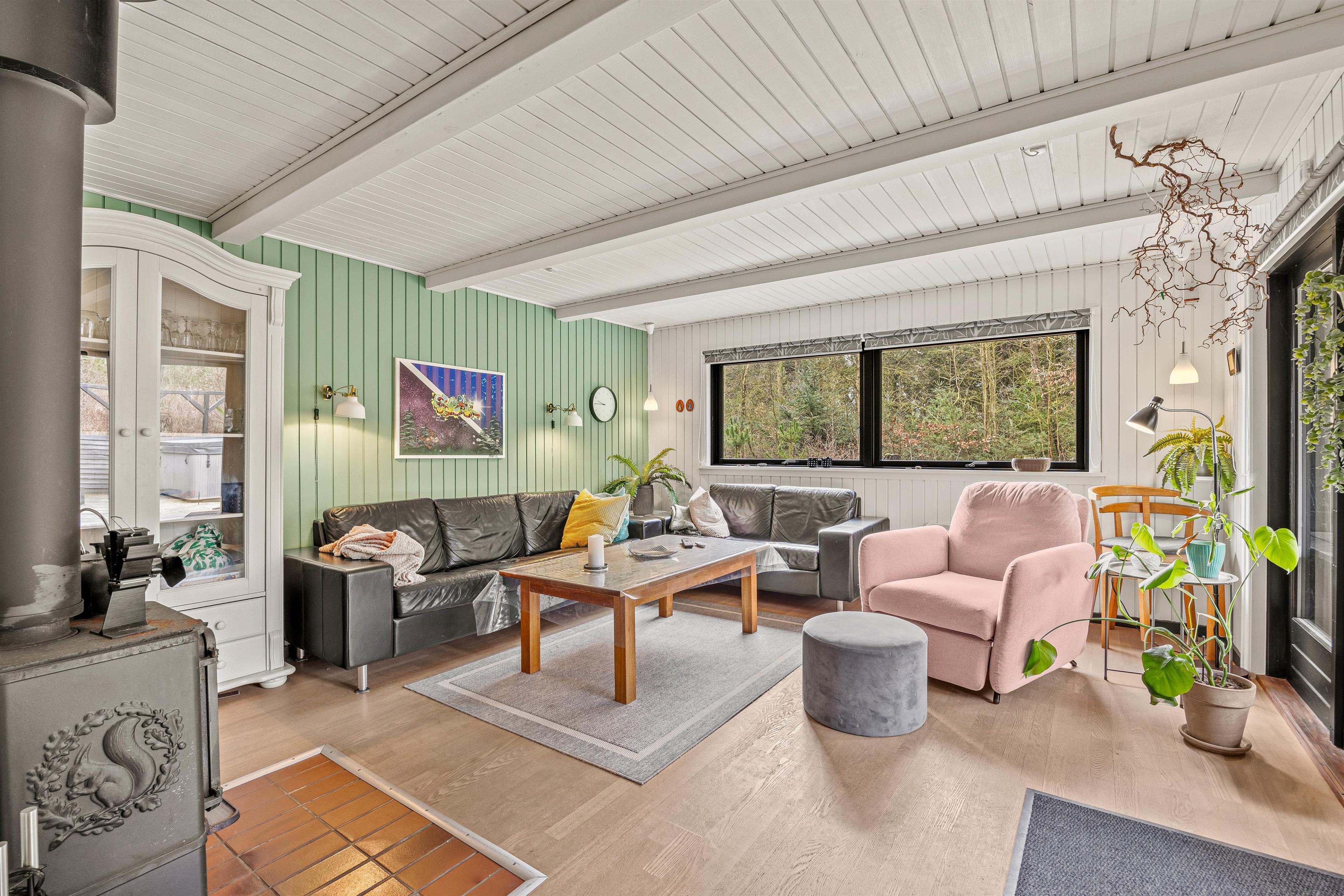 Den rummelige stue er indrettet med komfortable møbler, hvor I kan slappe af efter en dag fyldt med aktiviteter. Brændeovnen skaber en varm og hyggelig atmosfære, perfekt til de kølige aftener. Derudover er luft-til-luft-varmepumpen med til at sikre et behageligt indeklima året rundt.