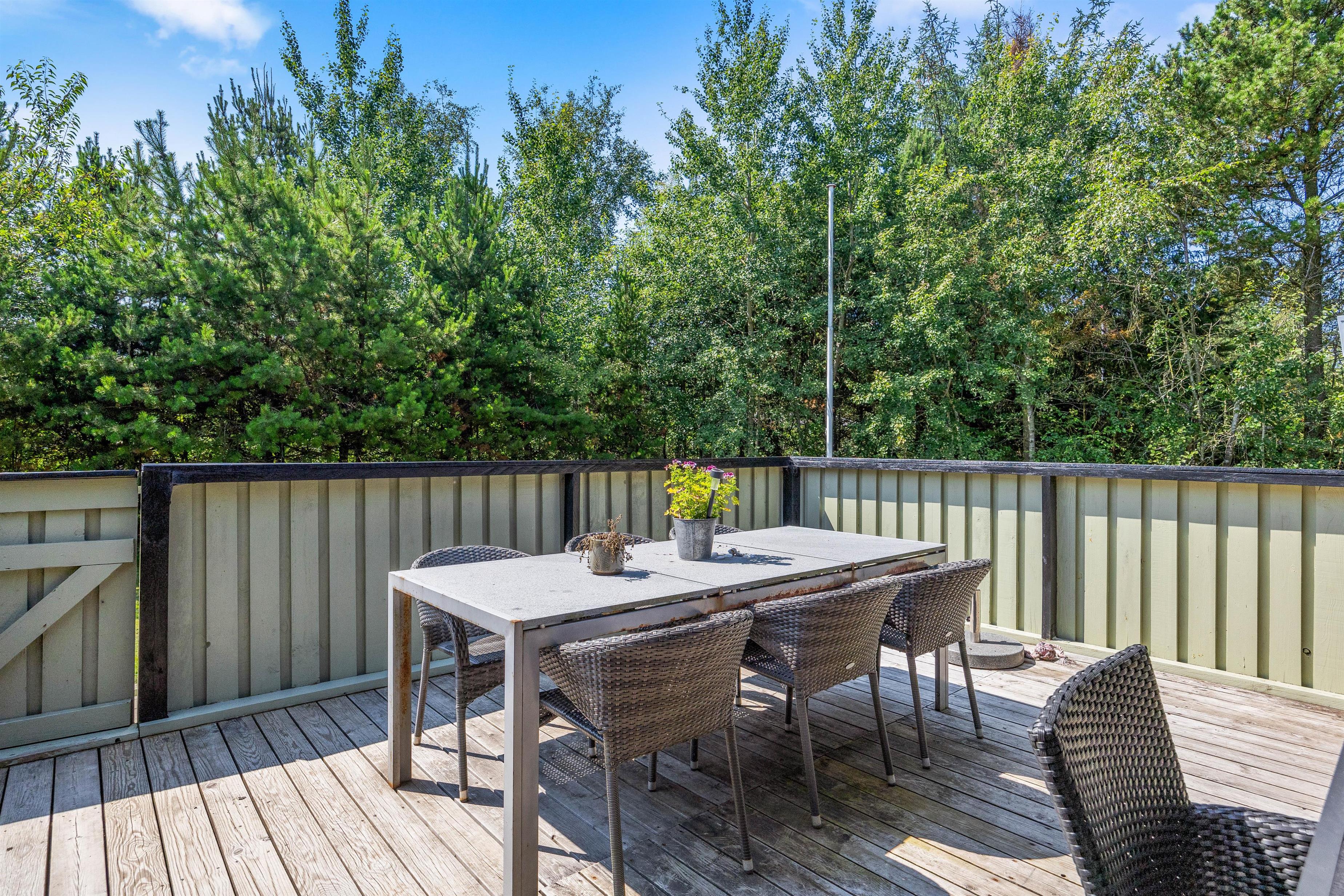 Grillen og havemøblerne står klar, så I kan gøre de lune sommeraftener ekstra gode med et lækkert måltid på terrassen, og med de høje træer, der indrammer huset, har I masser af privatliv, mens I nyder maden og planlægger morgendagens aktiviteter.