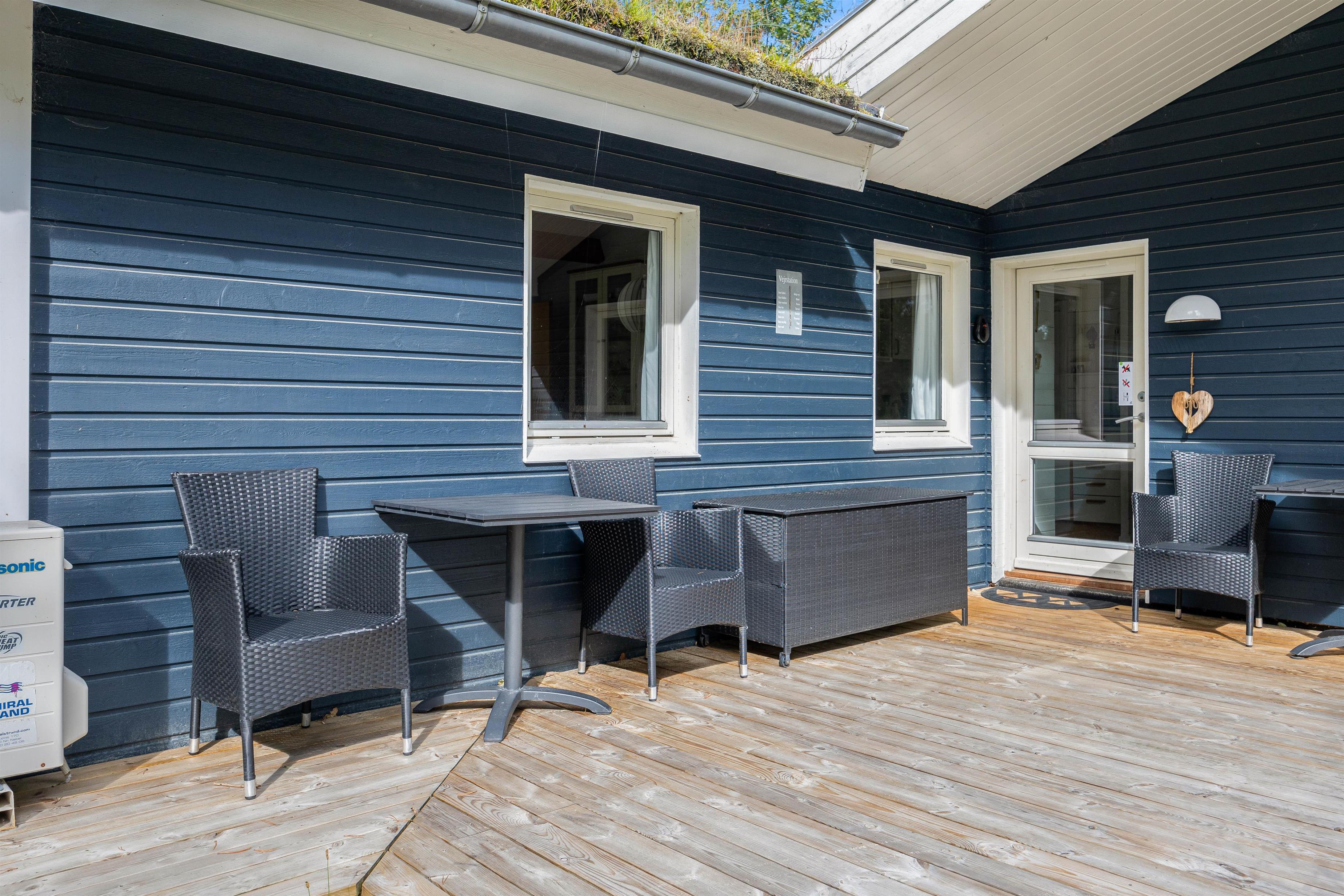 Dette smukke feriehus nær Houstrup ligger på en skøn grund omgivet af træer, hvor I ofte kan finde et sted med læ. Rundt om feriehuset finder I flere hyggelige terrasser, så I altid kan finde et dejligt sted – havemøblerne står allerede klar! Nyd solens varme, mens børnene leger på den grønne græsplæne. Grunden er knap 2200 m2, så her kan børnene boltre sig med en fodbold eller et spil kongespil.