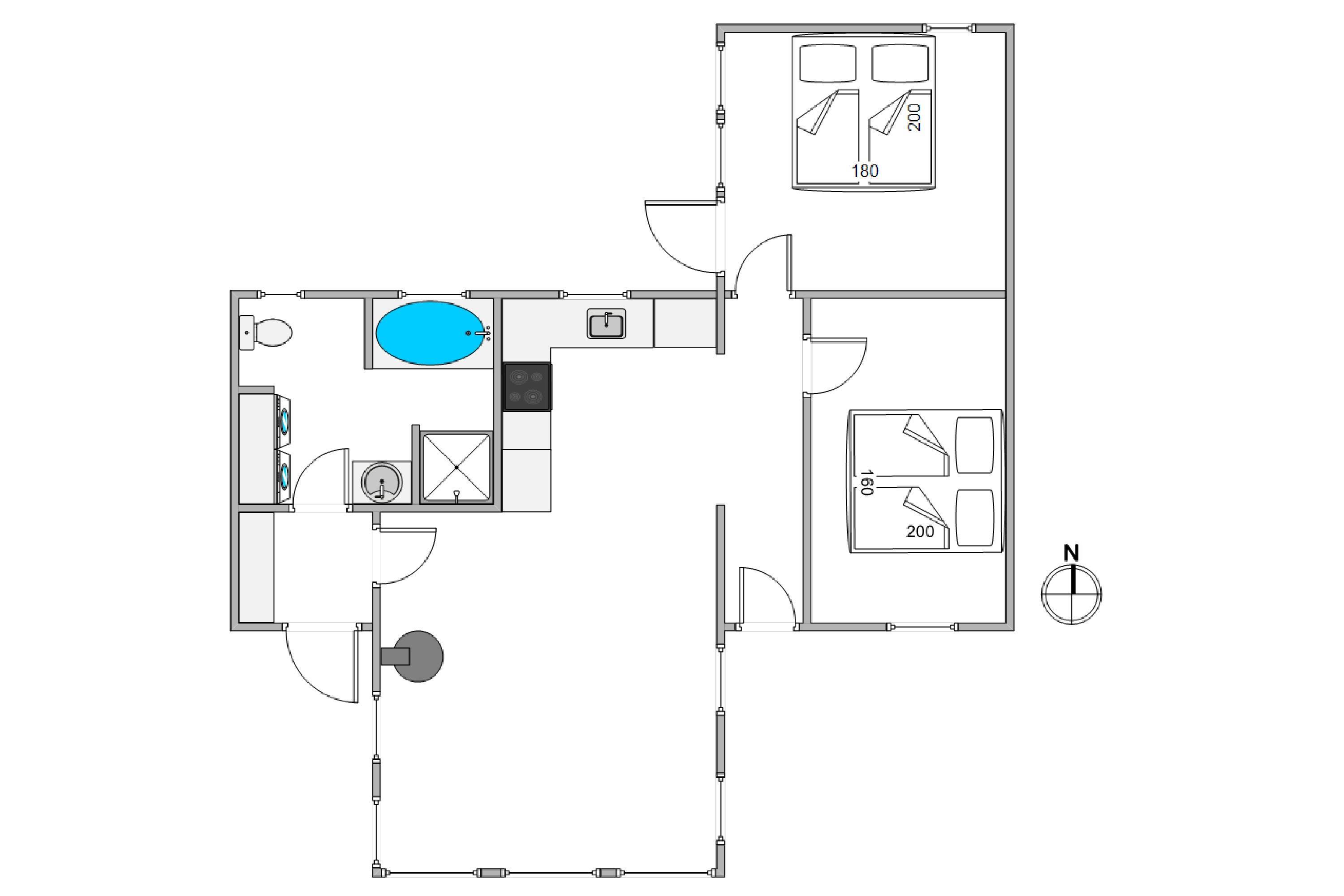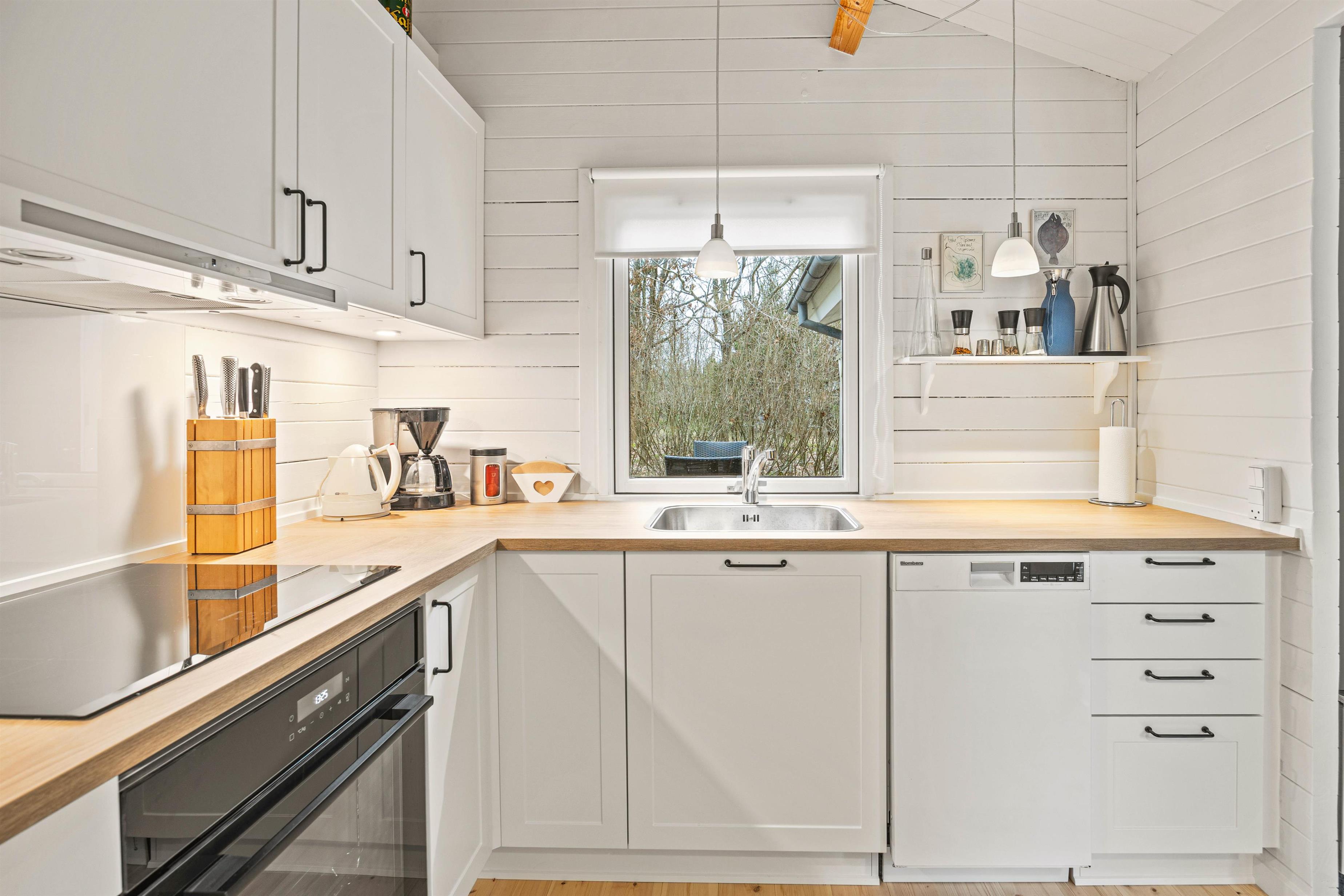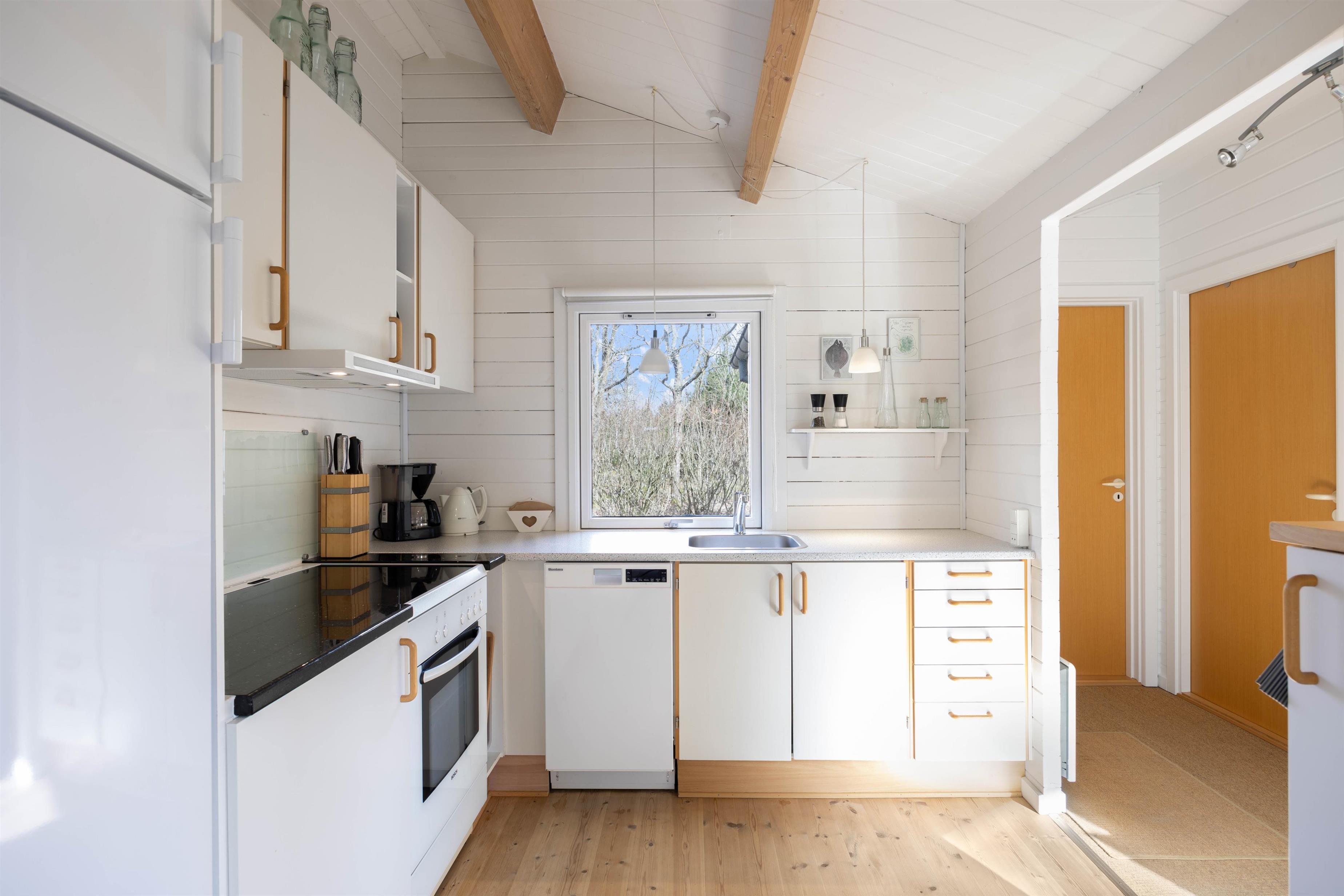 Det smukke køkken ligger i åben forbindelse med stuen, så man altid er sammen med dem, man holder af, og sammen kan nyde ferien. Den hyggelige brændeovn er placeret således, at den afgiver dejlig varme i begge rum. I køkkenet kan I lave dejlig mad, og sofaen indbyder til afslapning med en god bog eller film. Varmepumpen sørger desuden for et behageligt indeklima. Udover det skønne lyse opholdsrum byder feriehuset på to rummelige soveværelser samt et flot badeværelse med gulvvarme.