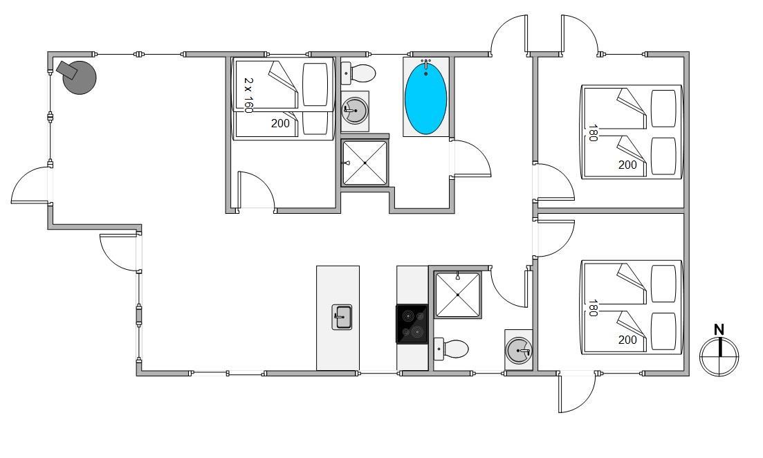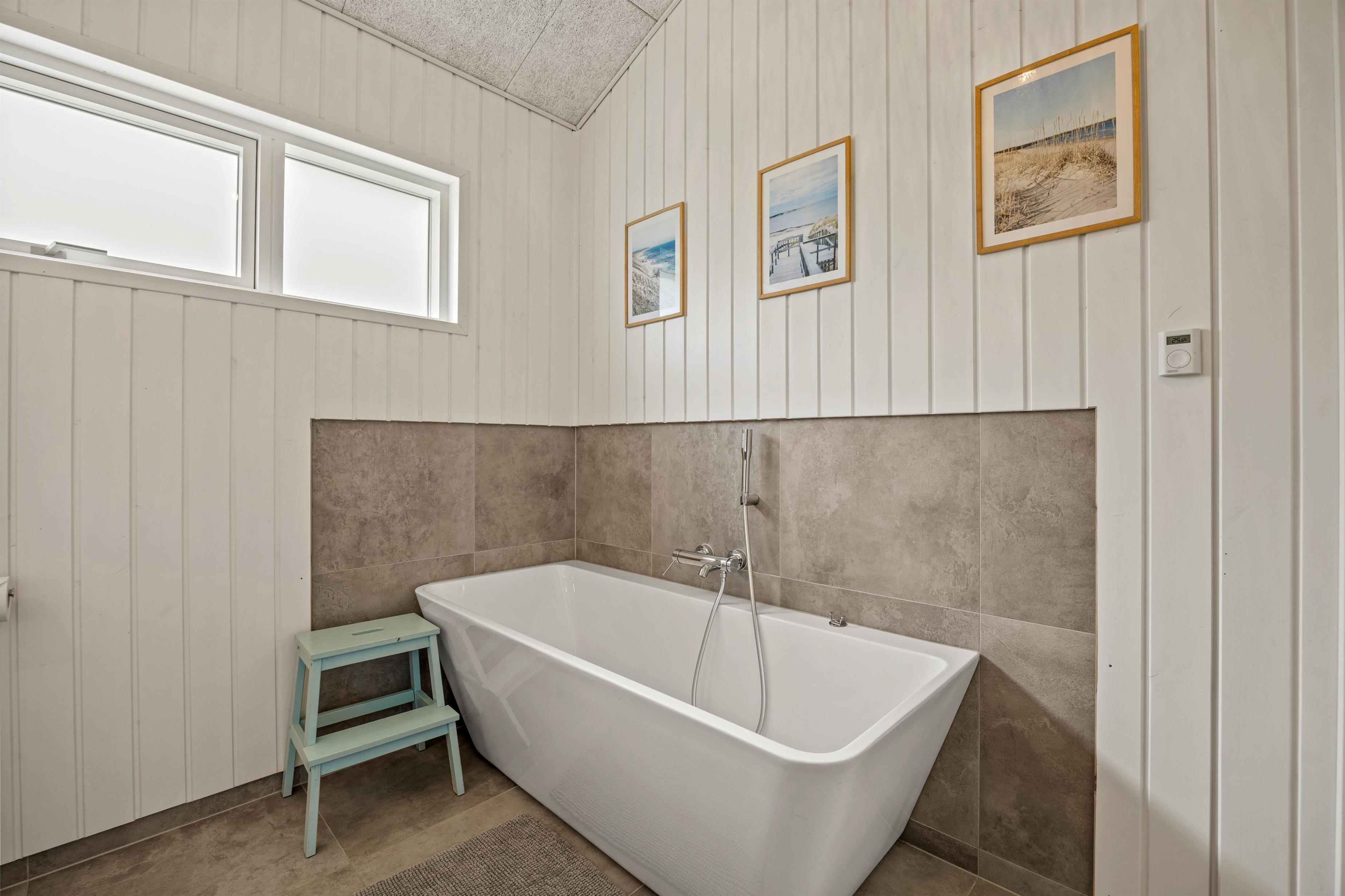 I dette super skønne hus er der højt til loftet og masser af plads til hygge og afslapning. Det energirigtige luft-til-vand varmesystem sørger gennem gulvvarmen for et dejligt indeklima. De 3 soverum er indrettet med gode dobbeltsenge og hemsen er et rigtigt hyggeligt sted især for de større børn. I det ene af de 2 badeværelser har I et badekar - superdejligt, når der skal slappes rigtigt af efter en lang travetur til havet, eller mindstebarnet skal bades før sengetid.