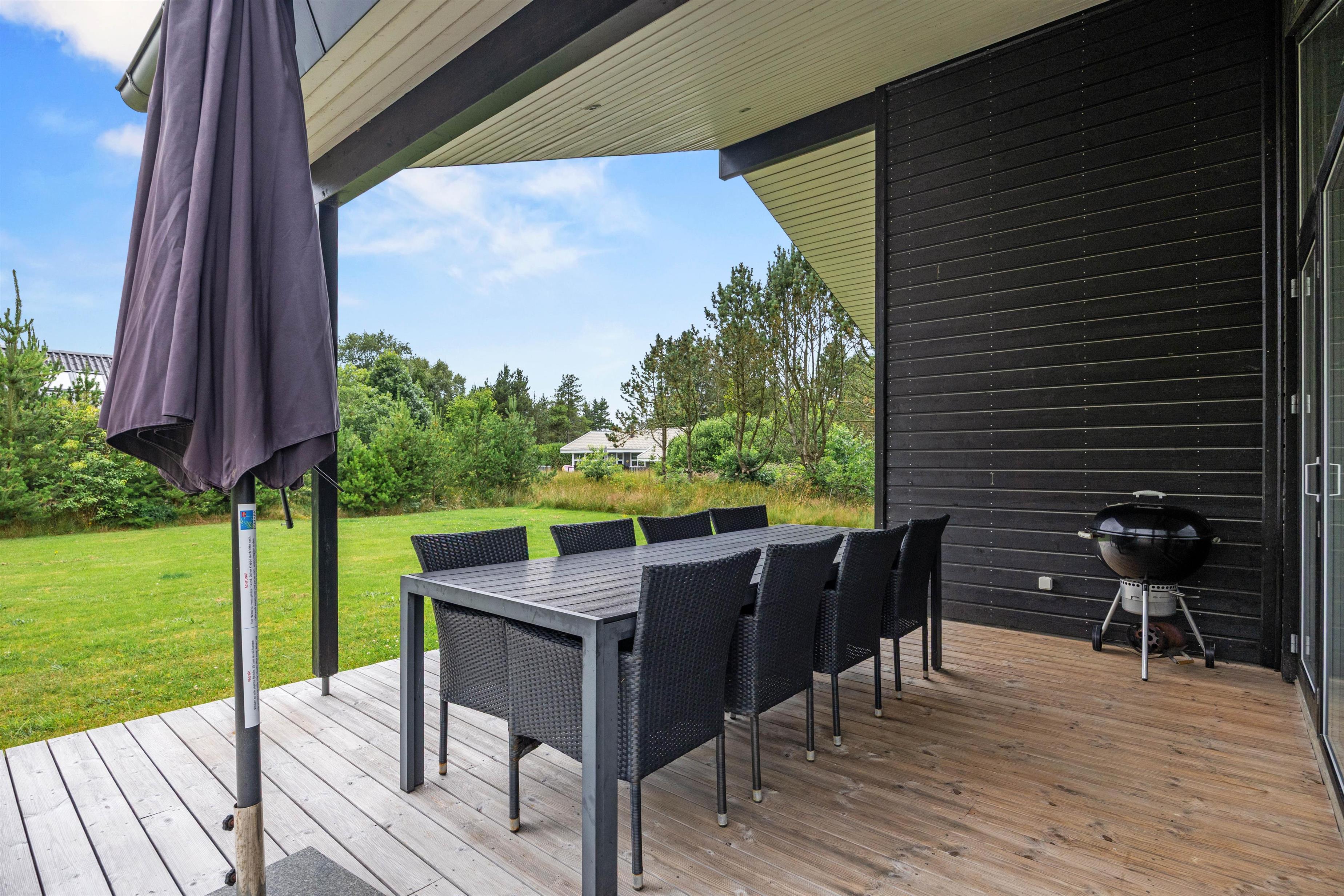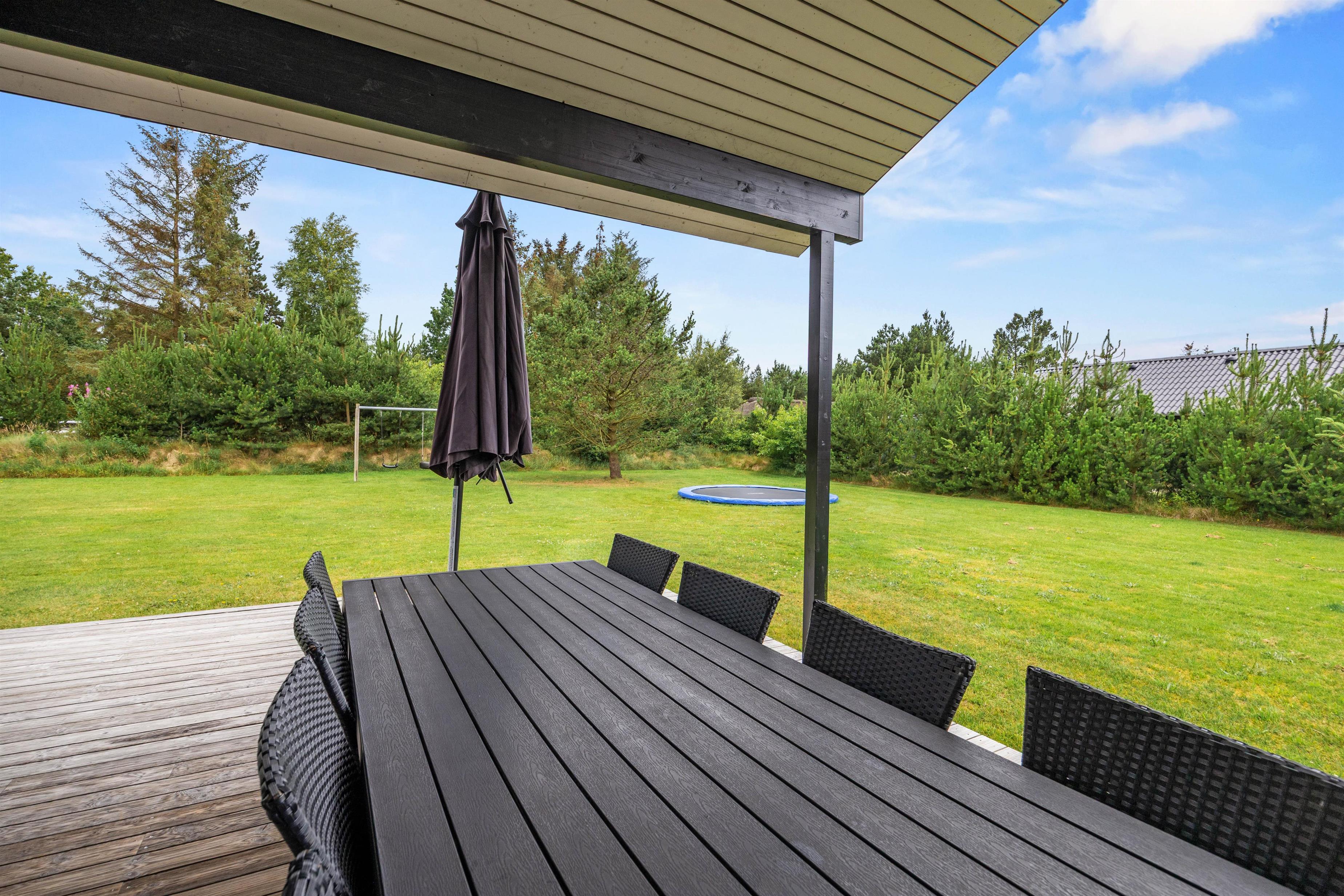 De store vinduespartier giver masser af lysindfald og altid en dejlig udsigt over naturgrunden. Fra husets stue er der udgang til en skøn til dels overdækket terrasse. Det er dejligt nemt at åbne op og forbinde ude med inde og få lukket den skønne friske luft ind, - en dejlig blanding af hav, lynghede og nåletræer. På terrassen kan der hygges hele dagen på solvognen og om aftenen er der mulighed for at tænde op i grillen og i læ af udhænget sidde sammen og hygge indtil stjernerne titter frem på himlen.