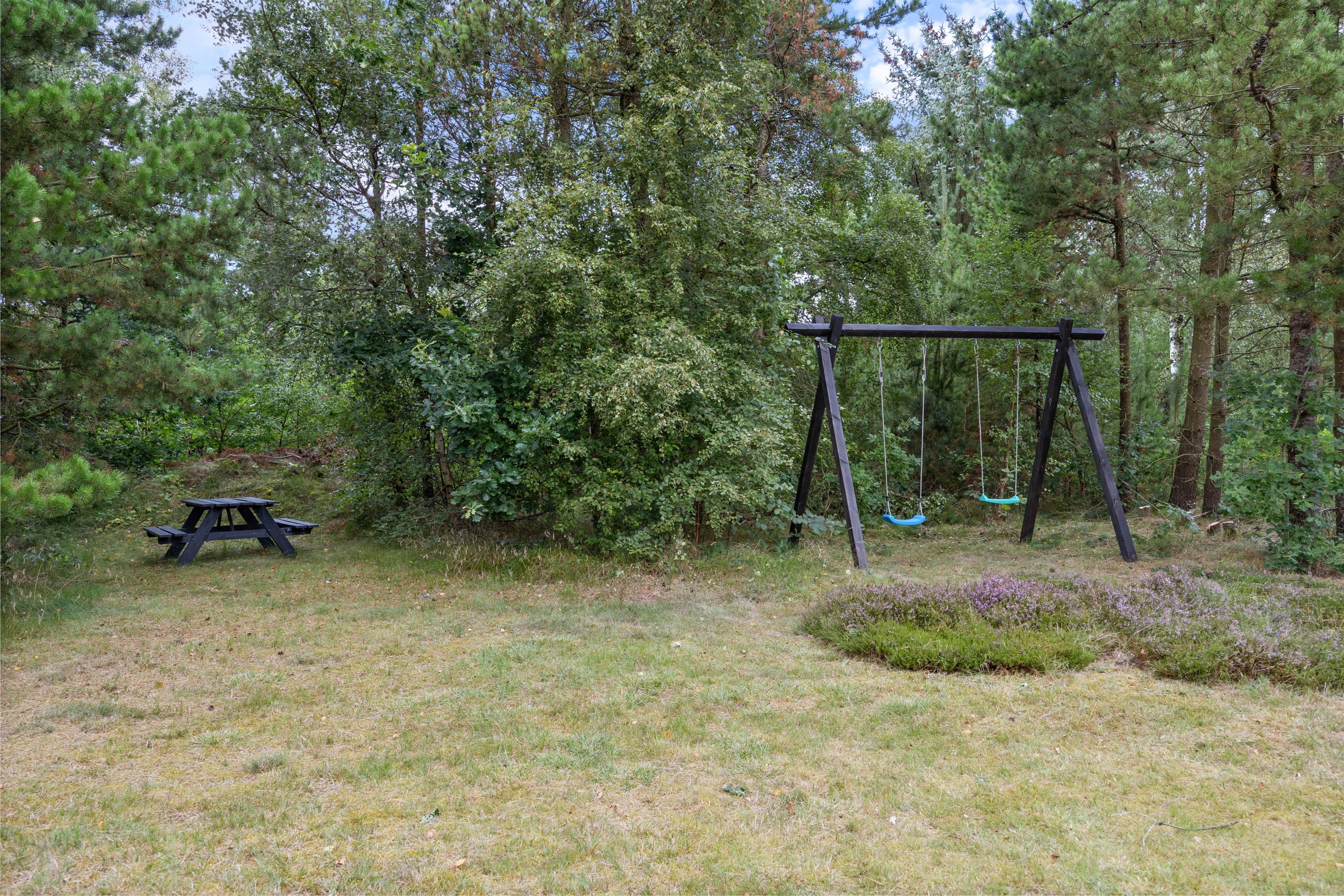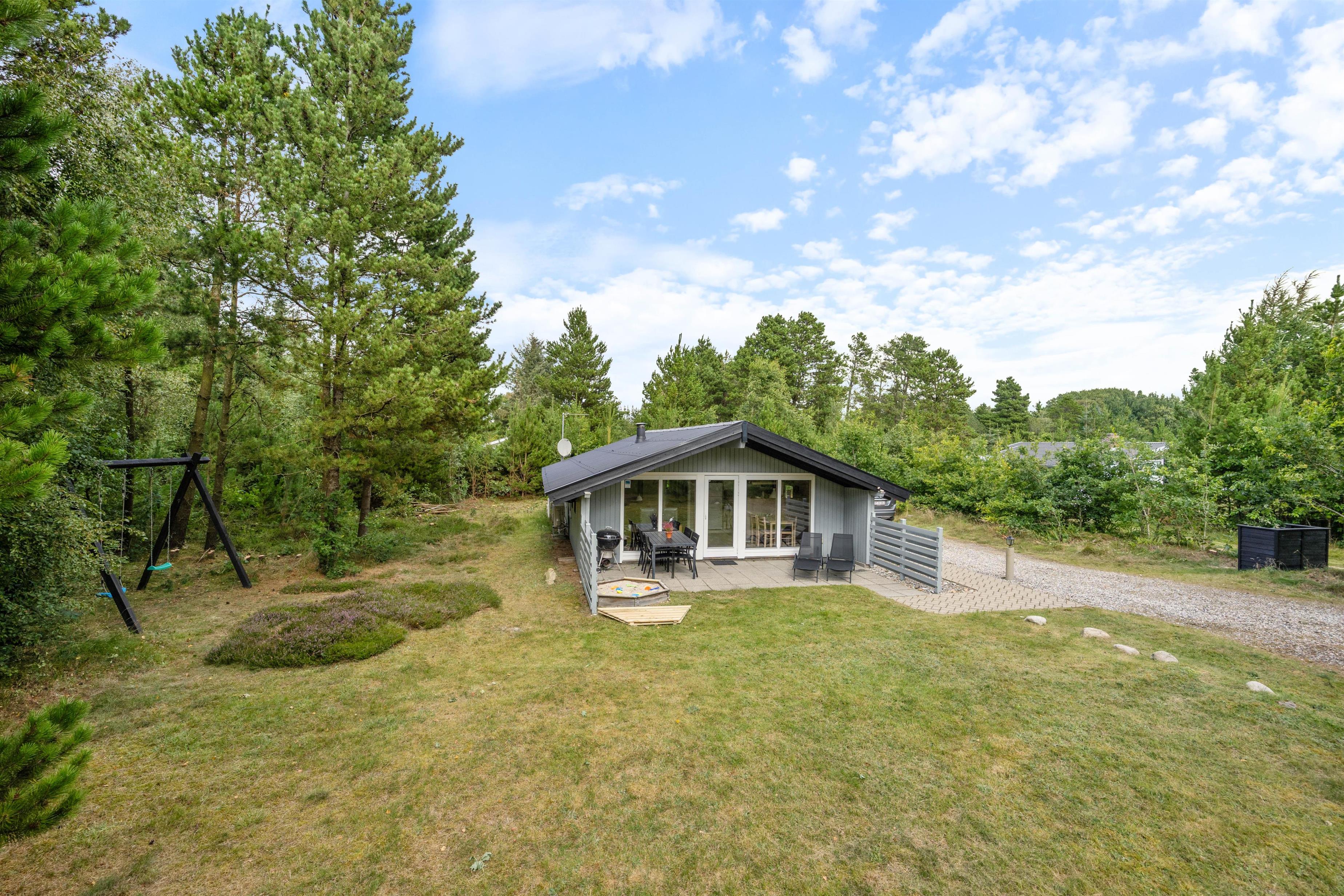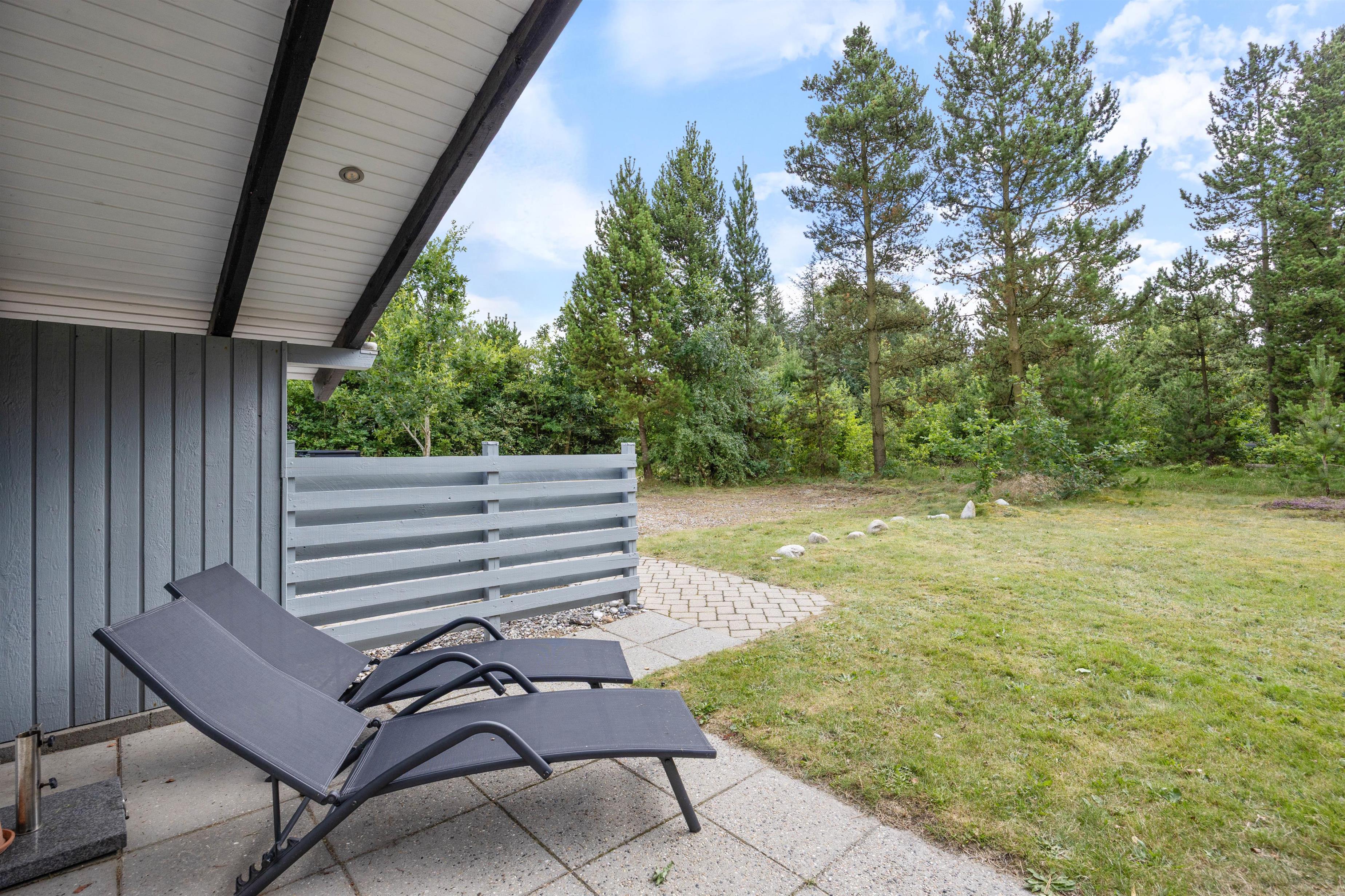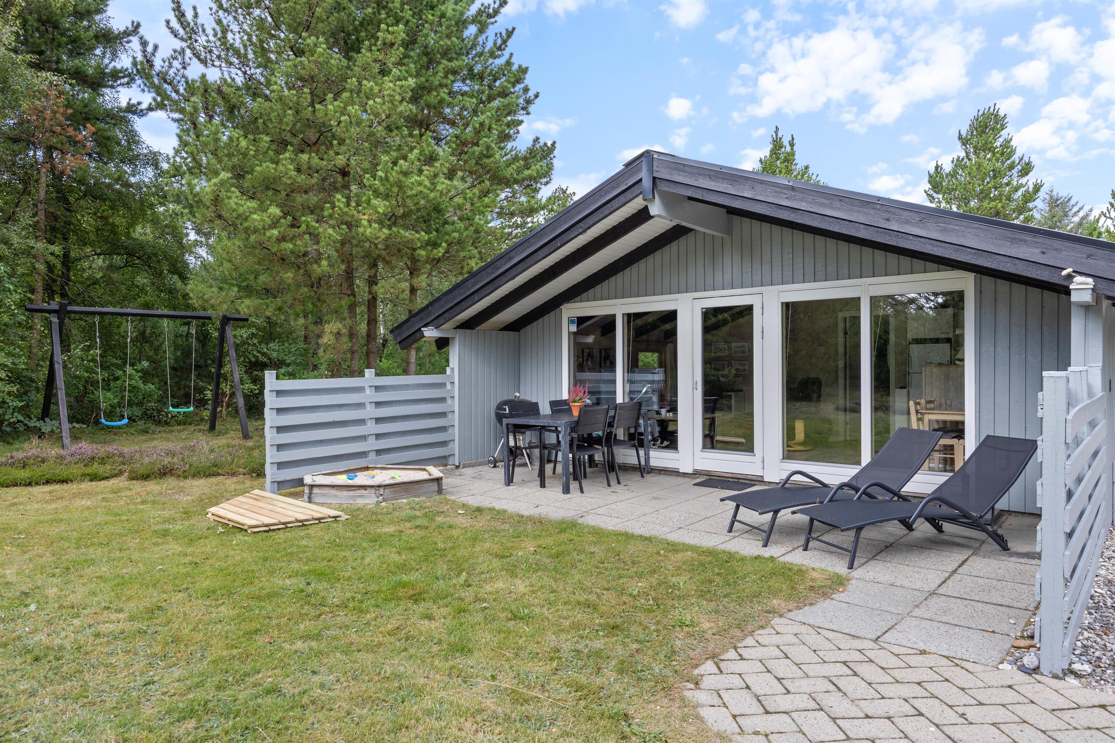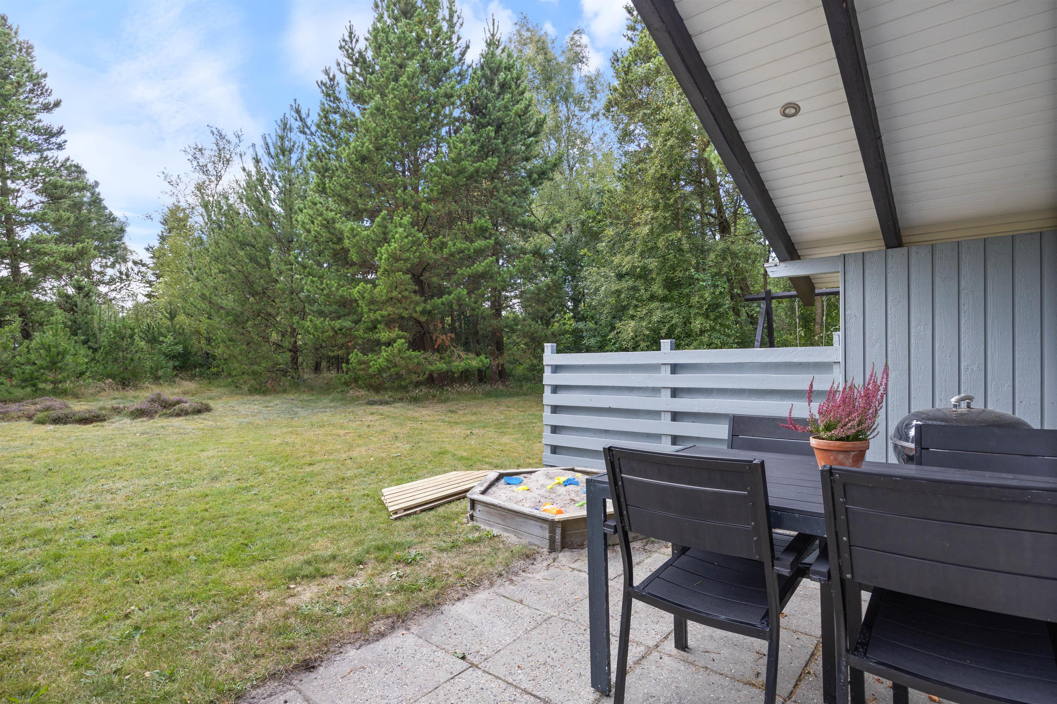 Når solen skinner, kan I tage solsengene ud på terrassen og nyde varmen. Mens I ligger og slapper af, kan børnene lege ude på græsset, hvor der også er en sandkasse samt et gyngestativ.