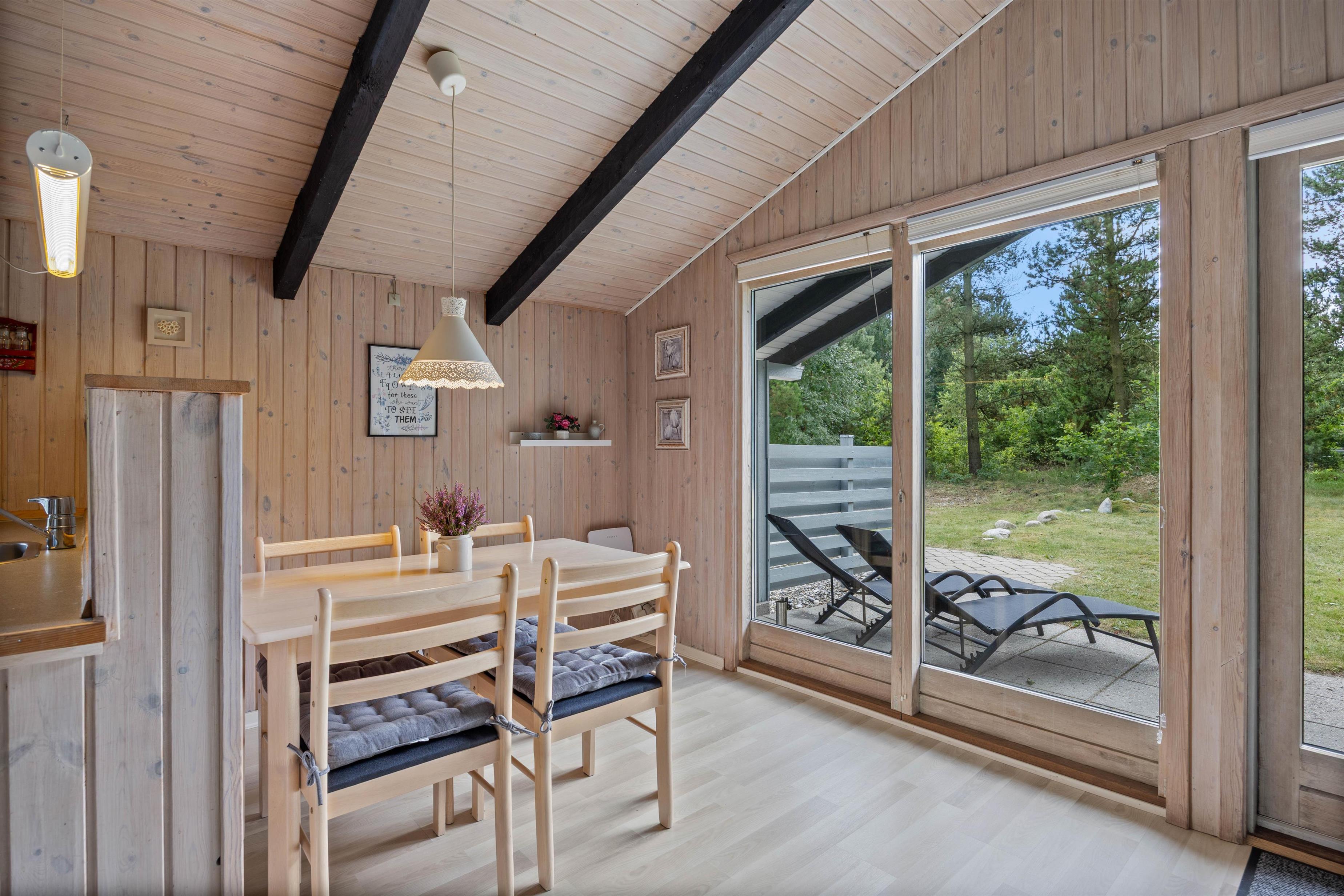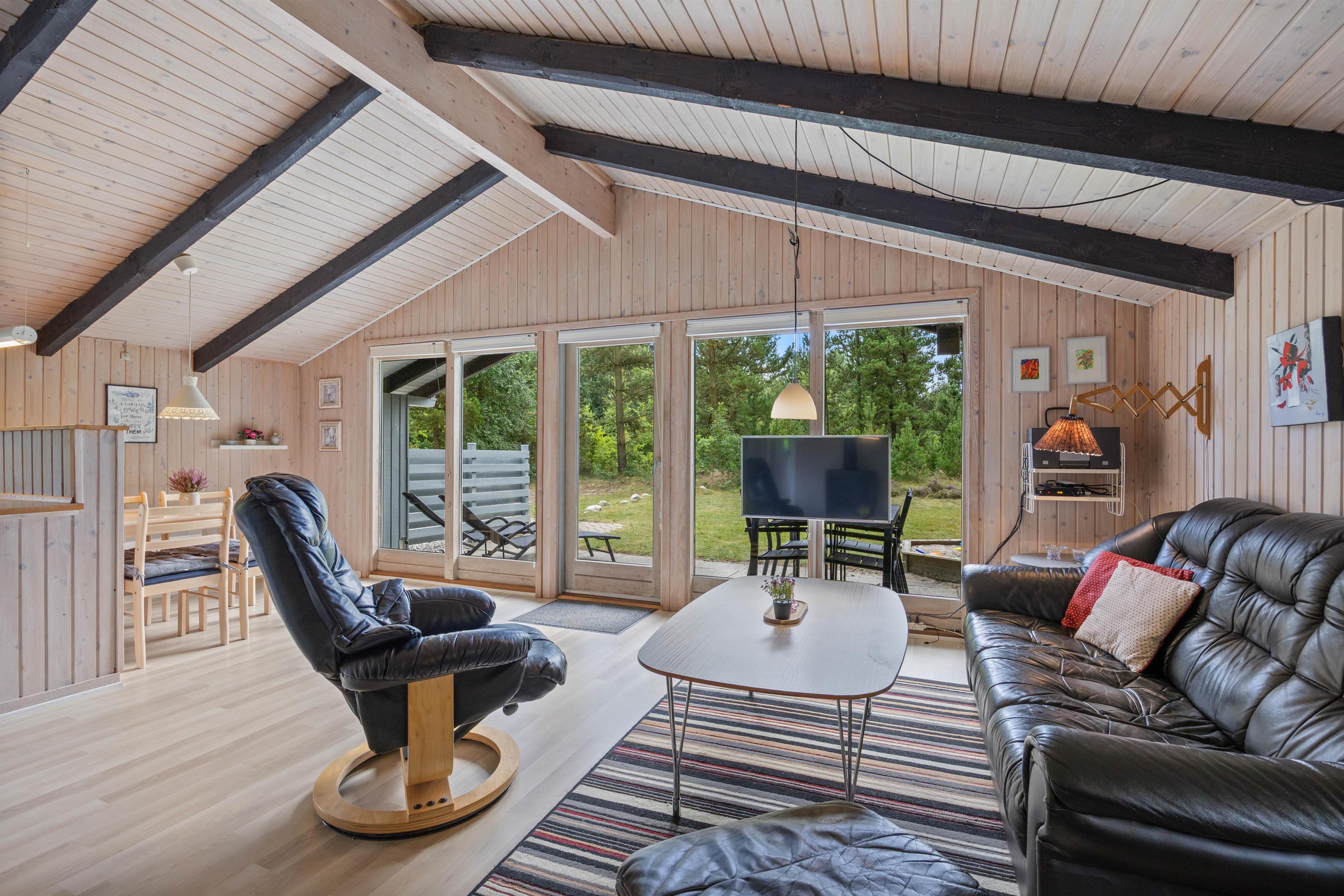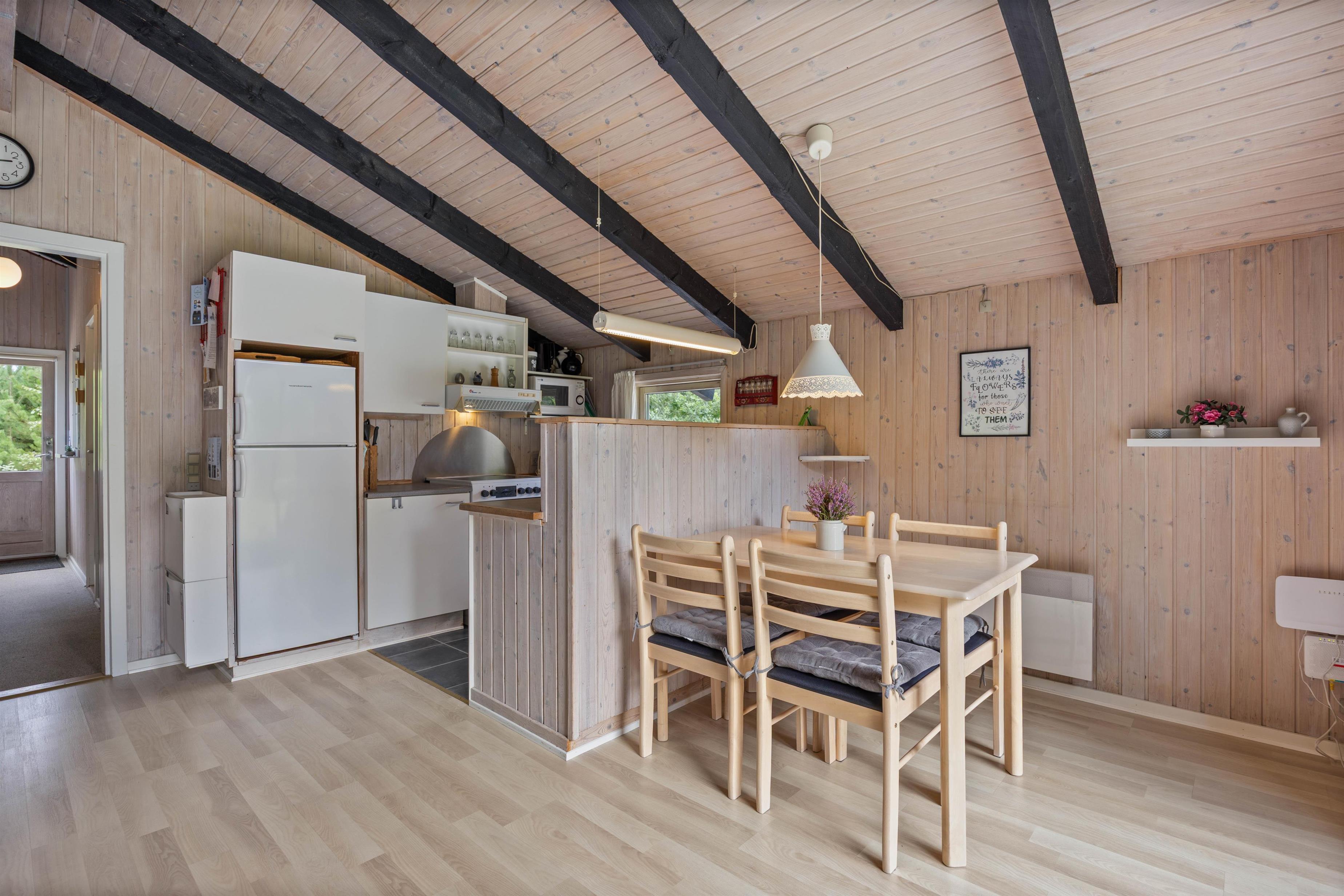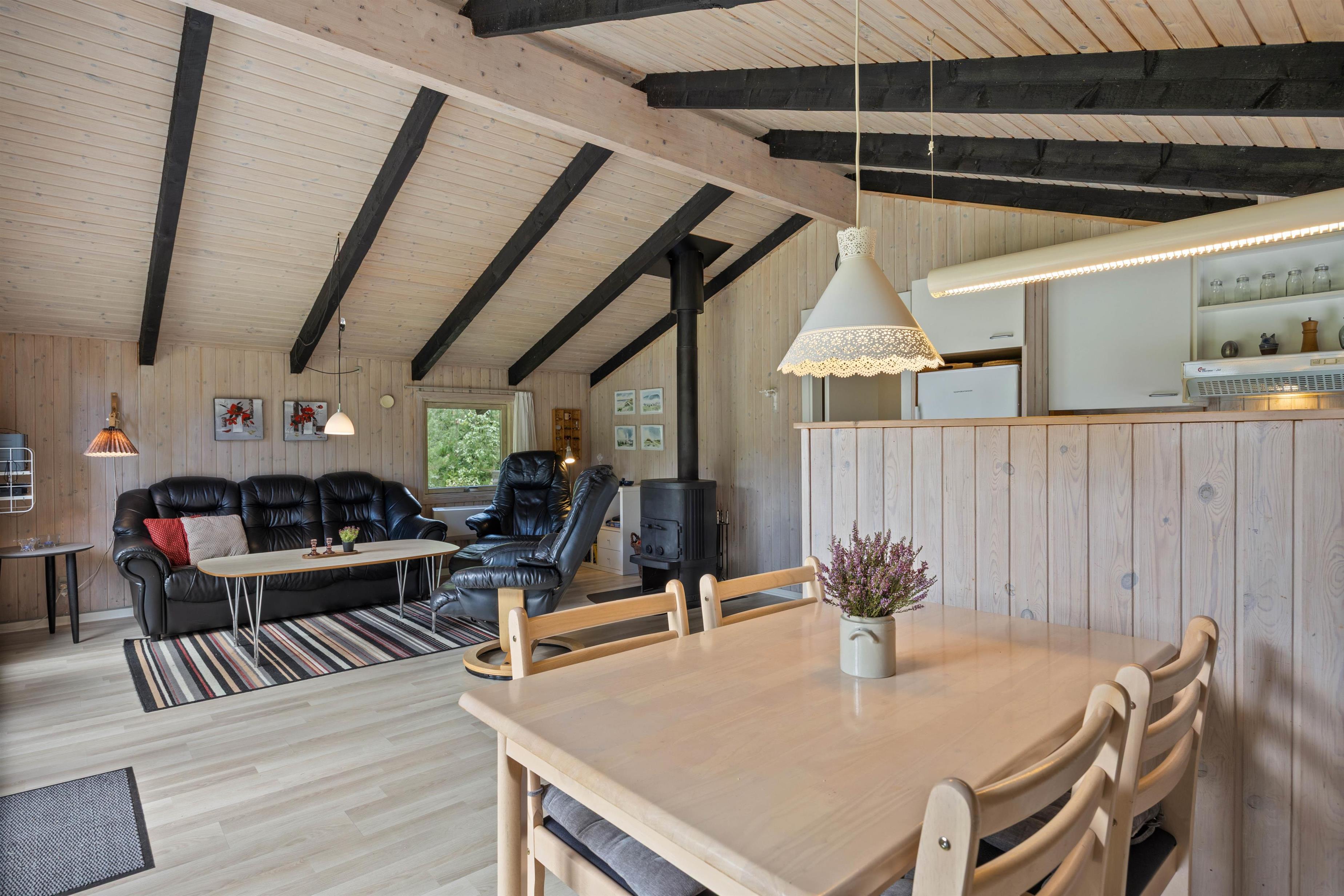 Feriehuset er lyst indrettet og med de sorte loftsbjælker, som går igen i hele huset, opnår det en hyggelig steming, som man kender fra et klassisk dansk feriehus.